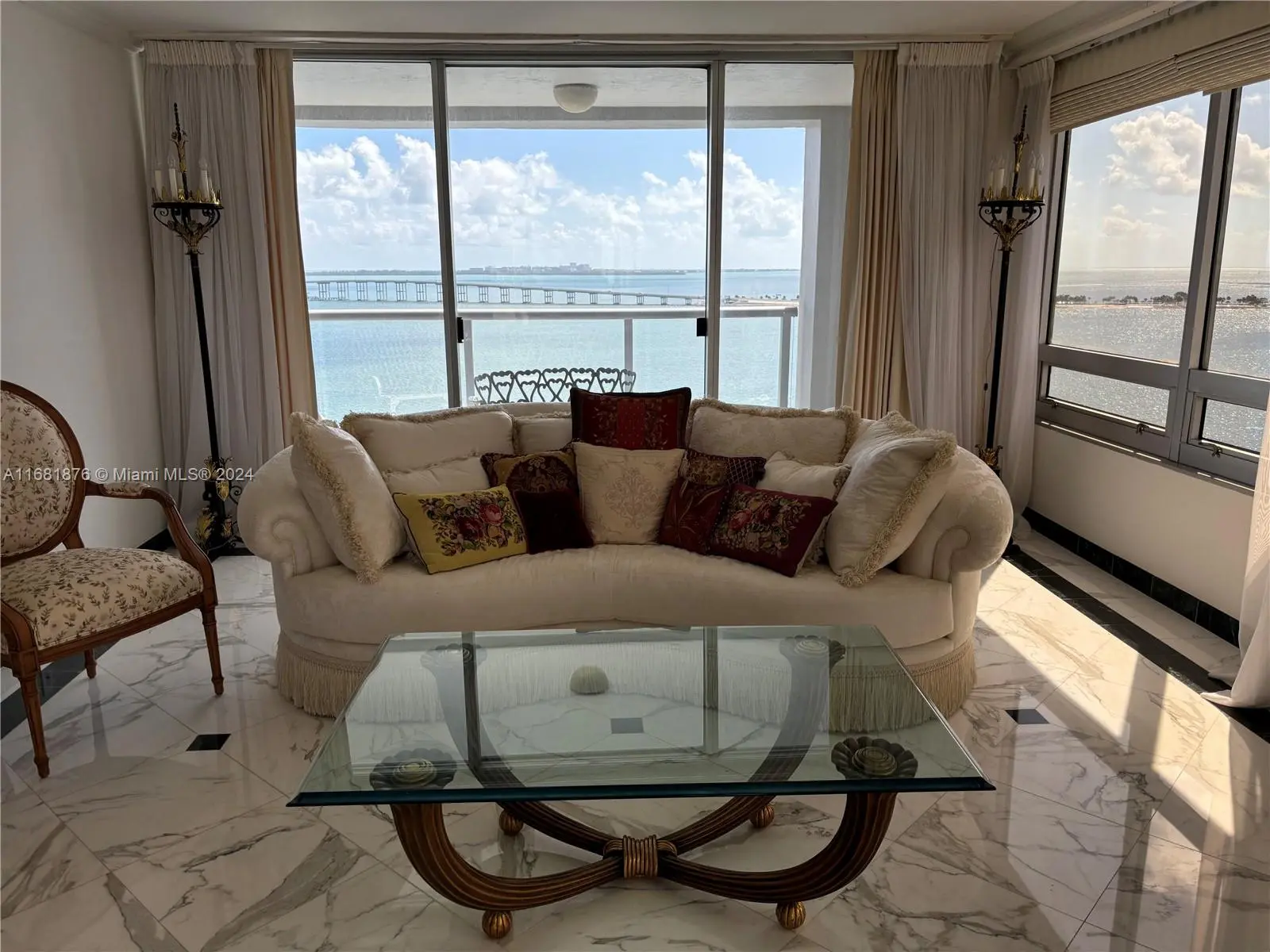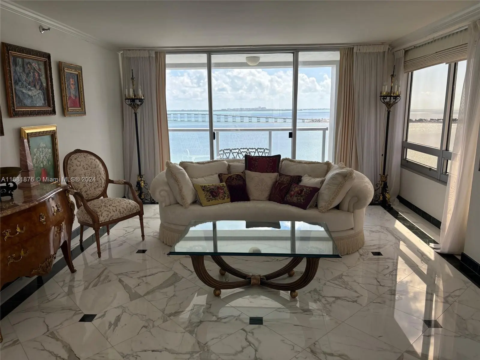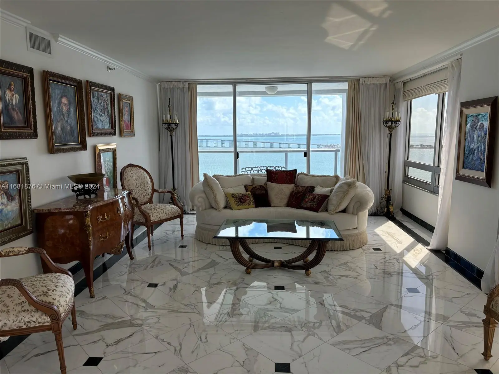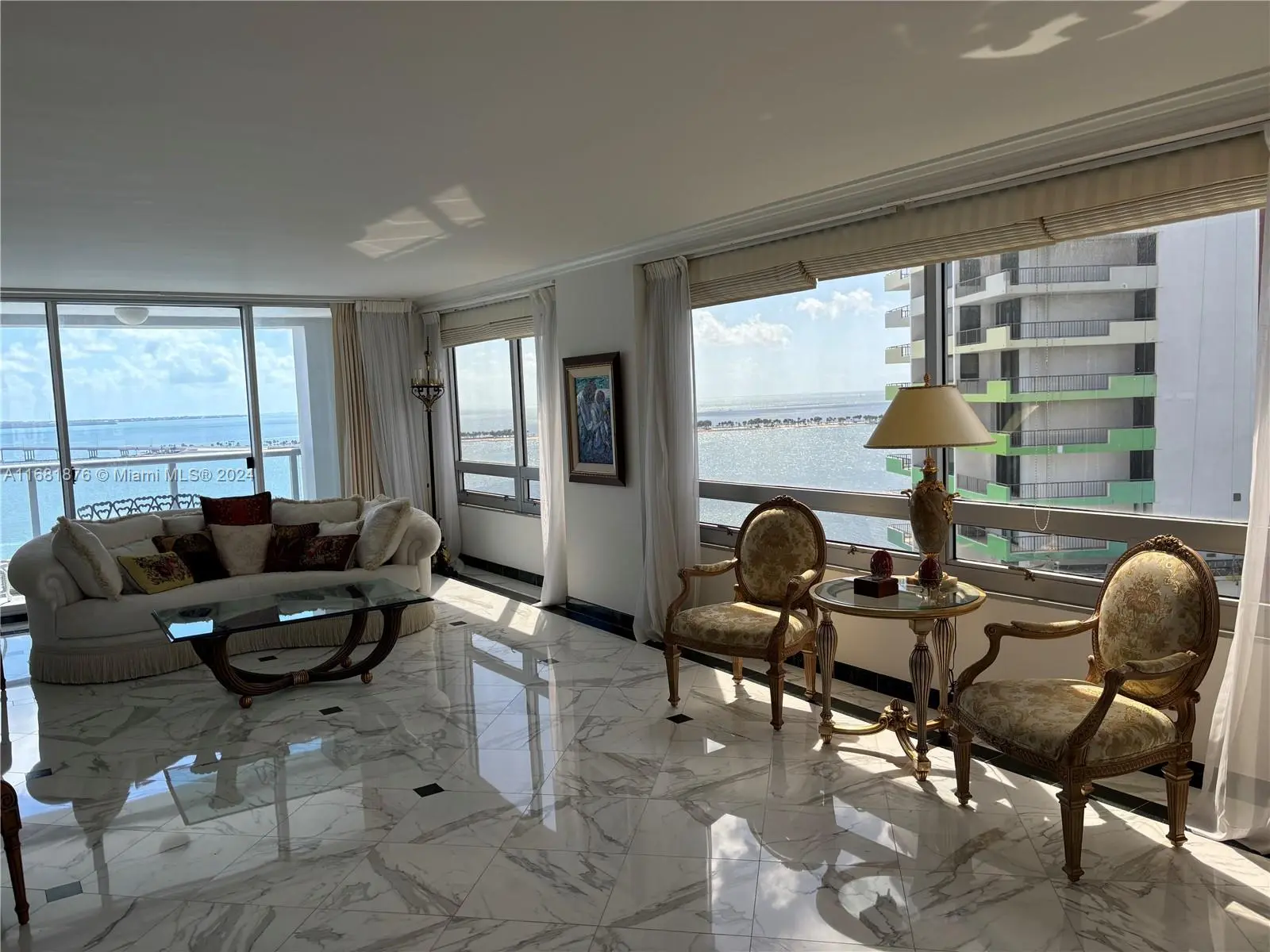 Elegance, quality, comfort and 240-degree views, describe this property. Watch the sun rise over Biscayne Bay from your master bedroom, balcony or living room, then watch as the sun sets over the city from your kitchen, balcony or dining room. View Brickell Avenue and all its splendor. Imported marble floors throughout. Modern kitchen with imported MiaCucina cabinetry, pantry and quartz counter tops. Bathrooms totally updated with imported porcelain floors and walls. Gold plated fixtures. Master Bath with jetted shower/tub. Master bedroom with two closets. Enter through the private elevator stop into the elegant foyer into the natural light brightness of the living area showcasing the splendor of the beautiful marble floors and window curtains. Unit comes with 2 contiguous parking spaces.