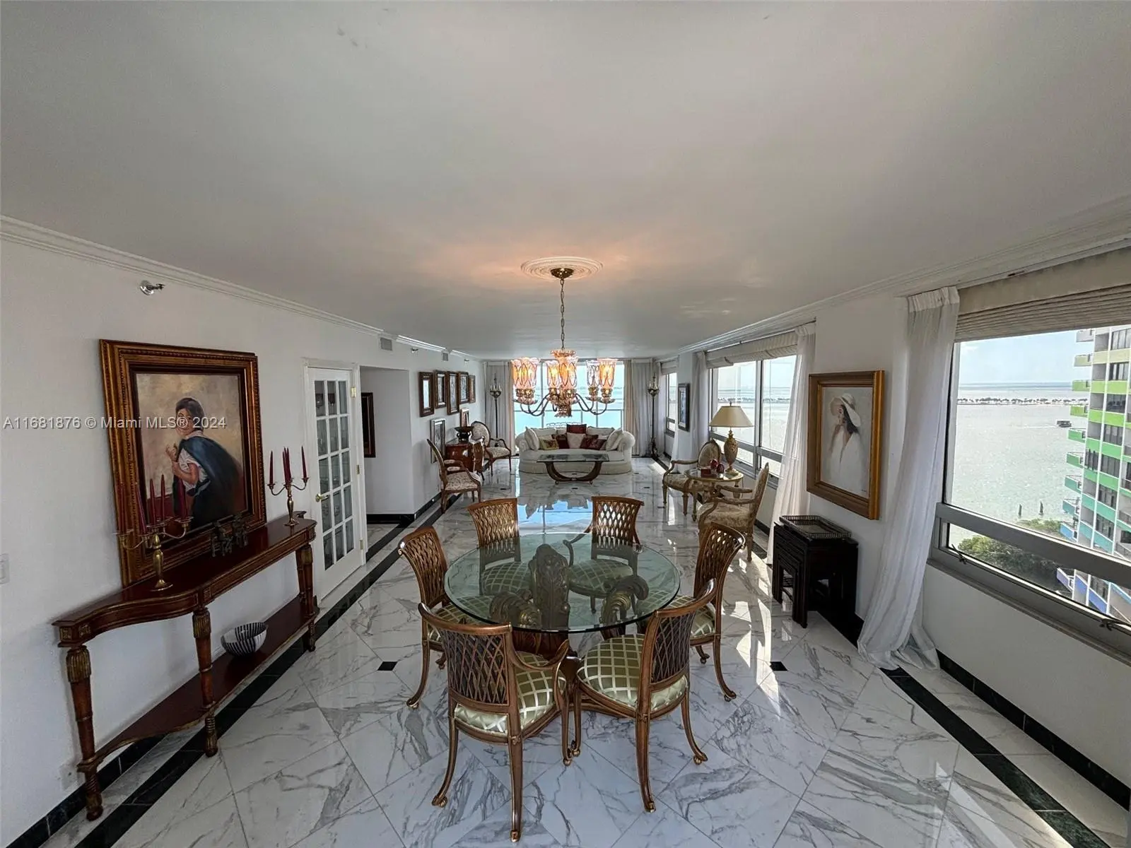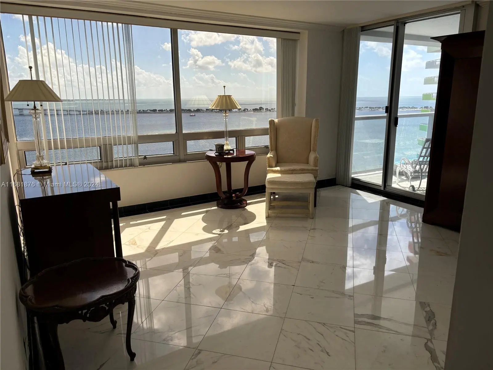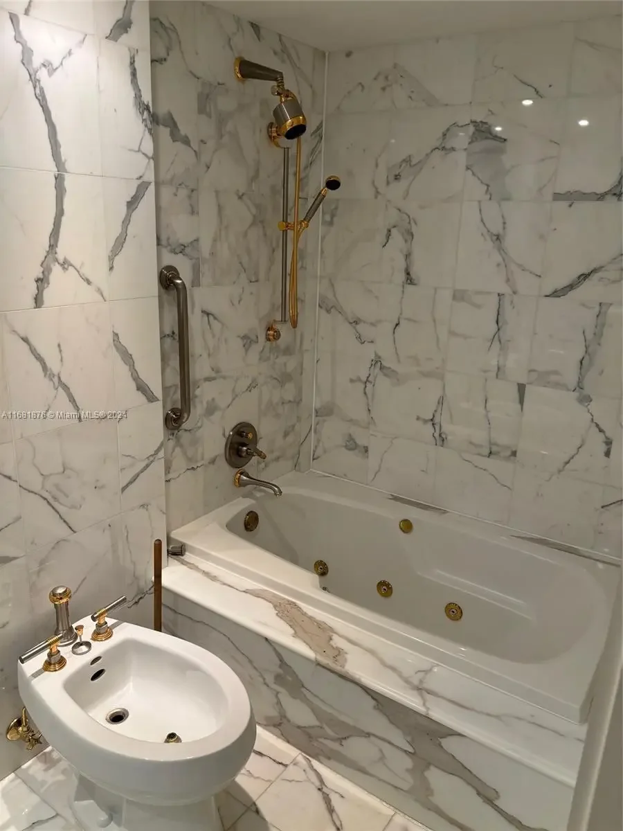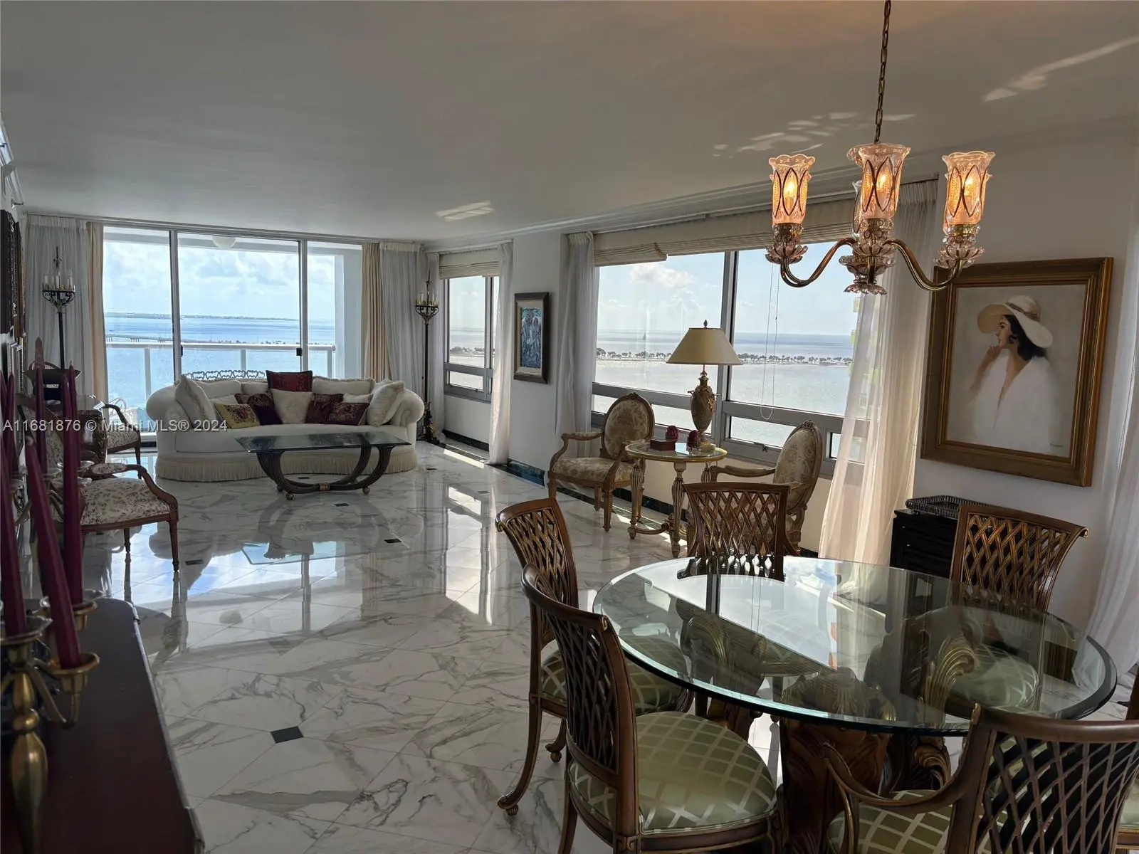 Elegance, quality, comfort and 240-degree views, describe this property. Watch the sun rise over Biscayne Bay from your master bedroom, balcony or living room, then watch as the sun sets over the city from your kitchen, balcony or dining room. View Brickell Avenue and all its splendor. Imported marble floors throughout. Modern kitchen with imported MiaCucina cabinetry, pantry and quartz counter tops. Bathrooms totally updated with imported porcelain floors and walls. Gold plated fixtures. Master Bath with jetted shower/tub. Master bedroom with two closets. Enter through the private elevator stop into the elegant foyer into the natural light brightness of the living area showcasing the splendor of the beautiful marble floors and window curtains. Unit comes with 2 contiguous parking spaces.