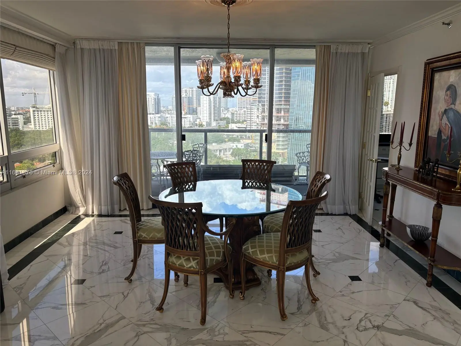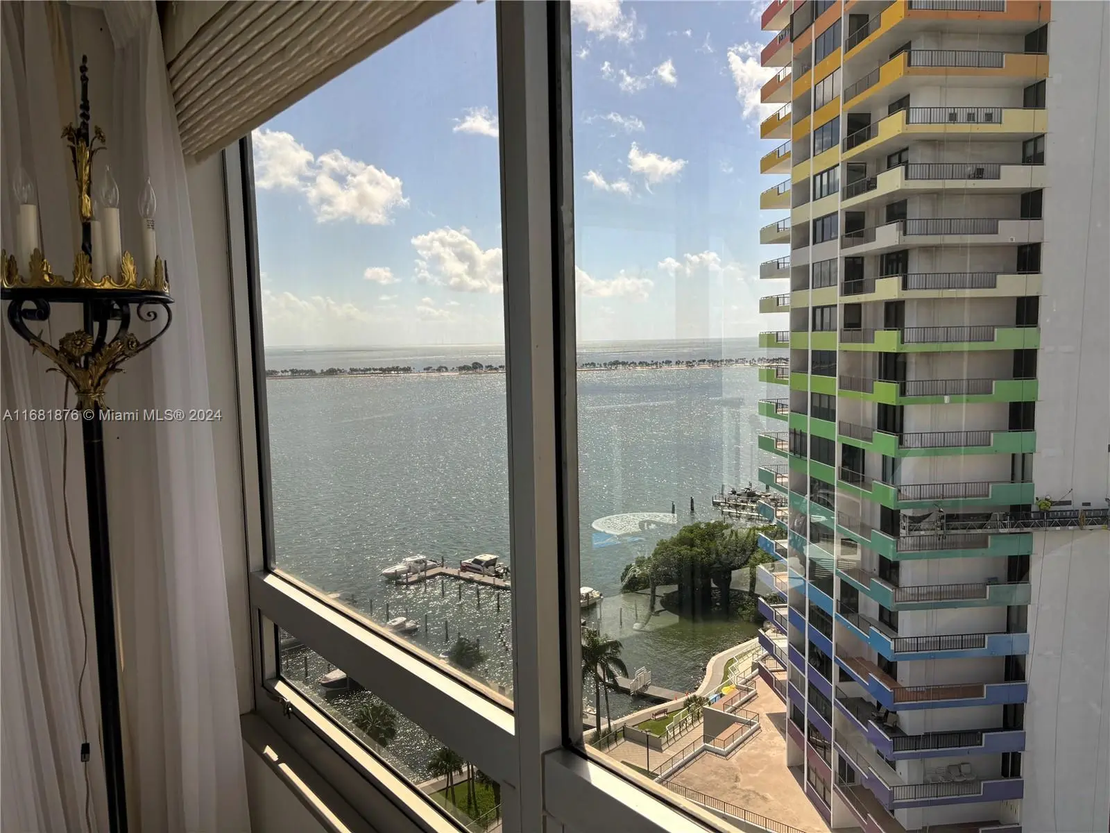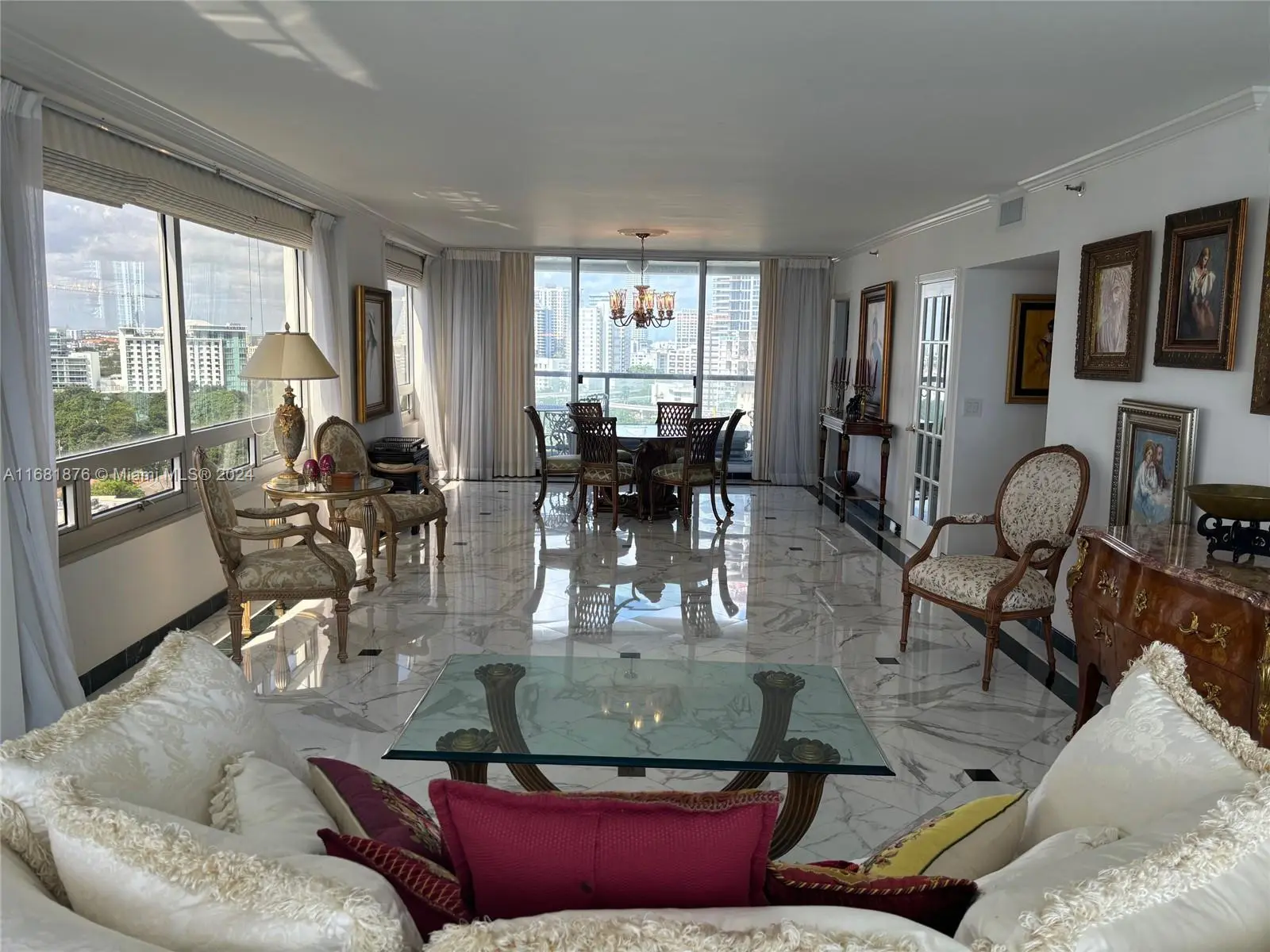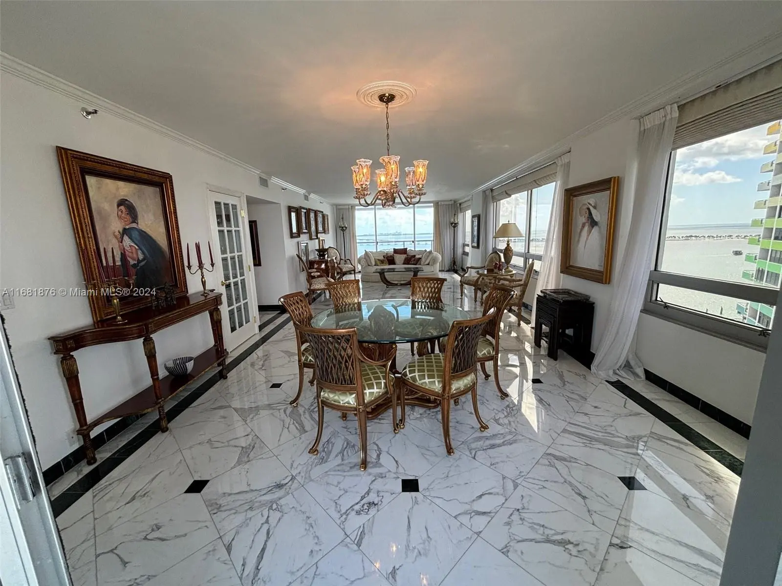 Elegance, quality, comfort and 240-degree views, describe this property. Watch the sun rise over Biscayne Bay from your master bedroom, balcony or living room, then watch as the sun sets over the city from your kitchen, balcony or dining room. View Brickell Avenue and all its splendor. Imported marble floors throughout. Modern kitchen with imported MiaCucina cabinetry, pantry and quartz counter tops. Bathrooms totally updated with imported porcelain floors and walls. Gold plated fixtures. Master Bath with jetted shower/tub. Master bedroom with two closets. Enter through the private elevator stop into the elegant foyer into the natural light brightness of the living area showcasing the splendor of the beautiful marble floors and window curtains. Unit comes with 2 contiguous parking spaces.