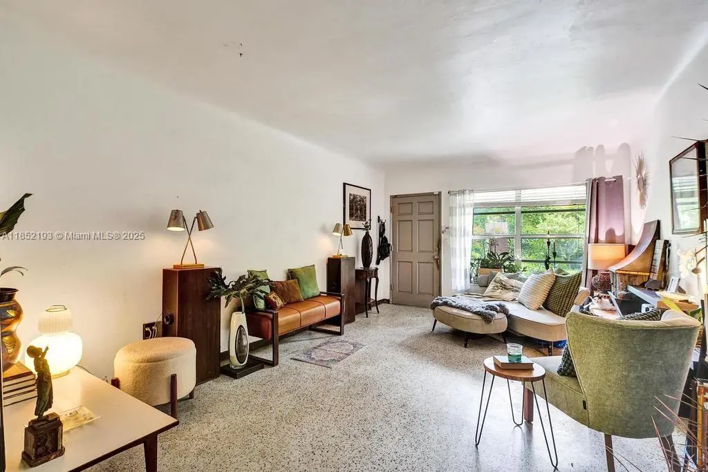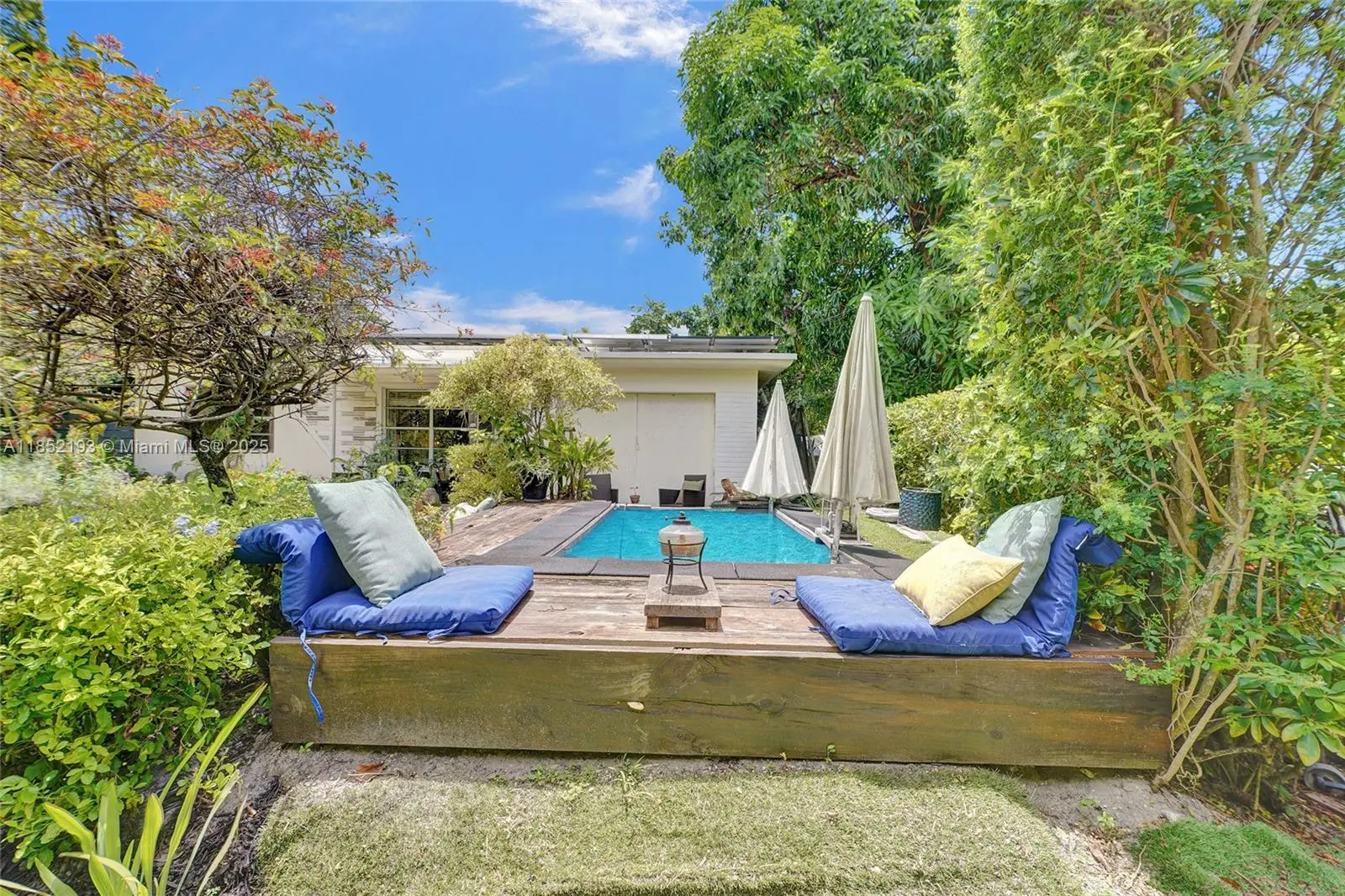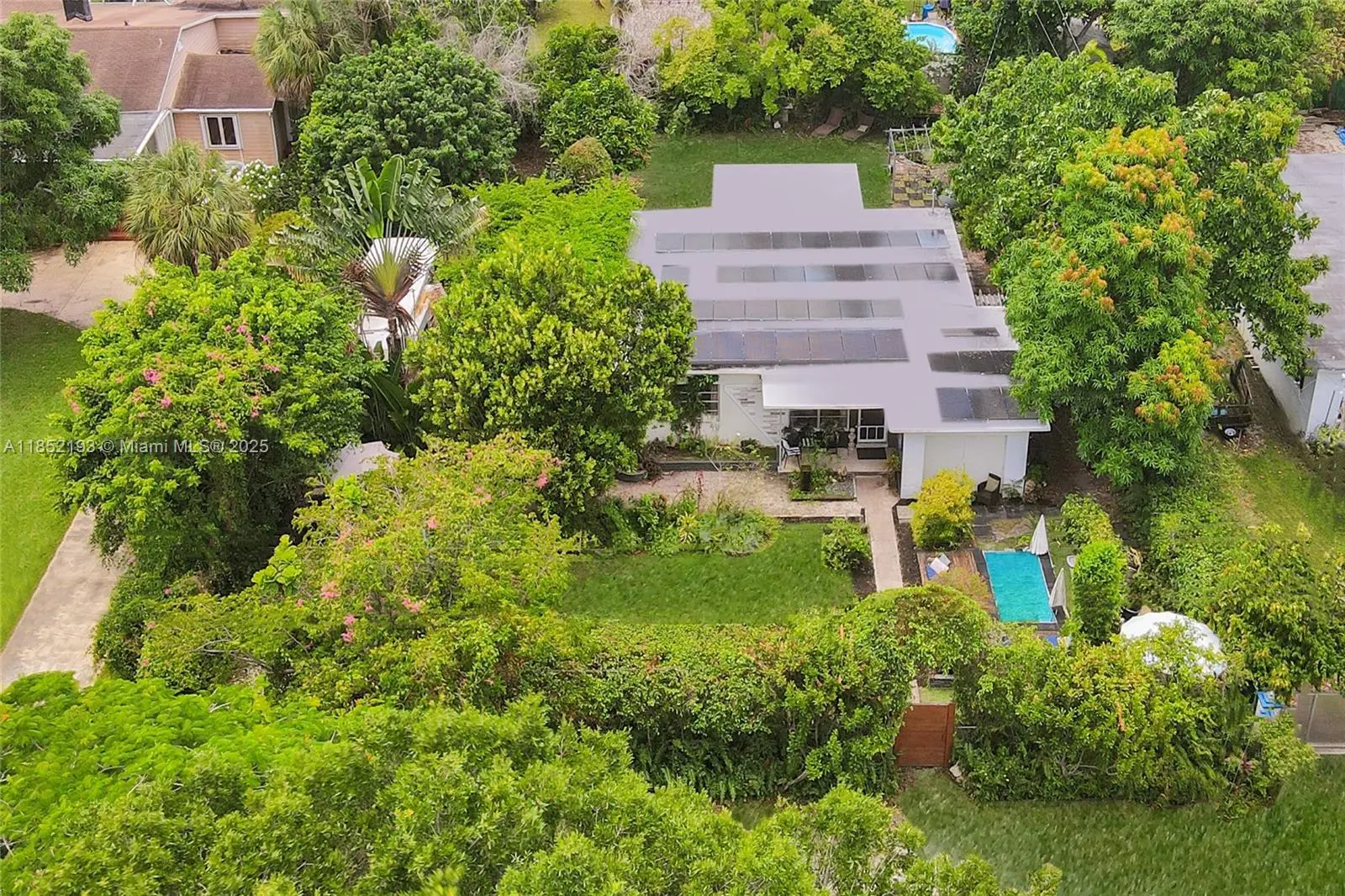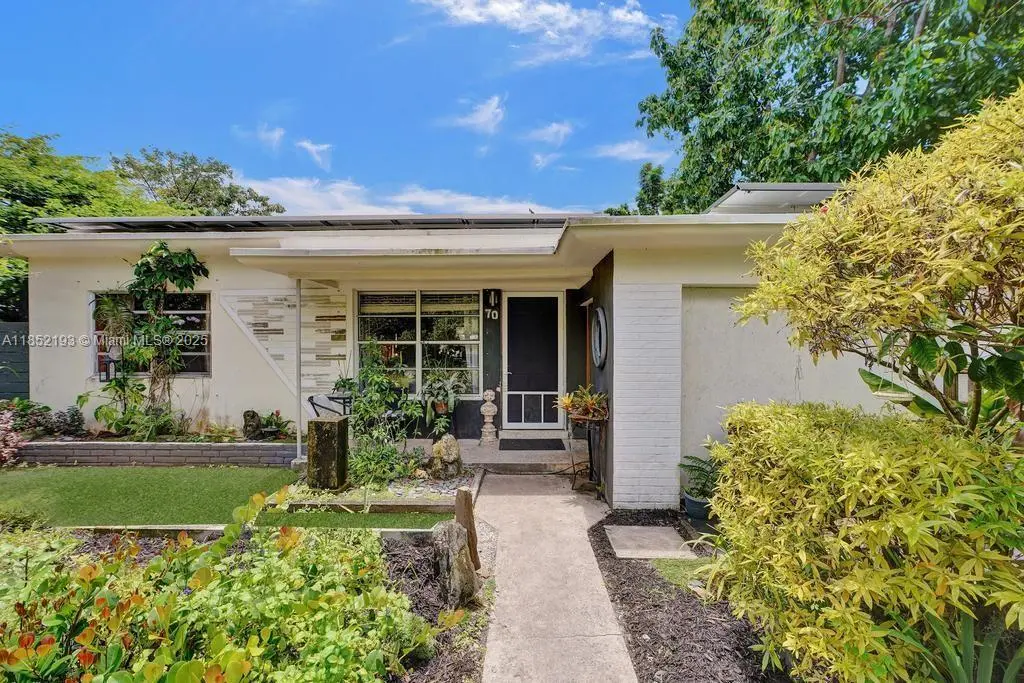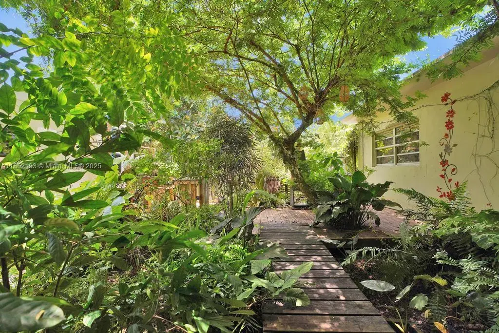 Lush mid-century 2BR/1BA+ large garage on oversized lot in quiet, flood-free Miami enclave. Immersed in a hand-planted butterfly, bee & bird sanctuary w/15+ mature edible trees incl. mango, lychee, macadamia, avocado, starfruit & bay leaf. Privacy—green views from every window, no shades needed! Solar panels, terrazzo flrs, vintage Cuban tile & cedar-beamed ceiling. Cocktail pool. Yoga deck, meditation path, Japanese garden & screened Orchid House ideal for guests. Expansive front feels like a private park perfect for entertaining. Extra drvwy fits RV/boat w/ W+E—rental/income potential. Skylit kitchen, scullery/mini kitchen, cozy guest BR & airy porch. Former wellness retreat w/room for permaculture or dream pool. Rare opportunity to own serene green space just mins from city action