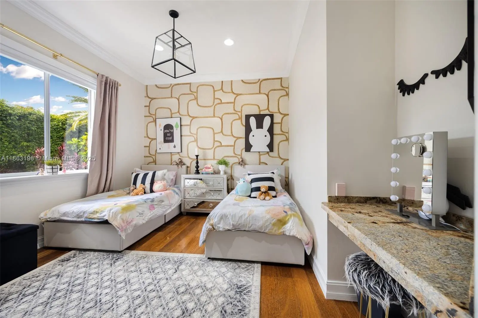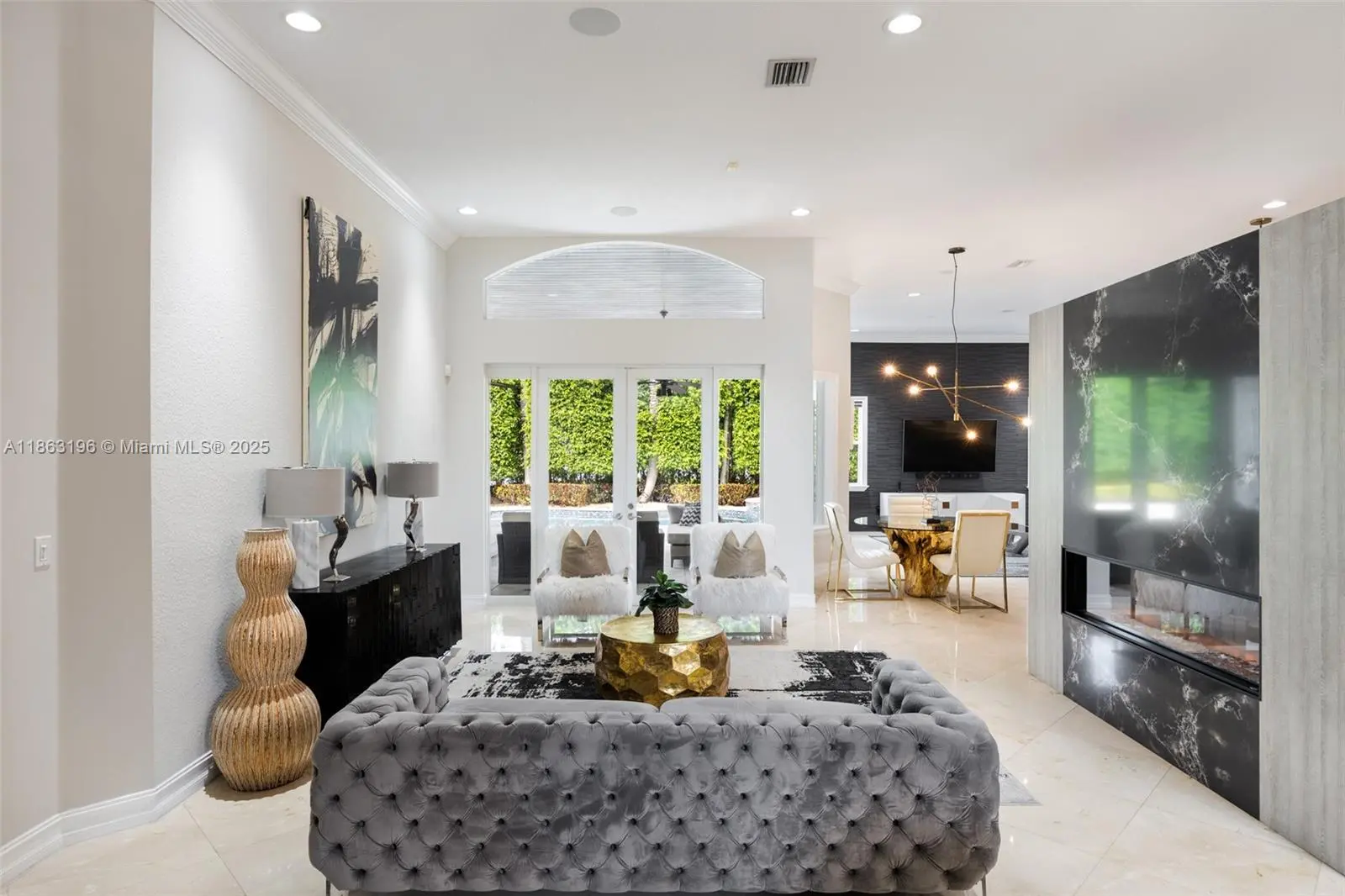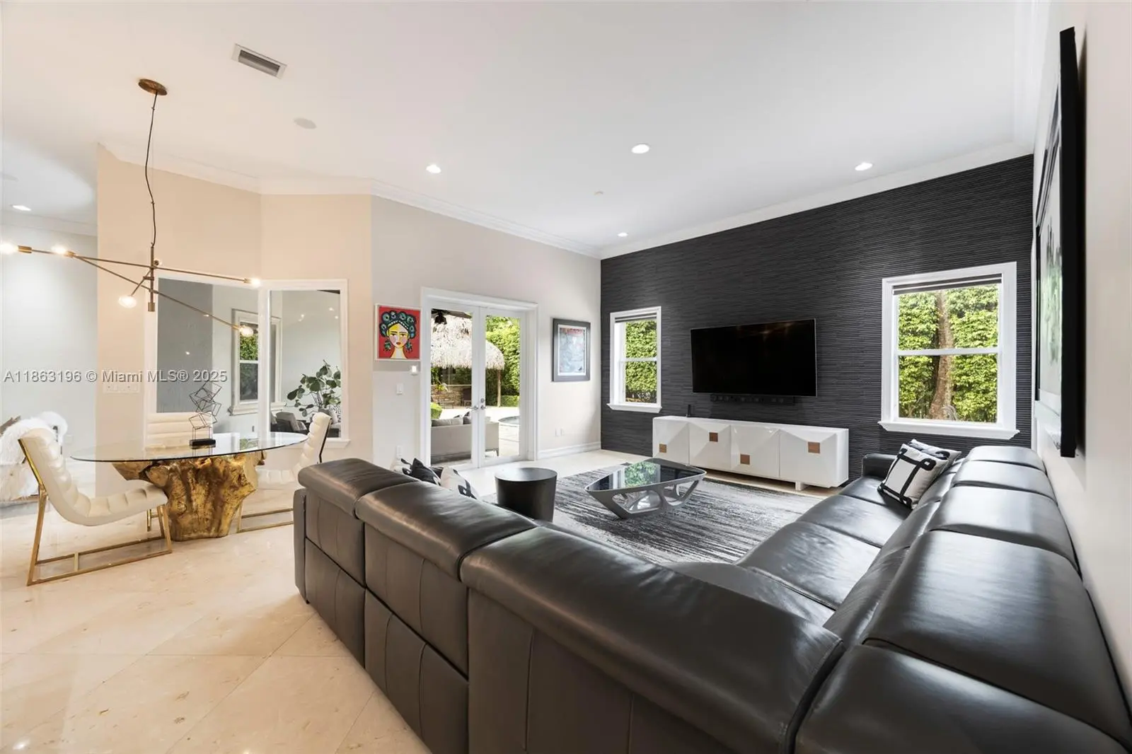 Custom elegance on almost a half-acre lot off of Sunset Drive. 9445 SW 68 Street offers 3,600 square feet of single-story living with 6 bedrooms, 3.5 baths and soaring 13-ft ceilings. A chef's kitchen with wood cabinetry, granite counters and stainless appliances opens to marble-floored living spaces and hardwood bedrooms, all with custom closets. The gated property features a circular drive, 2-car garage, resort-style pool and tiki hut with bar - perfect for entertaining. Built in 2001 and meticulously maintained and renovated, this home blends comfort, privacy and Miami style in a prime location.