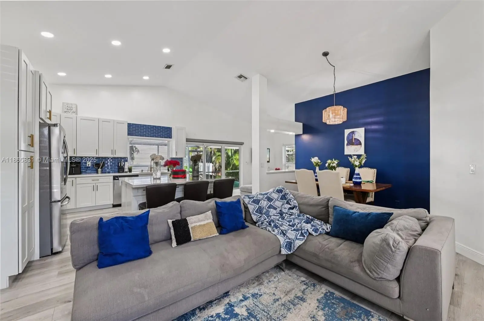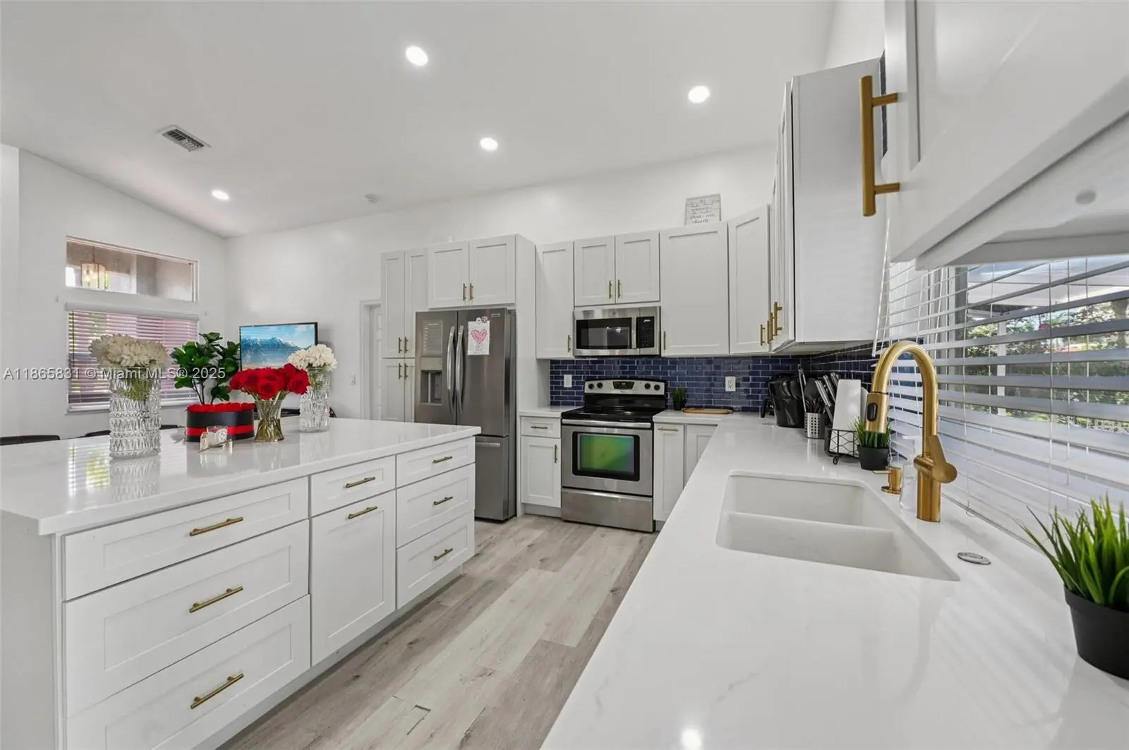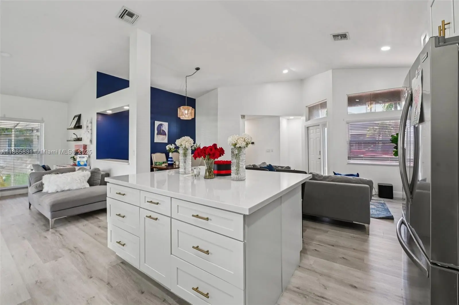 Beautifully remodeled 3BR/2BA home with an open floorplan, vaulted ceilings, LED lighting, pale gray laminate flooring, remote blinds, and impact windows/doors. The custom white kitchen features shaker cabinets, marble quartz counters, and stainless steel appliances. Luxurious master suite includes dual walk-in closets, custom double vanity, porcelain tile, and a spacious walk-in double shower. Guest bath offers a custom vanity with tub/shower combo. Enjoy Florida living in the screened enclosed patio with composite deck, perfect for entertaining. Backyard boasts a lush lawn with mature mango and avocado trees. Conveniently close to schools, shopping, dining, and major highways—comfort and convenience in one!