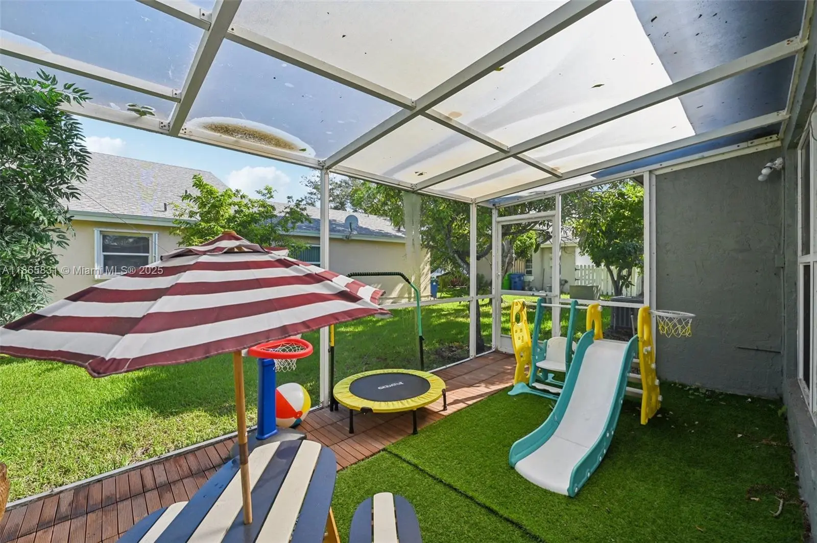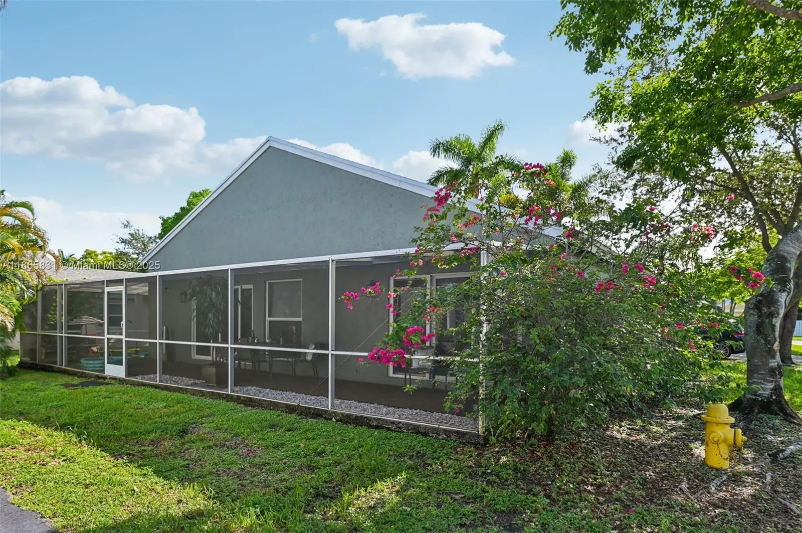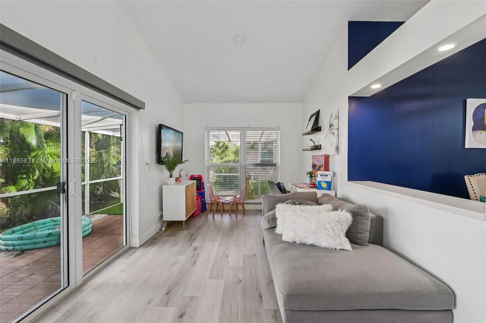 Beautifully remodeled 3BR/2BA home with an open floorplan, vaulted ceilings, LED lighting, pale gray laminate flooring, remote blinds, and impact windows/doors. The custom white kitchen features shaker cabinets, marble quartz counters, and stainless steel appliances. Luxurious master suite includes dual walk-in closets, custom double vanity, porcelain tile, and a spacious walk-in double shower. Guest bath offers a custom vanity with tub/shower combo. Enjoy Florida living in the screened enclosed patio with composite deck, perfect for entertaining. Backyard boasts a lush lawn with mature mango and avocado trees. Conveniently close to schools, shopping, dining, and major highways—comfort and convenience in one!