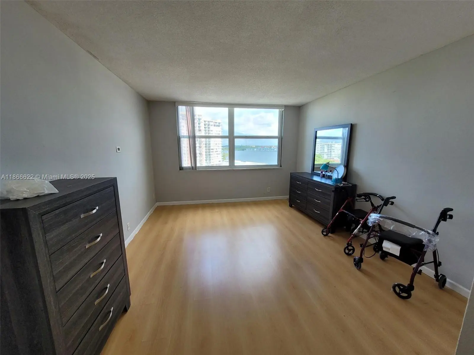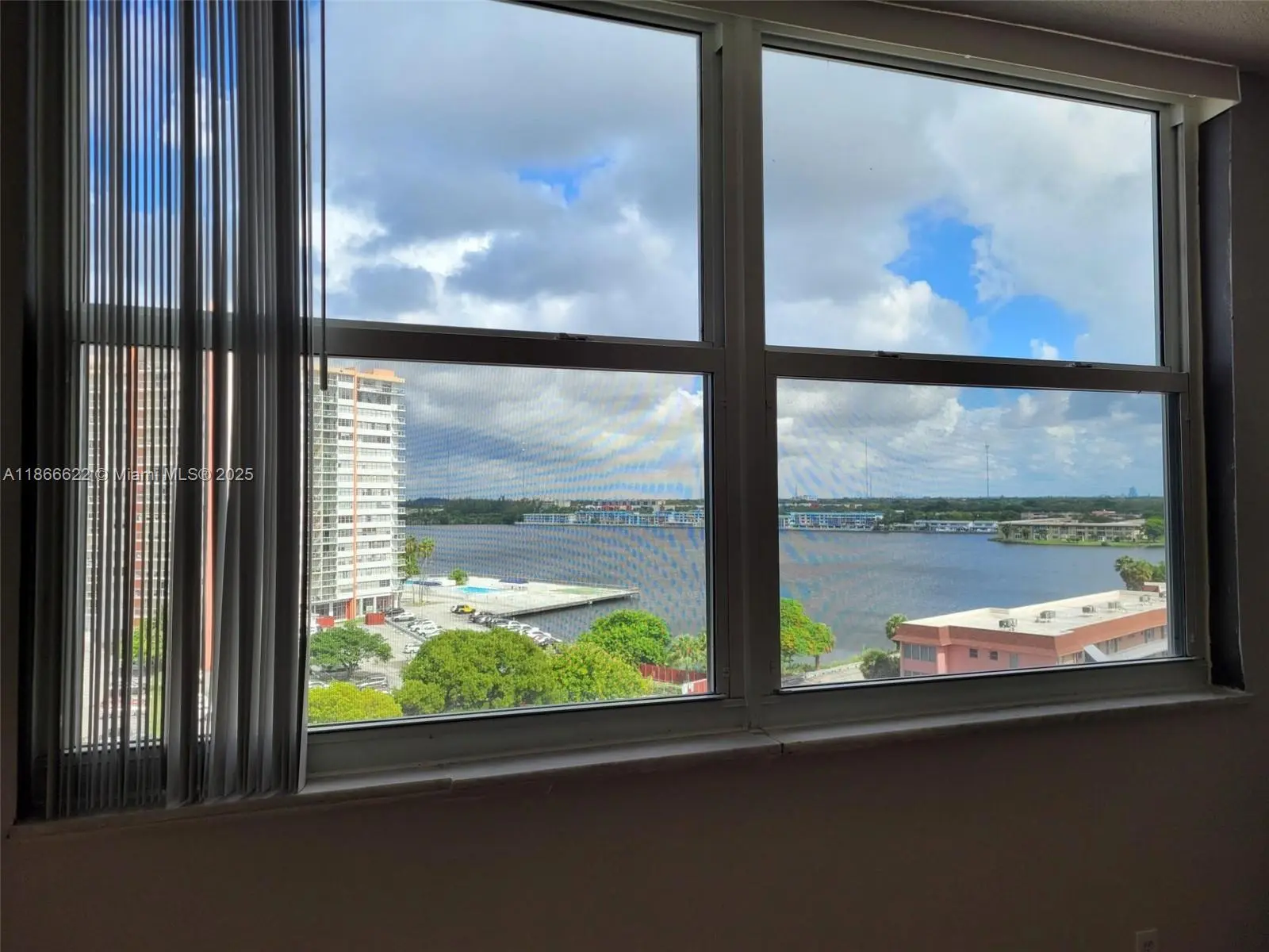Spacious 921 SQ FT, 1 bedroom/1.5 bathroom condo is situated on the 9th floor in a peaceful and sought-after 55+ community just west of Aventura. Features: impact windows, stainless steel kitchen appliances, ample closet space, and a large balcony with tranquil lake views, complete with shutters for weather protection, redone half bathroom, and laminate floors throughout. The community offers 2 heated pools, a fitness center, sauna, and a clubhouse. Conveniently located near houses of worship, Publix, shopping, dining, hospitals, and major highways. Includes 1 assigned parking spot and plenty of guest parking. Maintenance covers water, basic cable, trash. Laundry room on every floor. The building is well-maintained with low HOA fees. Under 55 allowed if one resident is 55+. NO ASSESSMENT