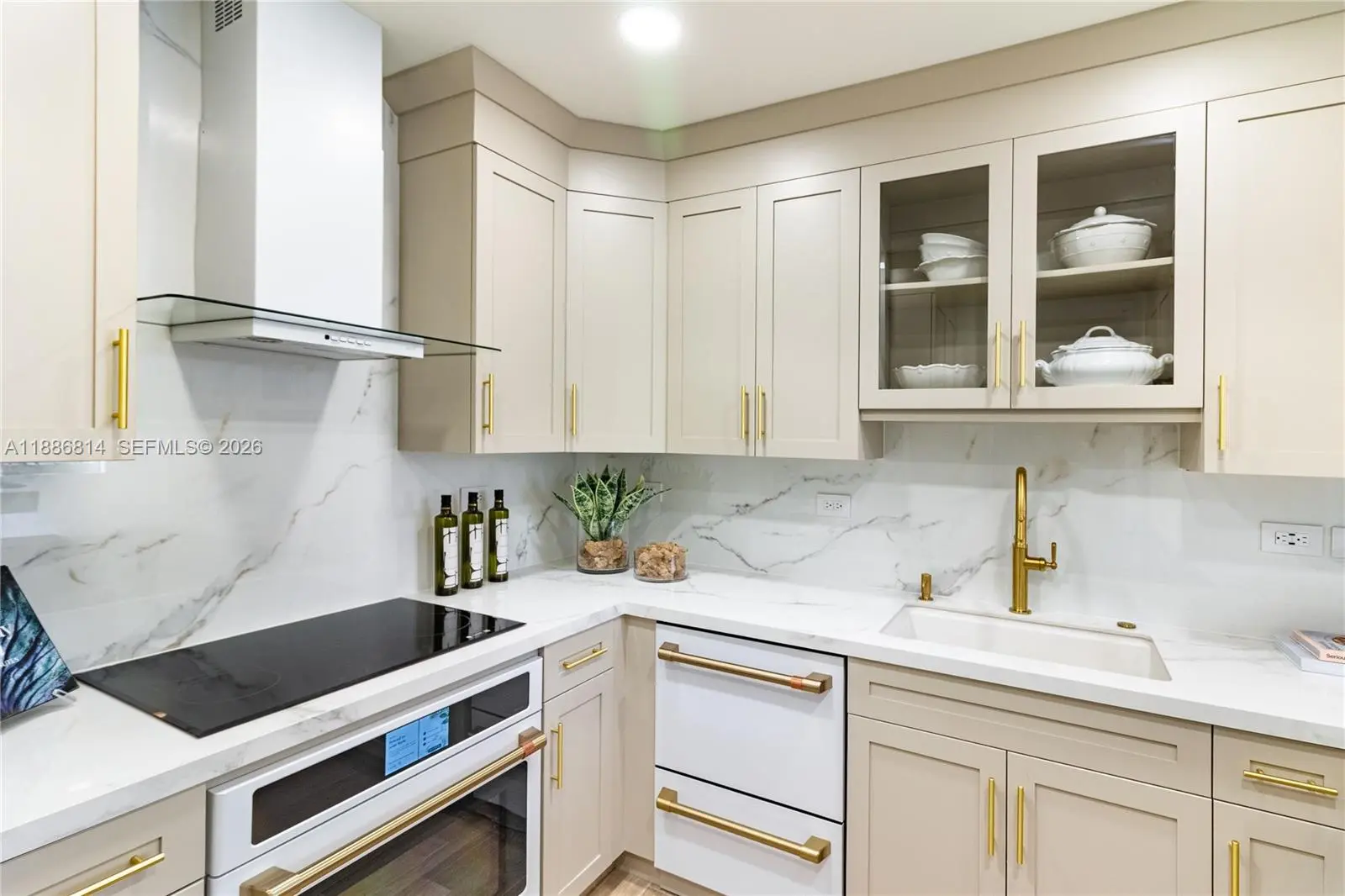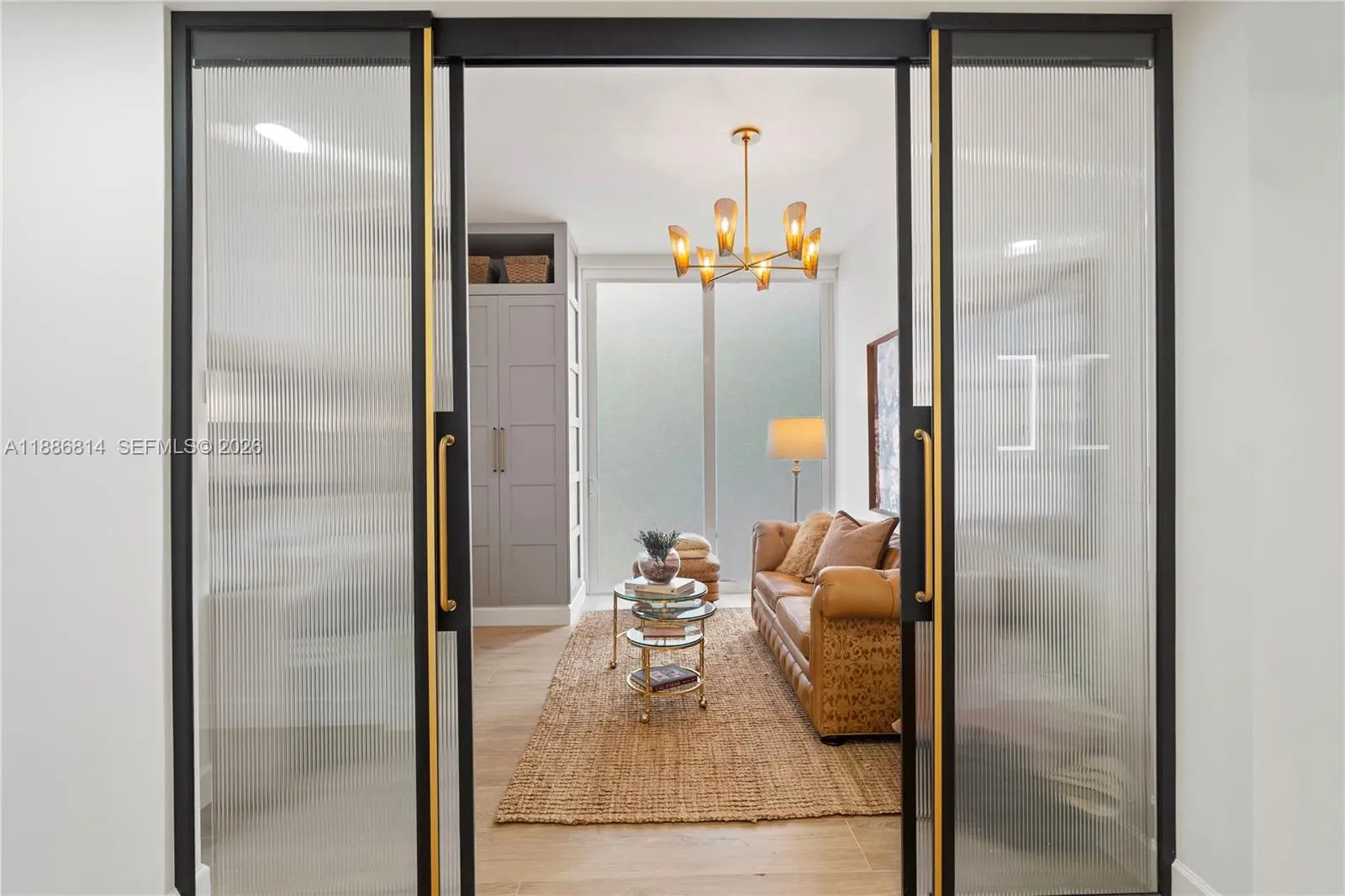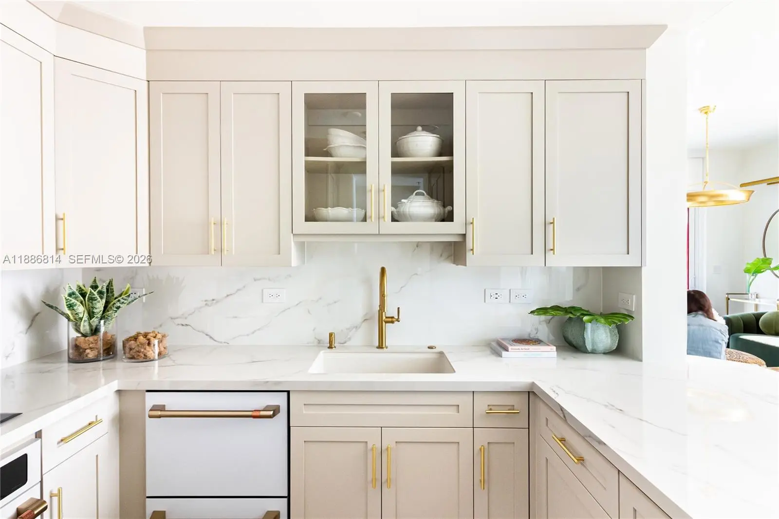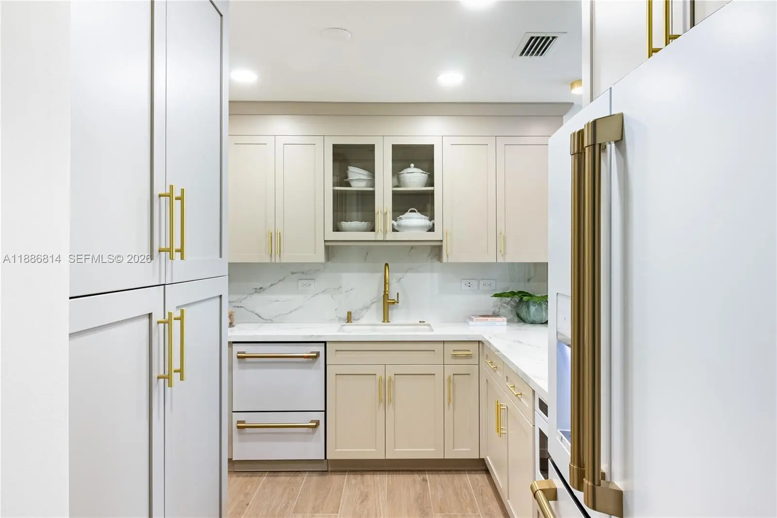 Luxury is measured in the feel ....immerse yourself in the luxury of elevated living in this premium home overlooking Granda Golf course and green tree canopies. This fully renovated three-bedroom two-bath home delivers curated comfort bathed in an abundance of natural light. This turnkey opportunity invites you to move in and simply enjoy exceptional finishes, 10-foot ceilings, and new floor to ceiling impact glass. The luxury of natural colors come to life in color drenched rooms showcasing mixed metals of solid brass and bronze, EMTEK hardware, Visual Comfort lighting, custom glass wall partition, Kohler fixtures, Italian porcelain wood look flooring, marble bath flooring , the exquisite soft veining of Calacatta gold oro, and custom cabinetry throughout. Newly reimagined, the tailored kitchen packs a punch with built in organizational features behind every door and a full suite of new Smart GE Cafe Series appliances in matte white and polished brass. All situated in one of Coral Gables' most desired condominium communities offering 24 hour concierge, privacy, security, renovated meeting rooms and gym, pool, and (soon to be completed well ahead of most other Gables condominium communities) a full exterior restoration resulting in a magnificent premium property.