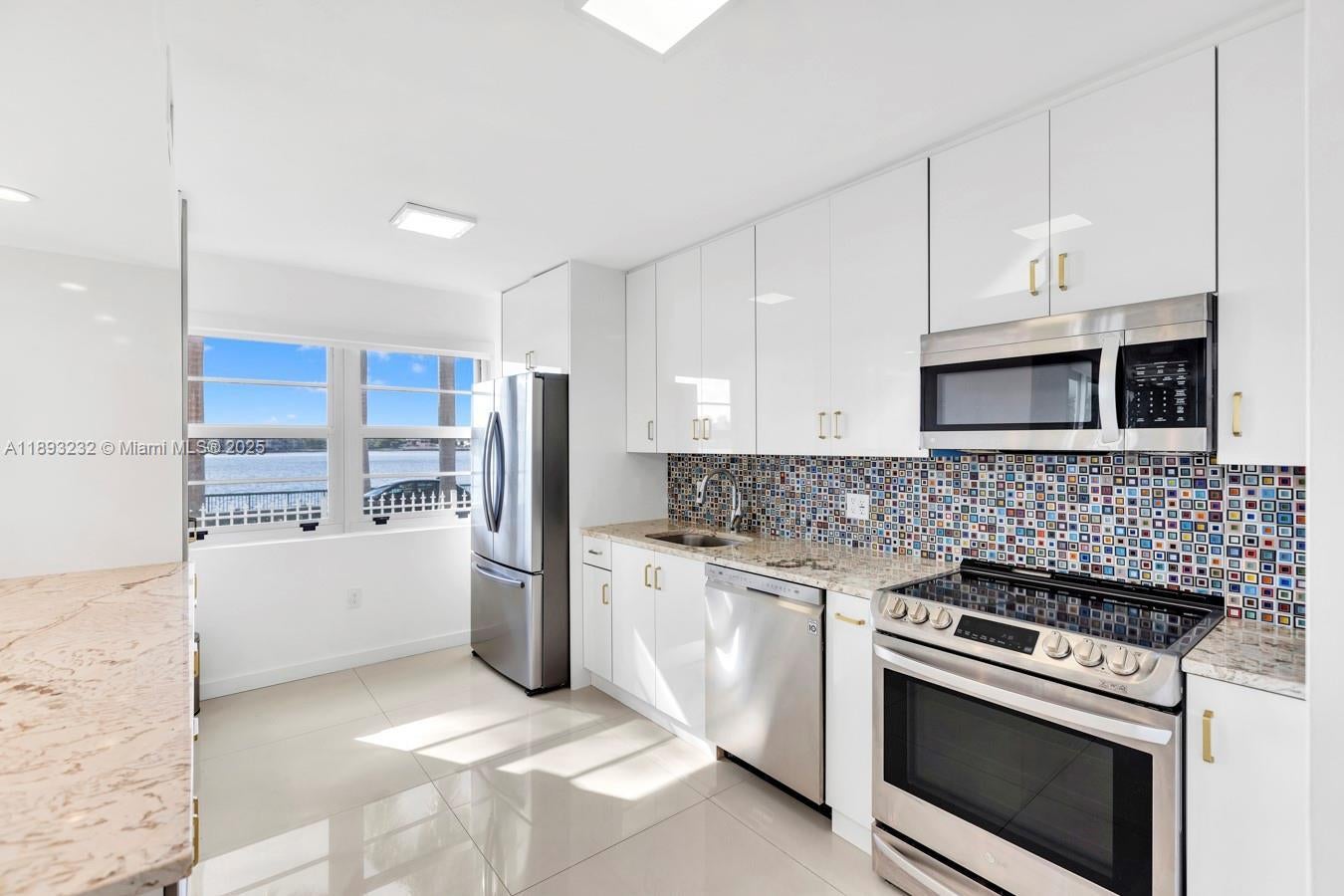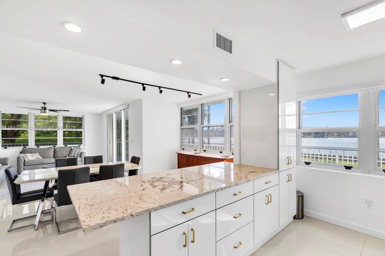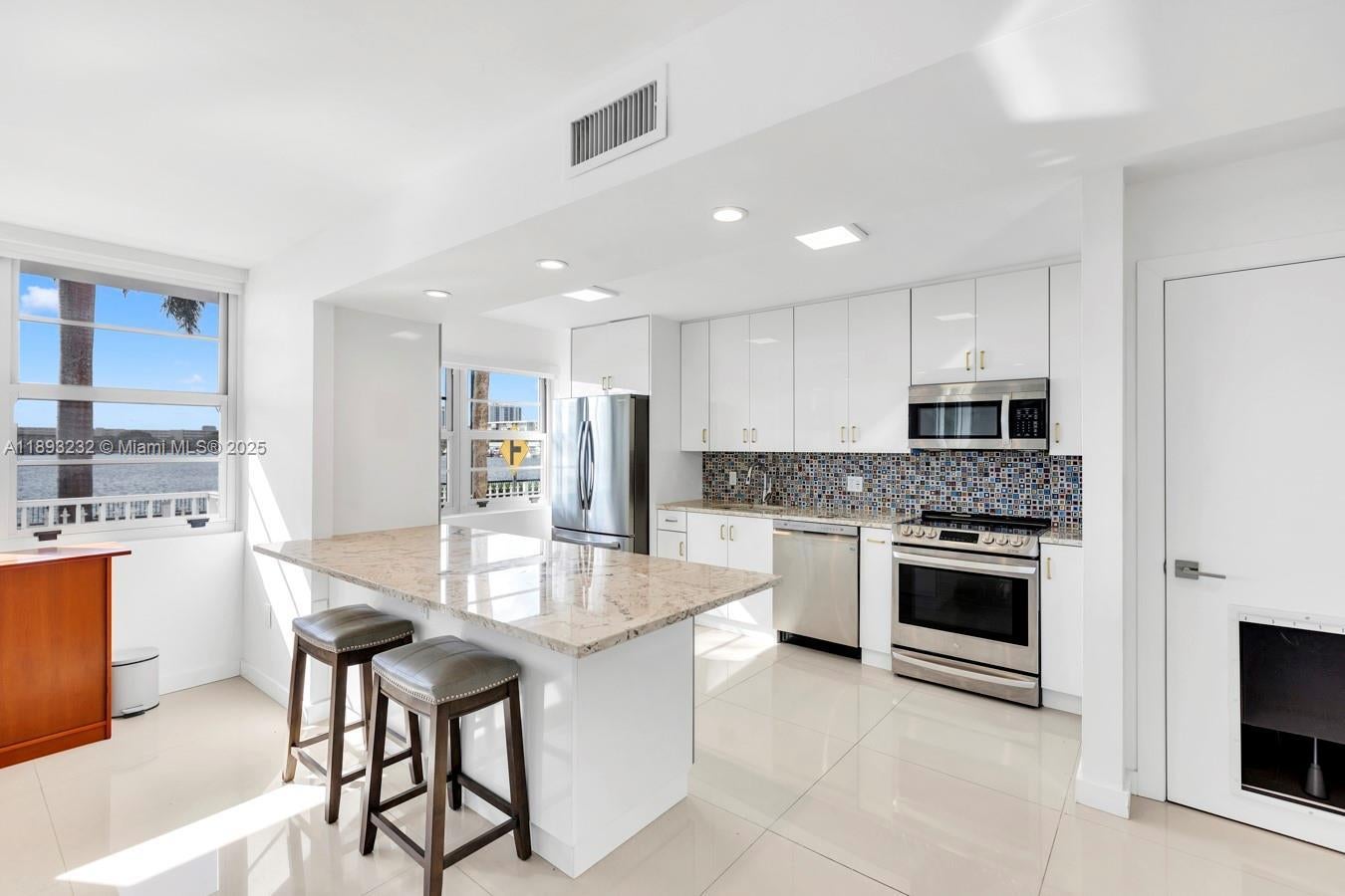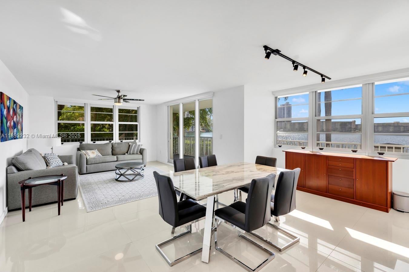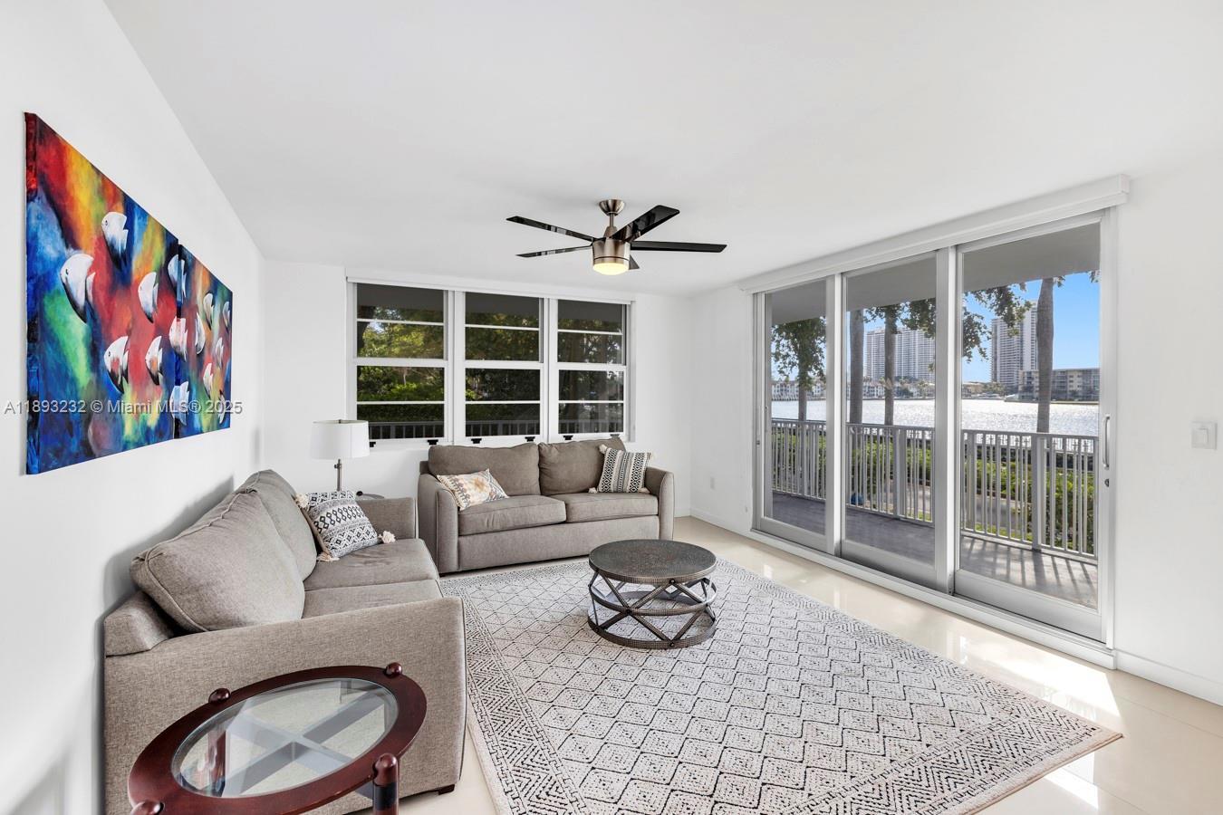 Welcome to this beautifully remodeled corner unit offering 1,693 sq ft of comfortable living space. This 2-bedroom, 2-bath home features a wrap-around balcony with serene Maule Lake views, porcelain tile floors, recessed lighting, and an updated kitchen and baths with granite countertops and stainless steel appliances. Located on the first floor, it offers easy access and hurricane protection with impact windows and sliding doors. Enjoy resort-style amenities including two pools, tennis courts, a fitness center, lush gardens, playground, and 24-hour security. Ideally located near restaurants, supermarkets, parks, Aventura Mall, beaches, and major highways—ready for you to move in and enjoy.