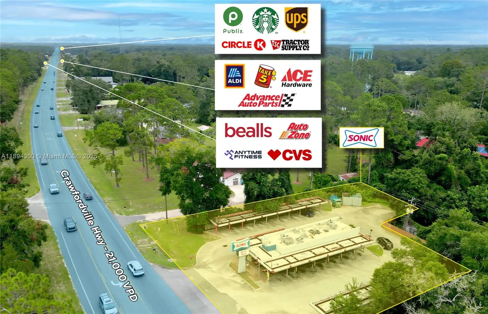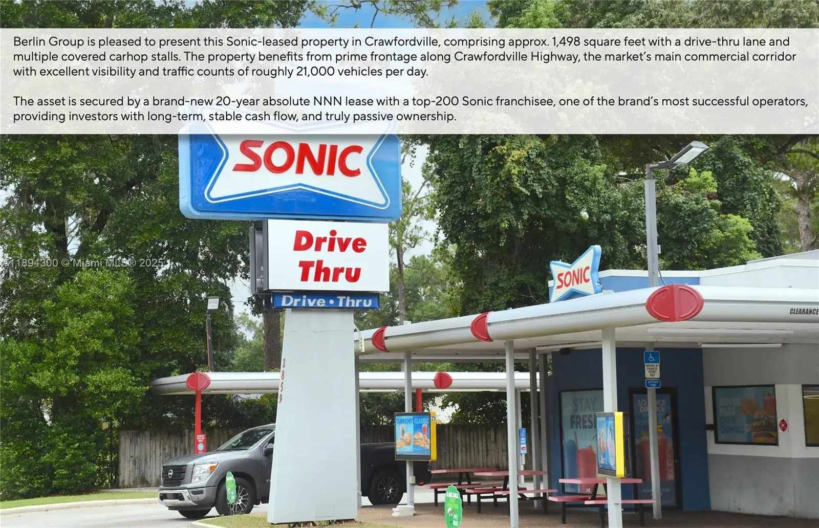 Berlin Group is pleased to present this Sonic-leased property in Crawfordville, comprising approx. 1,498 square feet with a drive-thru lane and multiple covered carhop stalls. The property benefits from prime frontage along Crawfordville Highway, the market's main commercial corridor with excellent visibility and traffic counts of roughly 21,000 vehicles per day. The asset is secured by a brand-new 20-year absolute NNN lease with a top-200 Sonic franchisee, one of the brand's most successful operators, providing investors with long-term, stable cash flow, and truly passive ownership. Notably, the lease includes a rare percentage rent clause, offering investors potential upside in addition to the base rent.
