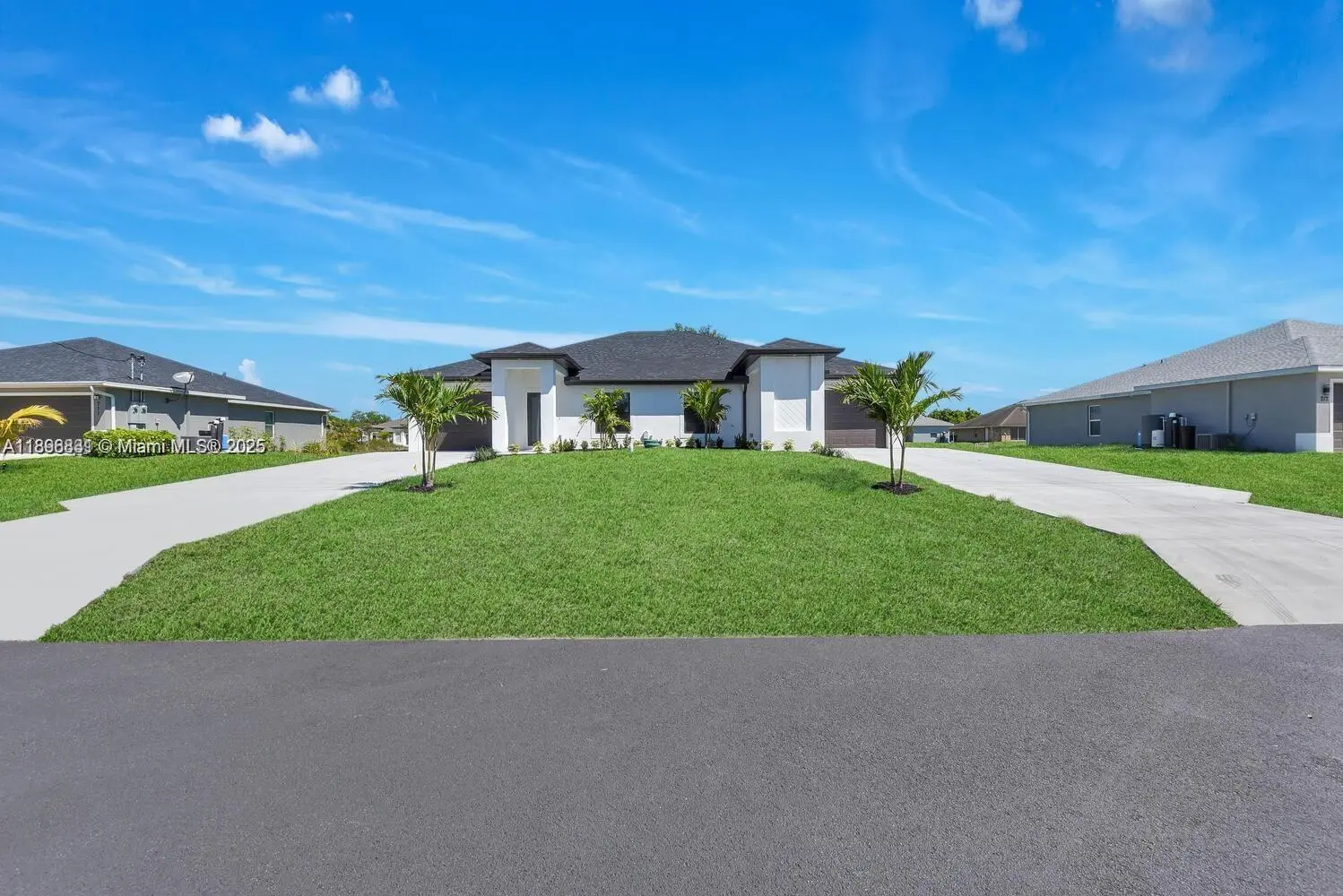 Stunning corner duplex located across from the only golf course in the area! stainless steel appliances, porcelain tile flooring, quartz countertops, impact windows, an exterior security camera system, and a sprinkler system. Both units feature a one-car garage with epoxy style floors and an independent side door offering the potential for future additional income or private access. Positioned on corner lots, this property offers extra privacy and curb appeal. Expected to be move in ready by late August or early September. Ideal for investors or homeowners looking for long-term value. Easy to show. Realtors welcome!