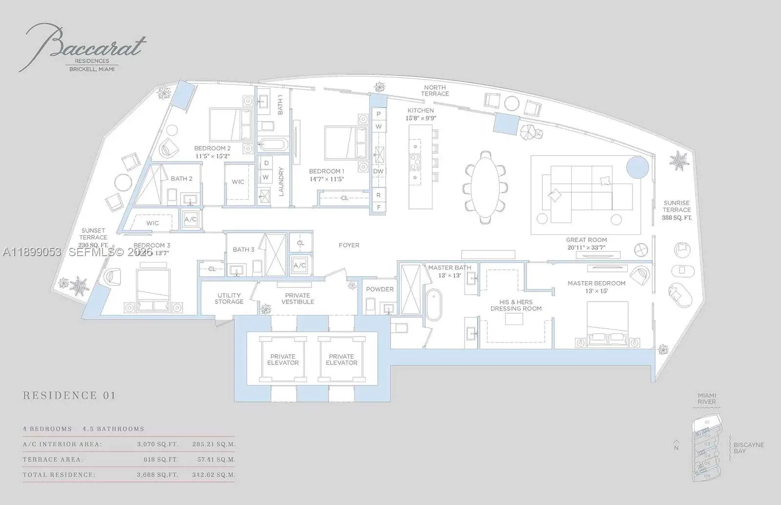 4 BD / 4.5 BA with 3,070 SF +627 SF OF TERRACE. BACCARAT RESIDENCES MIAMI, THE MOST ANTICIPATED LUXURY HIGHRISE IN BRICKELL, OFFERING THIS BEAUTIFUL NE CORNER (THE PREMIUM LINE), EXPERTLY DESIGNED WITH BESPOKE INTERIORS IN THIS FLOW-THROUGH RESIDENCE WITH INFINITE VIEWS OF BISCAYNE BAY, CITY LIGHTS AND THE MIAMI RIVER, DEEP TERRACES, 10 FT. CEILINGS, HIGH END FLOORING, ITALIAN KITCHEN CABINETS, SUB-ZERO/WOLF APPLIANCES, AND MUCH MORE. ELEGANT LOBBY, CAFE, ART GALLERY, WINE CELLAR, MULTIPLE EVENT ROOMS, PRIVATE MARINA, BOARDWALK, BAYFRONT POOL DECK, AND MUCH MORE. PRE-CONSTRUCTION OFFERING - DELIVERY FIRST QUARTER 2028