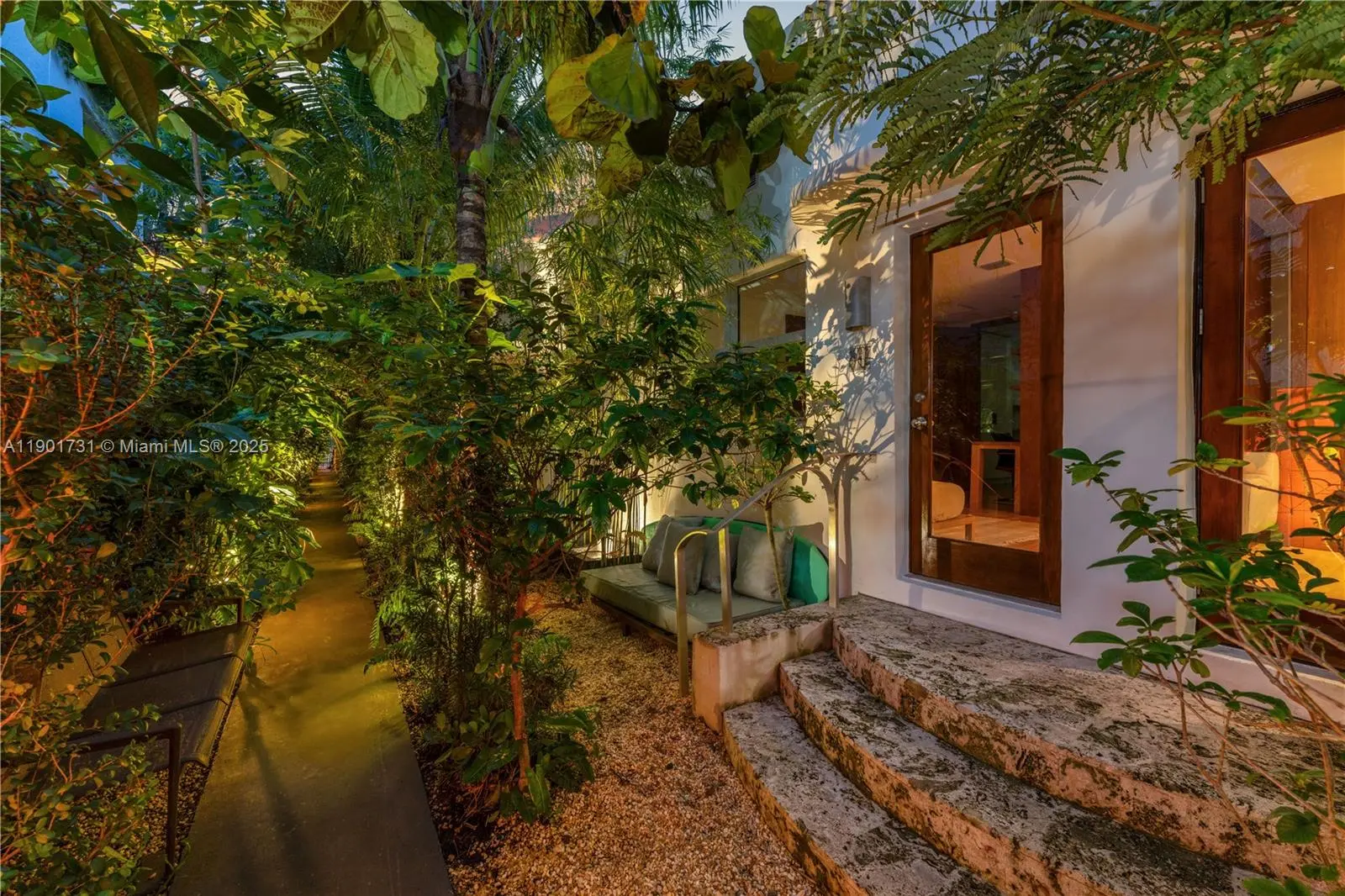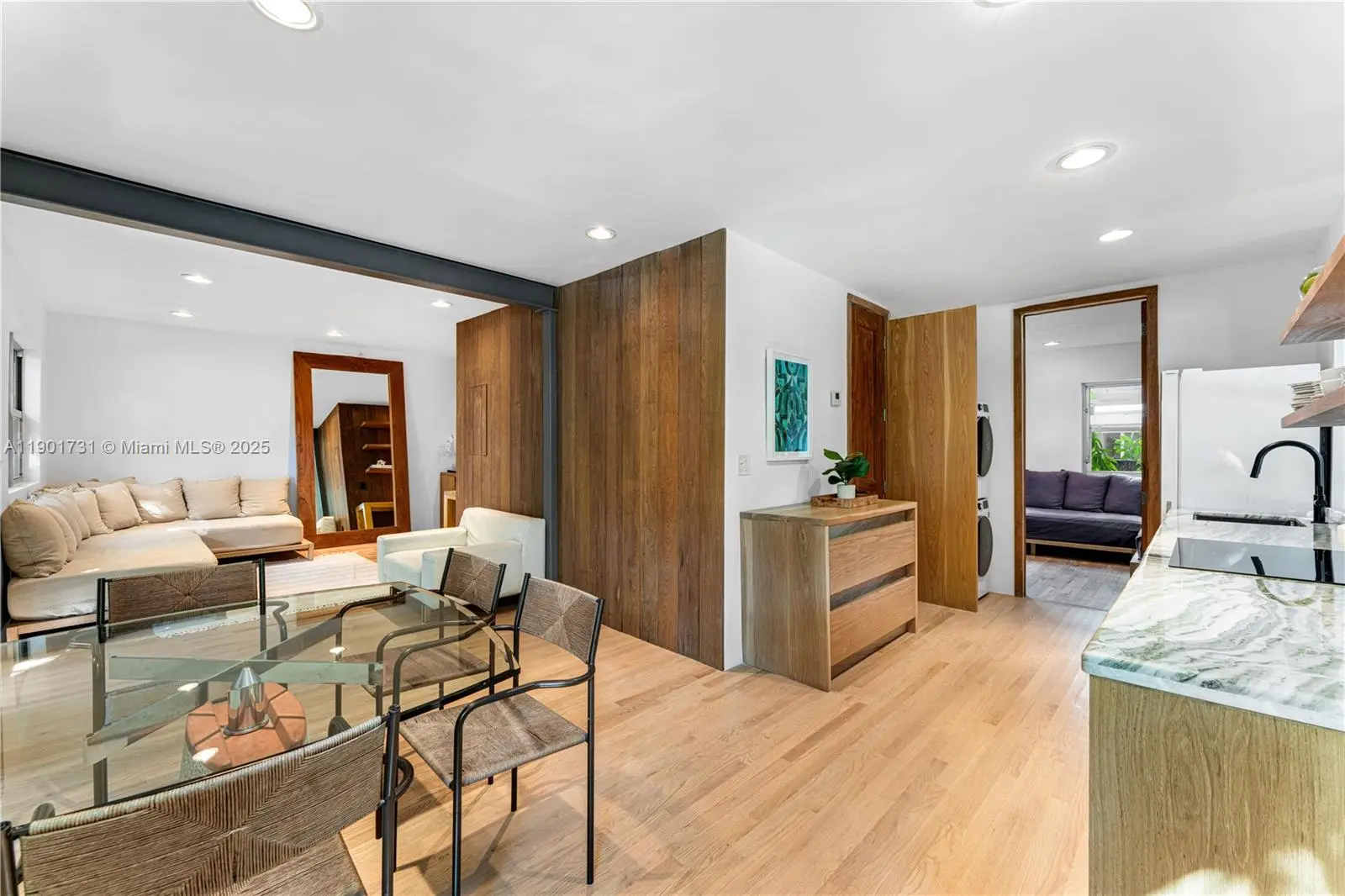 South of Fifth Beach Bungalow located on a premiere quiet block, nestled in a lush tropical botanical garden. This 2BD/2BA, 922 SF sanctuary blends natural textures with modern design. Warm white oak floors and Ipe wood walls create a serene, organic backdrop accented by Italian custom-built furniture and décor. The kitchen is a showpiece, featuring green marble counters, floating cabinetry, Blanco sinks, and a Fulgor Milano oven. The blue Spanish-tiled bathrooms with skylights evoke coastal Mediterranean charm, while the LG laundry area and Whirlpool dishwasher add everyday convenience. Experience true Miami Beach living in the heart of SoFi: a coveted area with short distance to world-class dining and the beach.