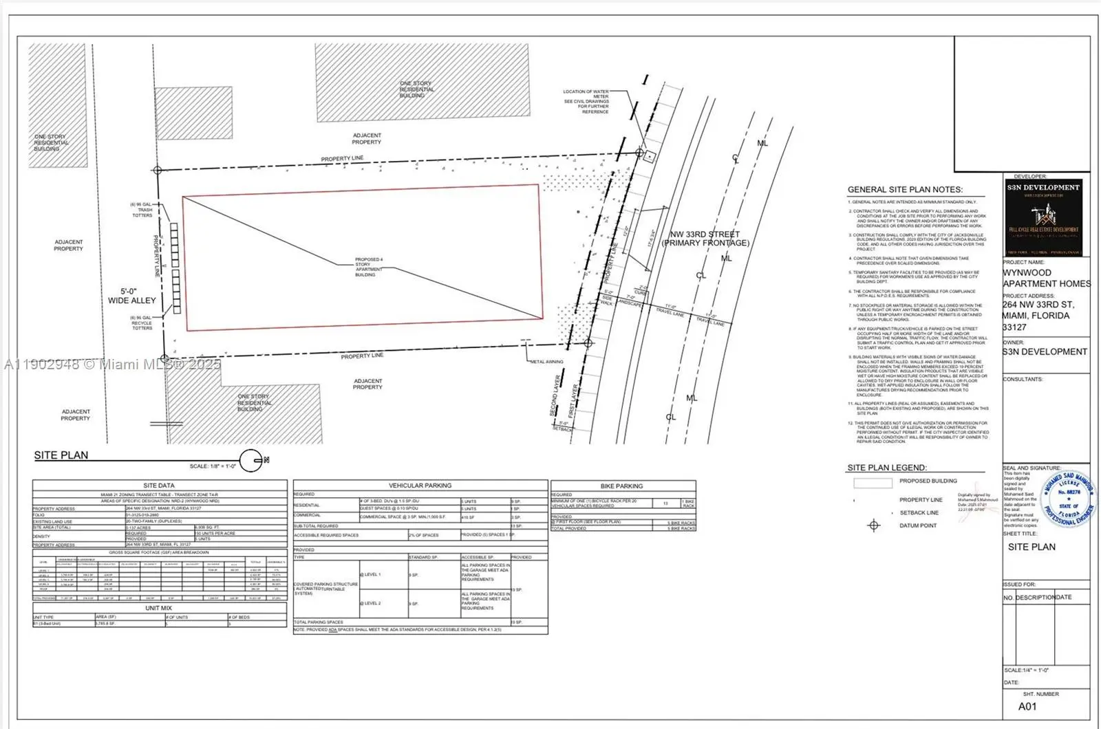 Wynwood Apartment Homes at 264 NW 33rd Street, Miami, FL 33127 is a boutique 5-unit townhome project by S3N Development. Each of the 5 residences offers 3 bedrooms/3 baths across approximately 1,800 sq. ft. and 3 stories. The 1st floor features a private covered carport, utility area, and entry foyer. The 2nd floor offers a bright open-plan kitchen, dining, and living area plus 1 bedroom / 1 bath. The 3rd floor includes 2 bedrooms, with a primary suite featuring ensuite bath and walk-in closet. Every unit is crowned with a private roof deck accessed via ship ladder—perfect for outdoor dining and skyline views. With a total project size of approximately 11,357 sq. ft., Wynwood Apartment Homes blends modern design, efficiency, and Miami urban living in the heart of the Wynwood Arts District