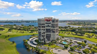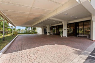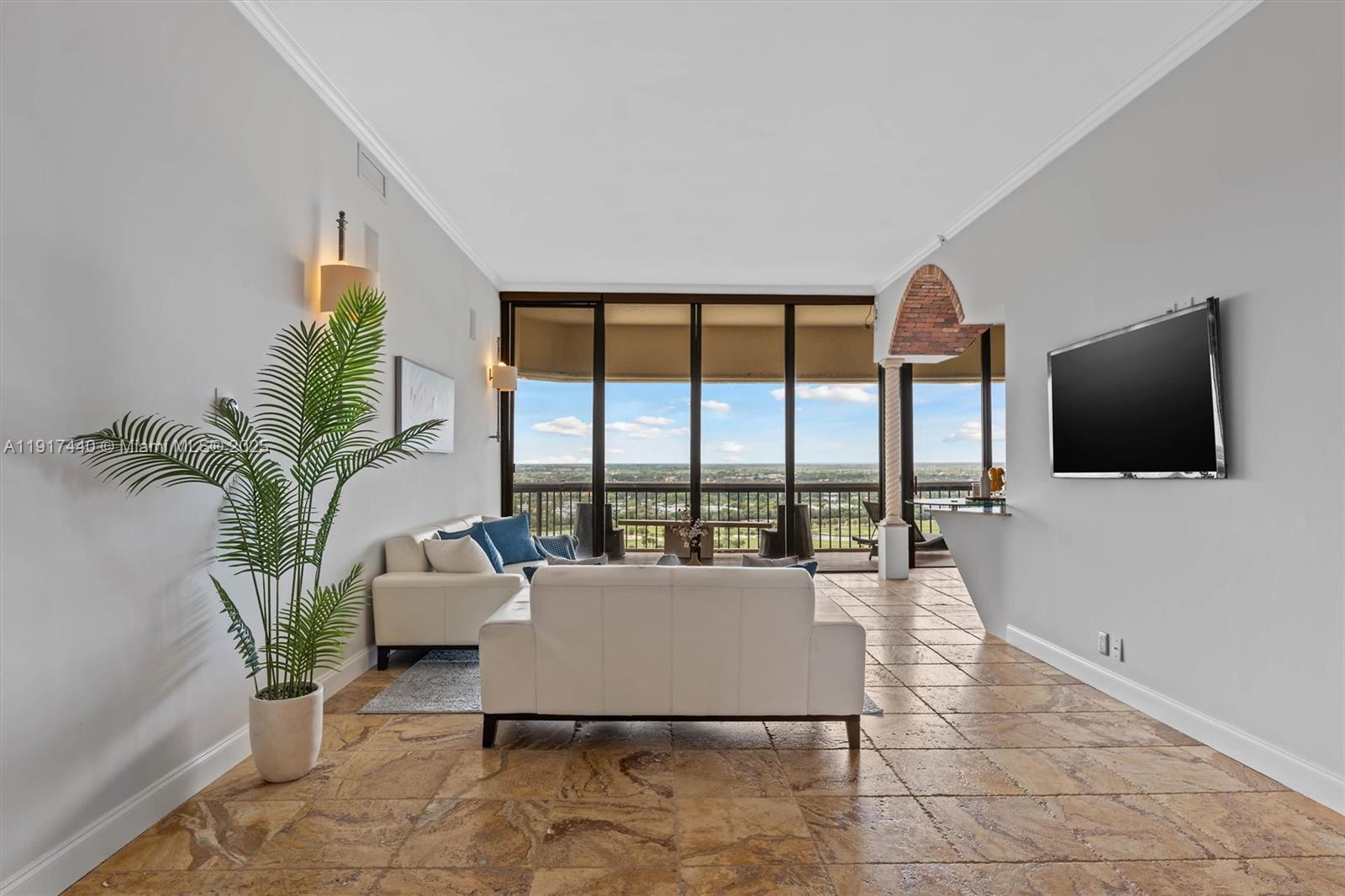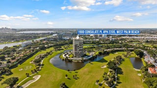Experience penthouse living with breathtaking golf and city panoramas from a 50-ft balcony. This 2-bed, 2-bath residence spans 1,557 sq ft and blends architectural drama with modern sophistication. The featured vaulted brick ceiling and natural stone floors create a European-inspired ambiance, complemented by a remodeled kitchen with sleek cabinetry, granite counters, and mosaic accents. Spa-style baths showcase designer tile work and custom finishes, while motorized blinds add comfort and convenience. An assigned storage room on the same floor provides useful utility. The Consulate, a full-service tower within The Lands of the President, offers 24-hr security, pool and spa, fitness center, tennis, social room, and more. One assigned covered parking spot and plenty of guest spaces.