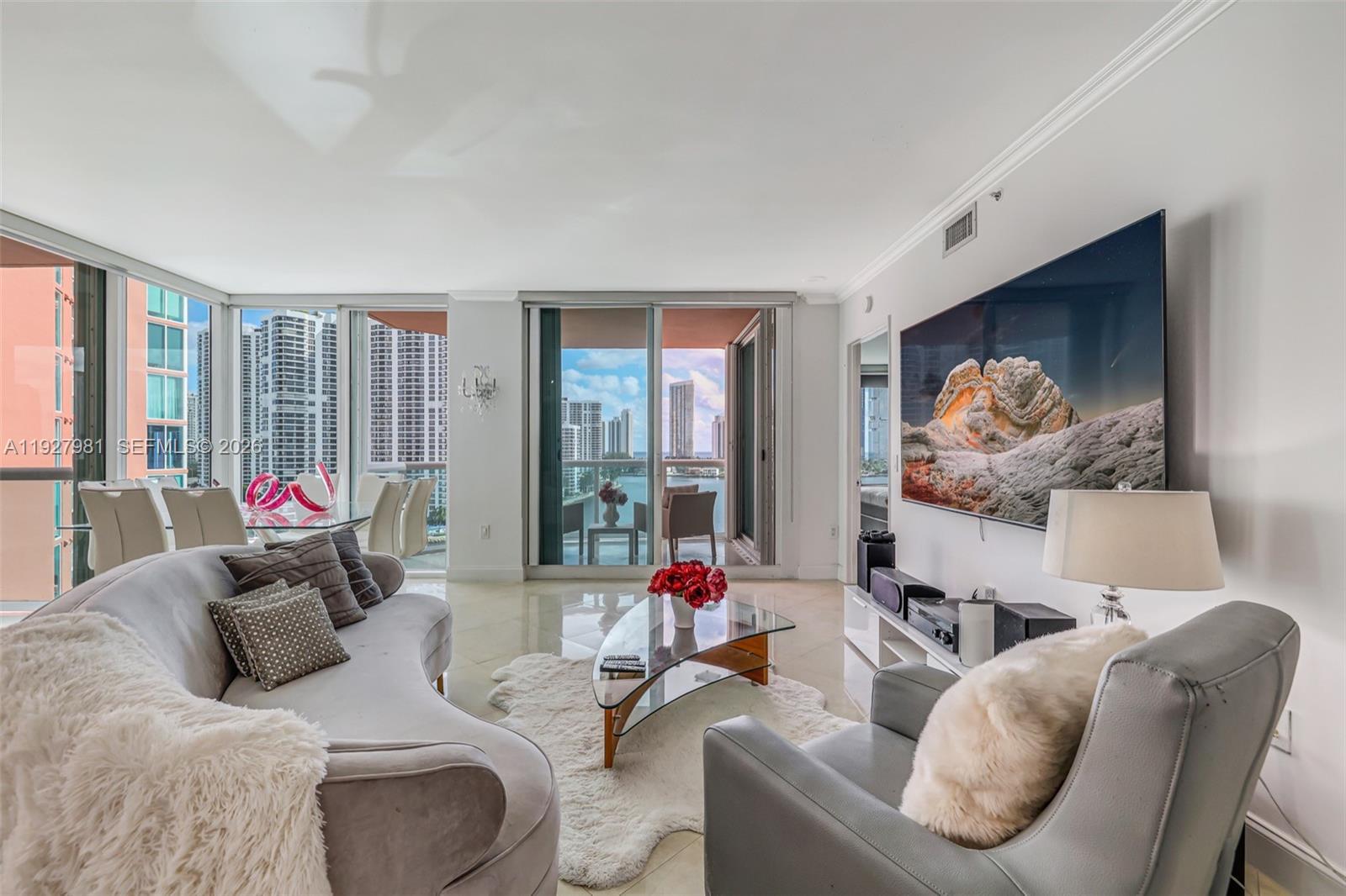 Stunning Intracoastal and Ocean views from every room, in this renovated 2BR/2.5BA home, with New A/C Unit. A semi-private elevator landing welcomes you into this beautifully updated home featuring floor-to-ceiling windows and a custom open-concept kitchen with an oversized island and breakfast bar—ideal for entertaining. The split-bedroom floor plan offers spacious ensuite baths and excellent closet space. Enjoy seamless indoor-outdoor living with three private east facing terraces, perfect for daily sunrises. Additional highlights include a separate laundry room. Hidden Bay is a full-service, resort-style community featuring tennis, pickleball and basketball courts, private marina, dog park, fitness center and spa with daily classes, party room, and a waterfront pool. Unbeatable Aventura location with walkability to Aventura Mall, top dining, houses of worship, and within the highly sought-after Aventura Charter School district.