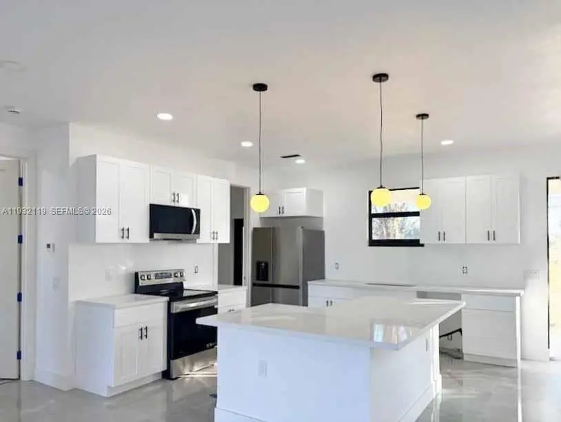 Check out this new construction in Montura Ranch Estate, Clewiston, FLORIDA, with 2025 sqft of Total Area. This home features a modern design, with attractive design choices in flooring, cabinetry, granite countertops, lighting, and large impact windows that allow for natural light. Spacious living spaces, a great room plan, three bedrooms, and two bathrooms. The master bedroom will have a shower and bathtub, as well as a dual sink. The kitchen features stainless steel appliances and a granite countertop. A paved driveway, sweeping entry gate, and grand staircase are all elegant and tasteful. The home sits on a private, fenced 1.25-acre lot. Enjoy your private oasis. NO HOA REQUIRED. The house will be ready by February 2026.