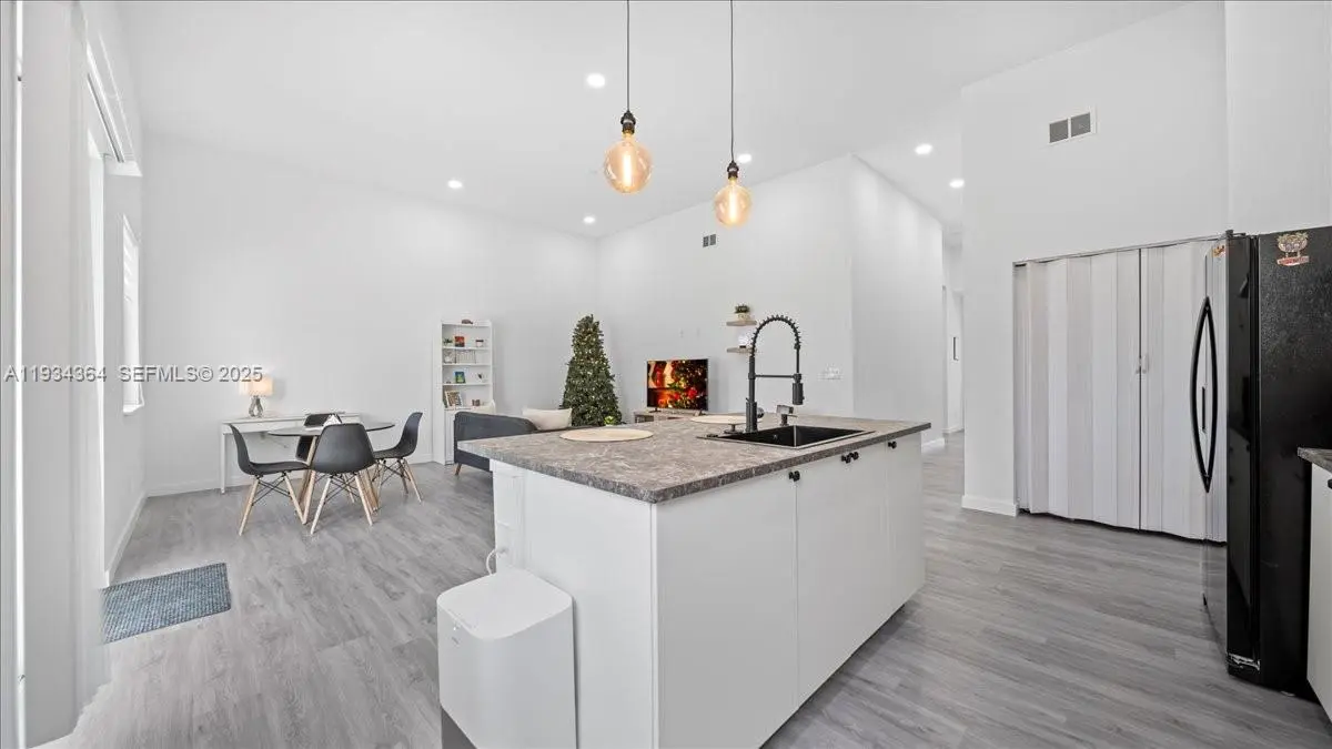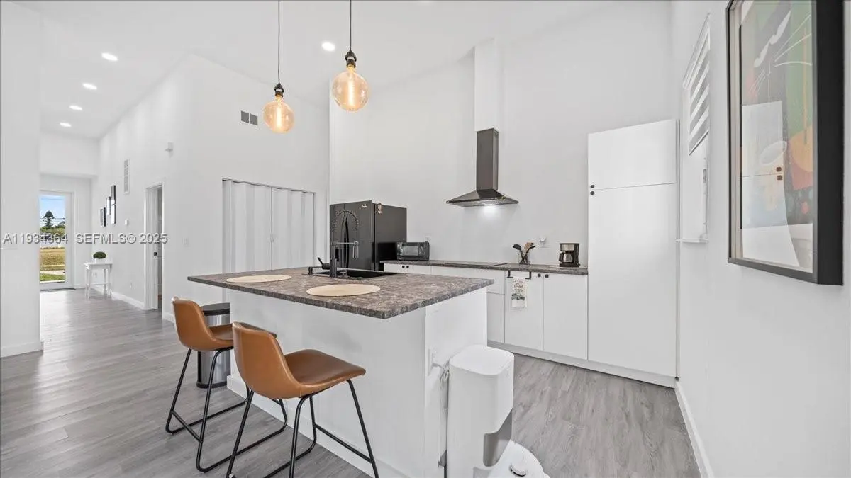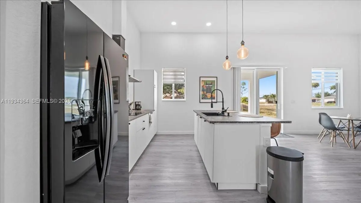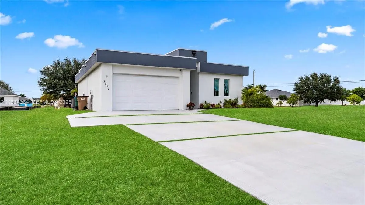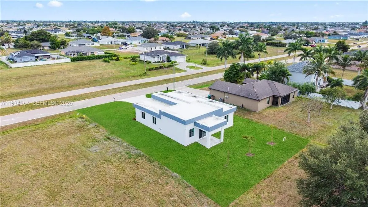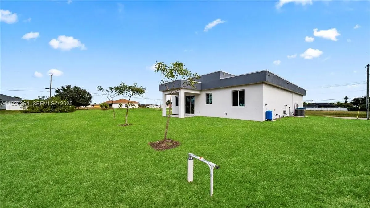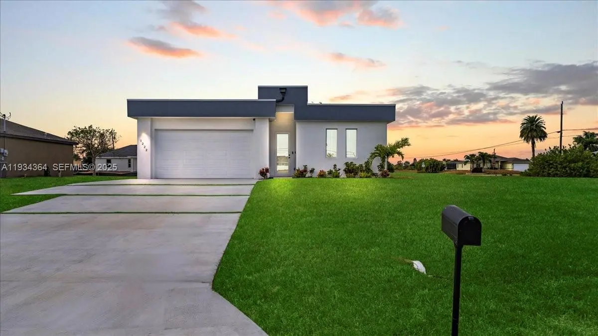 Say hello to this beautiful newly built home in Cape Coral, FL! Built in 2025, this 3-Bedroom, 2-Bathroom, 2 Car Garage with Motor and Covered Lanai Single-Family Home offers 1,500+ sq. ft. of living space! The home flows seamlessly from the living room to the dining area and kitchen, perfect for modern living and entertaining while maintaining well-defined bedrooms and functional living areas and having up to 12' ceiling, and all of it's interior flooring having durable vinyl throughout . The kitchen features durable laminate countertops, Black Appliances, a center island, cooktop, hood vent, microwave, and refrigerator, providing both functionality and style. The master bathroom includes a dual-sink framed vanity, walk-in shower, and black faucets along with the master's walk in closet, while the guest bathroom offers a bathtub with black faucets and framed vanity sink. Laundry is conveniently located inside the home and it includes washer and dryer. All windows are impact-rated, enhancing energy efficiency and storm protection. The home also has city water, septic system, and irrigation well. Additional advantages include no HOA, a no-flood zone location, and a move-in ready design, offering peace of mind and flexibility. With 2-10 Homebuyers Warranty included, whether you’re a first-time buyer, relocating, or seeking a wonderful Florida lifestyle, this home combines modern features, quality construction, and an excellent location in the growing area of SWFL!