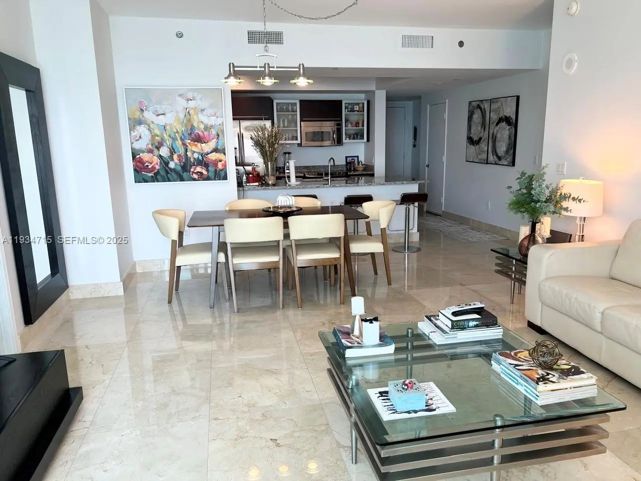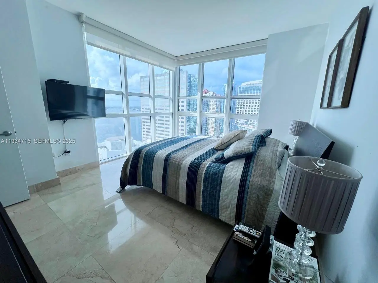 Available as a 3-month rental, perfect for snowbirds seeking a warm-weather retreat. Please call/text agent to discuss dates. Stunning furnished 2 bd/2.5 bath condo with breathtaking water views. Floor to ceiling windows illuminate the open-concept living and dining areas designed for both entertaining and everyday comfort. The pristine kitchen provides ample storage and counter space, blending functionality with timeless style. Wrap-around balcony perfect for enjoying sunrise to sunset panoramas. The spacious primary suite includes a spa-inspired bathroom, walk-in closet and stunning water and city views. The ample second bedroom features its own walk-in closet, ideal for guests or a home office. Powder room/ washer and dryer