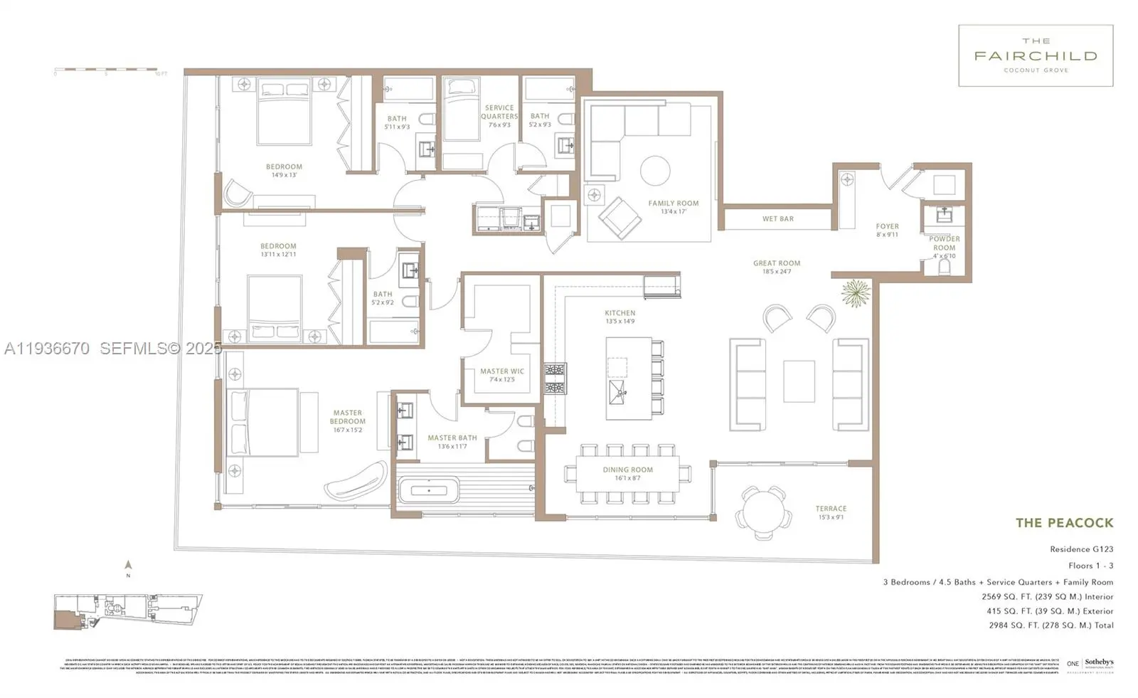 Welcome to Fairchild Coconut Grove, a turnkey furnished residence with 11’ ceilings, 3 bedrooms, 4.5 bathrooms, a family room, and service quarters. The home features a spacious living area and an Italian kitchen with Wolf and Sub-Zero appliances. Finishes include ceramic wood-style floors, Lualdi doors, motorized shades, and a smart home system. Designed by Max Strang, the building offers full-time concierge, gym, spa with hammam, and a rooftop pool with cabanas, summer kitchen, and outdoor grill. A true gem.