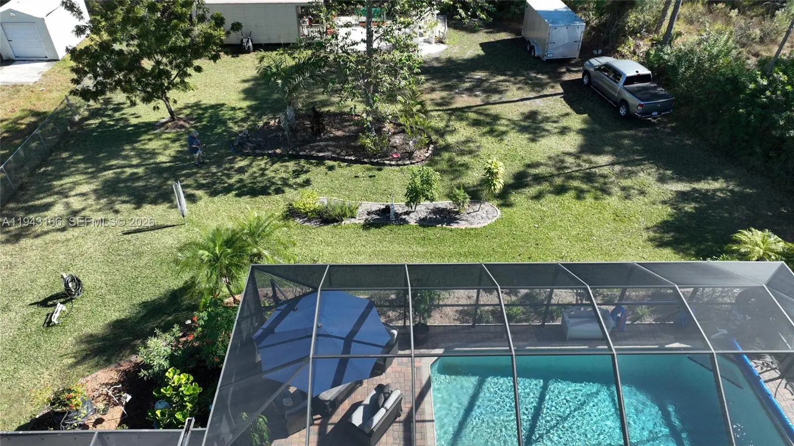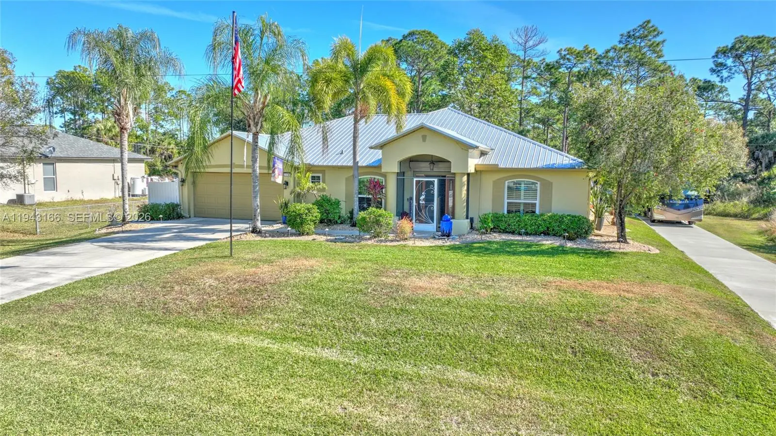 Welcome to this spacious 4 bedroom- plus a den, and 2-bathroom POOL and SPA home all on an oversized half-acre lot. The updated kitchen and bathrooms bring a fresh, modern feel. The den could easily be used as a 5th bedroom. The newer metal roof adds long-lasting peace of mind. Hurricane impact windows and storm shutters for safety, security and insurance savings. Step outside to your private backyard oasis, complete with a heated pool and spa. The huge, enclosed patio features a well equipped outdoor kitchen. A complete sprinkler system to keep the grounds lush. The property even includes extra RV parking, and storage shed. Located minutes from schools, parks and shopping. This one is the total package. See this one and your search will be over!