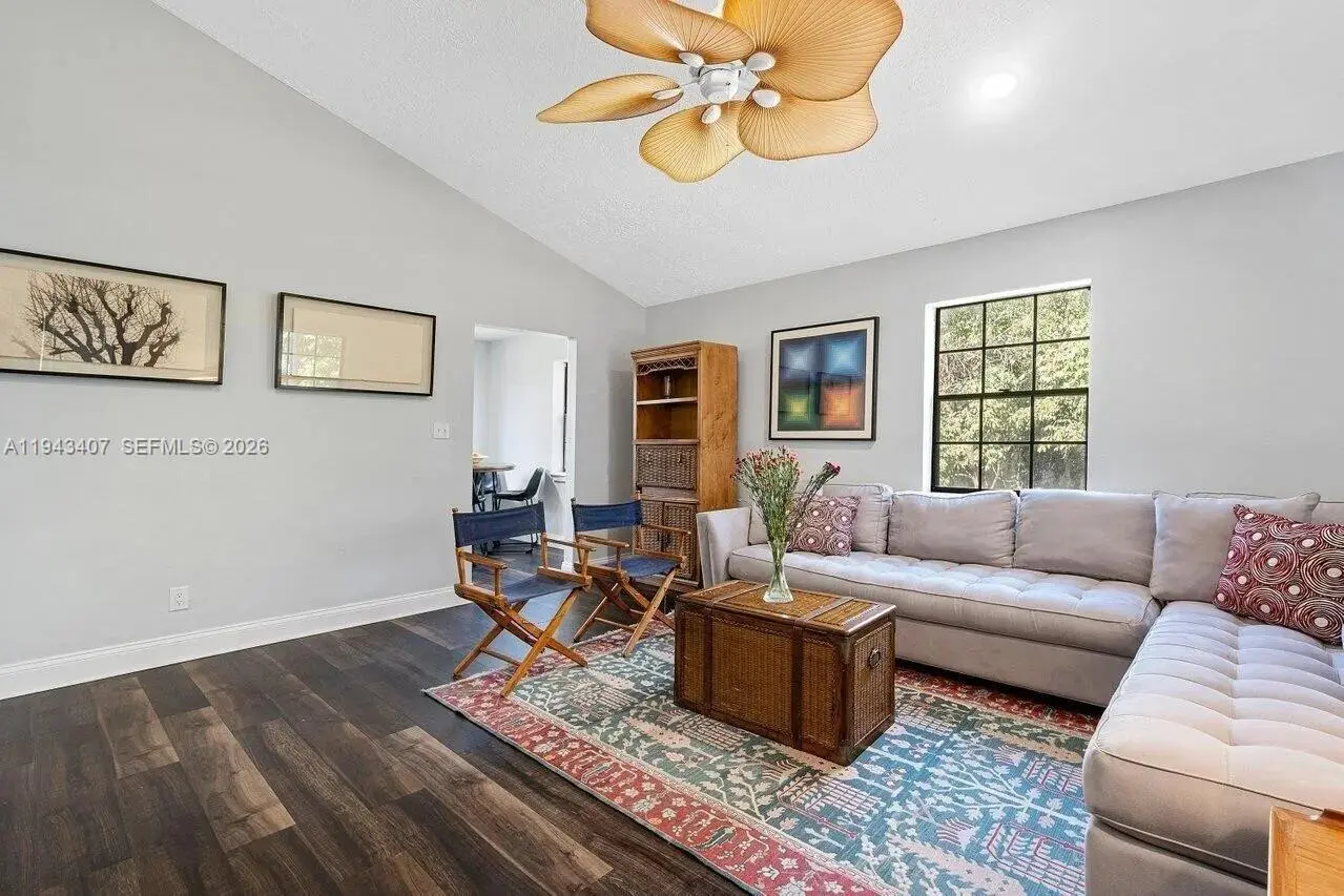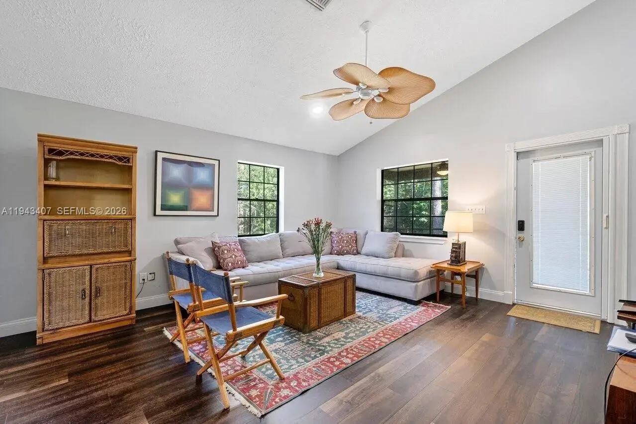 A rare opportunity for luxury acreage living in Palm Beach County, this distinctive Tudor-style estate delivers privacy, architectural character, lifestyle flexibility, and built-in income potential within the Fox Trail Equestrian Community. Set on 5 serene acres surrounded by mature pines, this property delivers a refined rural feel while remaining minutes from Wellington. A fully renovated barn apt ideal for guests or passive rental income (proven $3500 per month).The main residence is filled with natural light from skylights and features soaring high ceilings. A striking stone wall fireplace anchors the living room beneath extra-high ceilings and opens directly to the pool, creating a seamless indoor-outdoor connection. The home features three master bedrooms with walk-in closets, including two upstairs and a downstairs one with direct pool access. A guest half bathroom adds convenience, along with a full outdoors bathroom serving the barn and pool areas. A separate family room provides flexible space for a home office, gym, media room or even an extra guest room. Attached 2 car garage. Outdoor living feels private and resort-like, with the pool framed by tropical landscaping and an extra large screen. A new roof with transferable warranty provides peace of mind. The property includes a barn with 3 existing stalls (12x9), a tack room, and plenty of space for paddocks or riding areas, offering true equestrian potential with access to 29 miles of private bridle trails.
