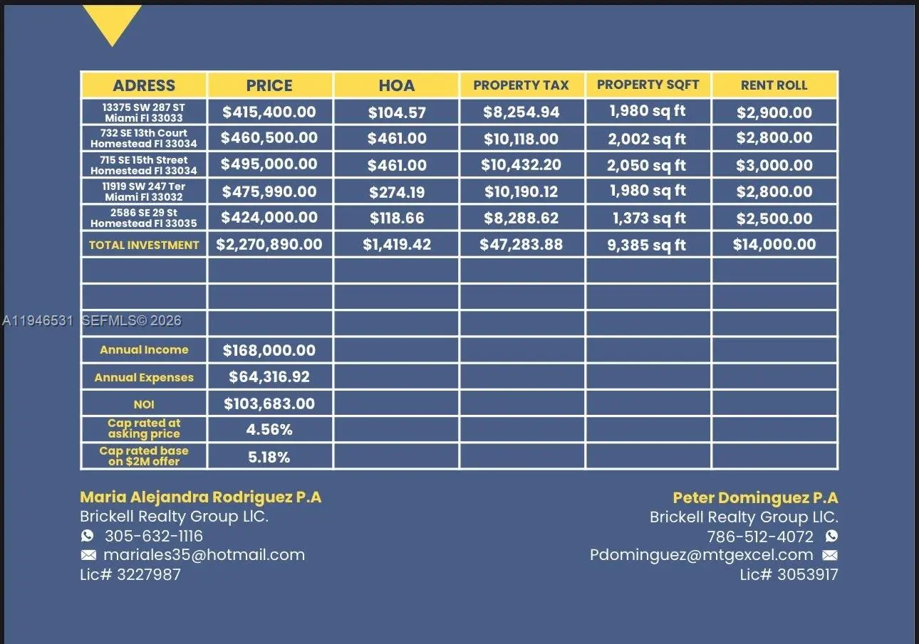 South Dade County Portfolio Investment Opportunity. A rare opportunity to acquire a portfolio of five (5) modern townhomes, each less than 2 or 3 years old, strategically located throughout some of South Dade County's most desirable and established communities. All properties are situated within gated communities, providing tenants with an elevated standard of living and ensuring long Term demand and stability. Five turnkey townhomes, all recently built (under 3 years old), Located in high Growth, high Demand South Dade neighborhoods, Gated communities offering enhanced security and lifestyle amenities, Strong tenant base with 1 year leases in place, each with renewal options, Diversified mix of subdivisions, hand Selected to balance risk and maximize long Term appreciation, all properties are individually deeded, offering flexibility for future resale or refinancing strategies. Ideal for investors seeking steady income, portfolio diversification, and low Maintenance assets. Call for more info.