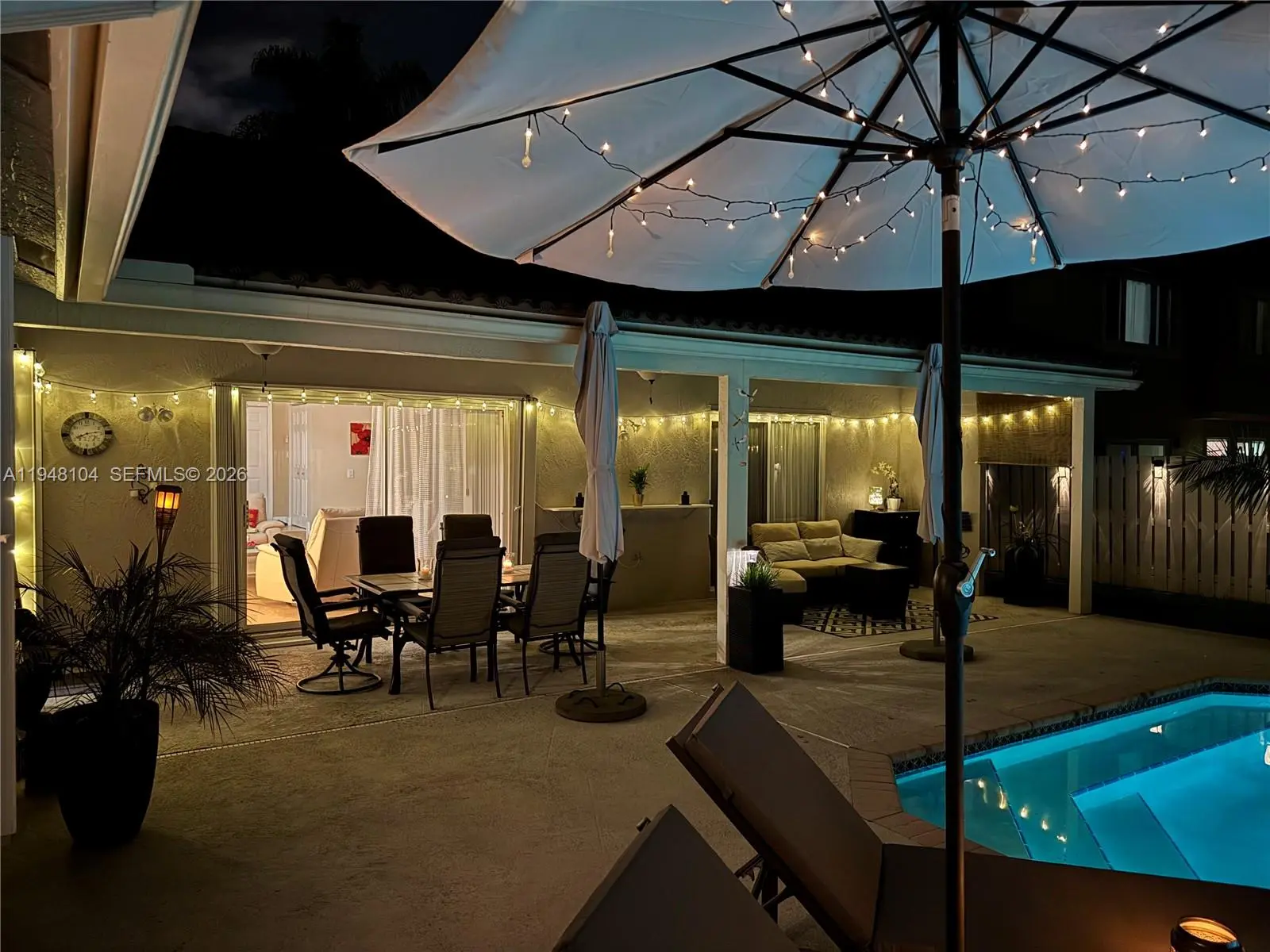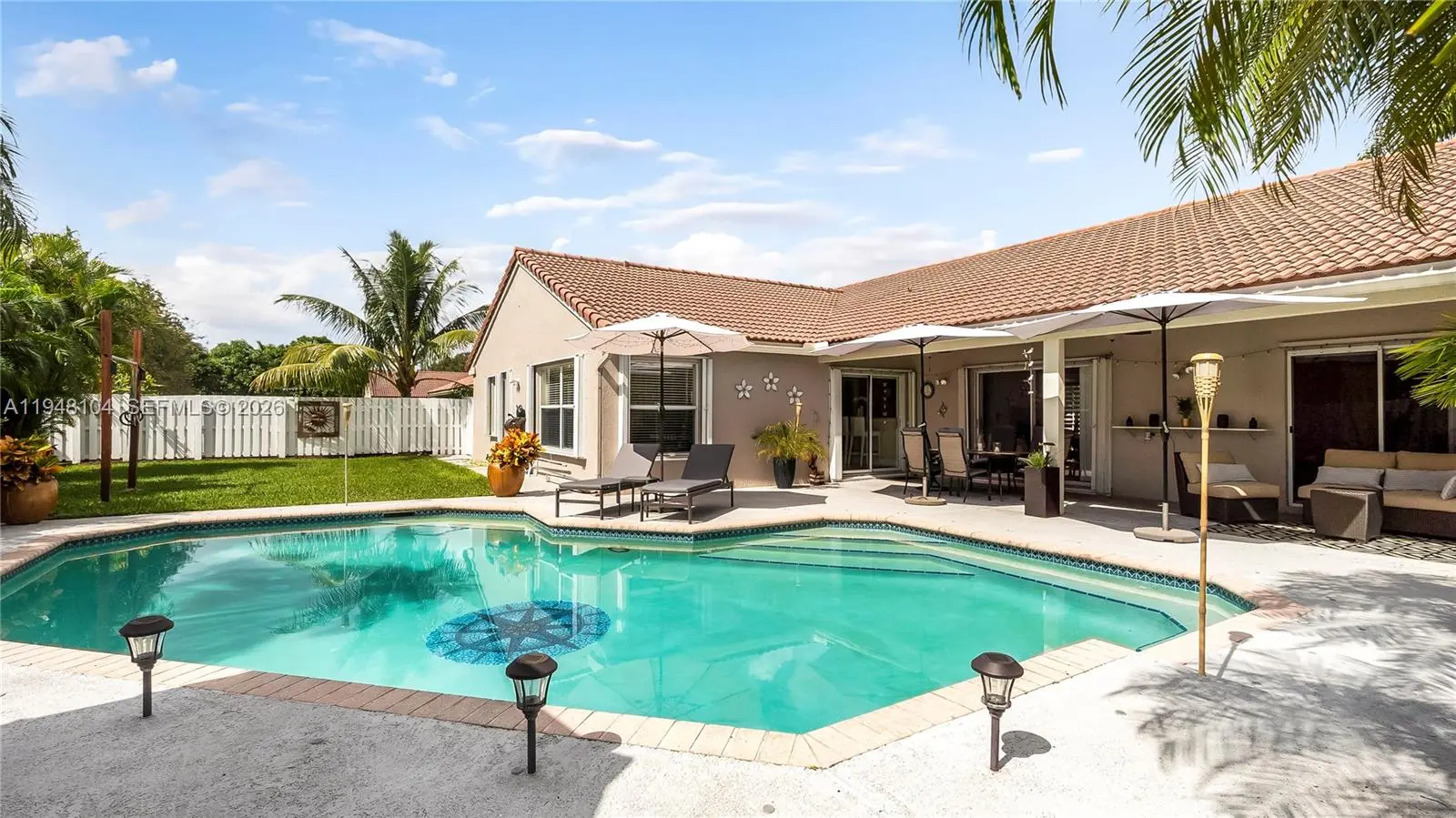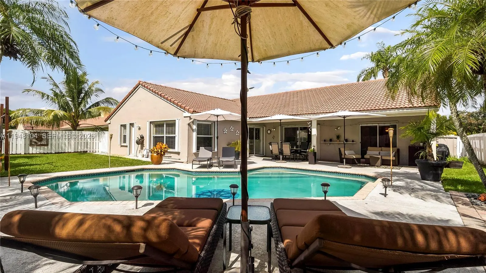 LOVINGLY MAINTAINED 4-bedroom, 2.5-bath home that has been lived in with pride and care. This warm and welcoming residence is where memories were made and children were raised. Located in THE ESTATES at the RESIDENCES OF SAWGRASS. A neighborhood of estate-style, private homes. ENTERTAIN IN STYLE in the oversized POOL AREA, designed for fun, relaxation, and unforgettable gatherings. Enjoy a HUGE COVERED PATIO AREA perfect for lounging, dining, or hosting year-round, plus extra grassy space ideal for play, pets, or outdoor games. This backyard offers the perfect blend of comfort, space, and resort-style living. The living areas feature elegant 24x24 tile flooring, while the bedrooms offer wood parquet floors and walk-in closets with custom built-ins. ZEBRA BLINDS, NO POPCORN ceilings throughout. Exterior painted in 2023. Equipped with a portable generator connection, NEW POOL PUMP, NEW HEATER and A NEW SPRINKLER TIMER. Multiple sheds and covered storage areas in backyard, Garage is AIR CONDITIONED. The complete accordion shutters provide excellent hurricane protection. Roof 2005, AC 2016, WH 2021. Spacious laundry room with washer and dryer with built-in drawers. Located in a great neighborhood with convenient access to major highways, Sawgrass Mills Mall, restaurants, and schools. Furniture can convey with exceptions. Low HOA fee, Big backyard vibes, Endless Entertaining— PLUS seller open to concessions. Don’t miss this one!