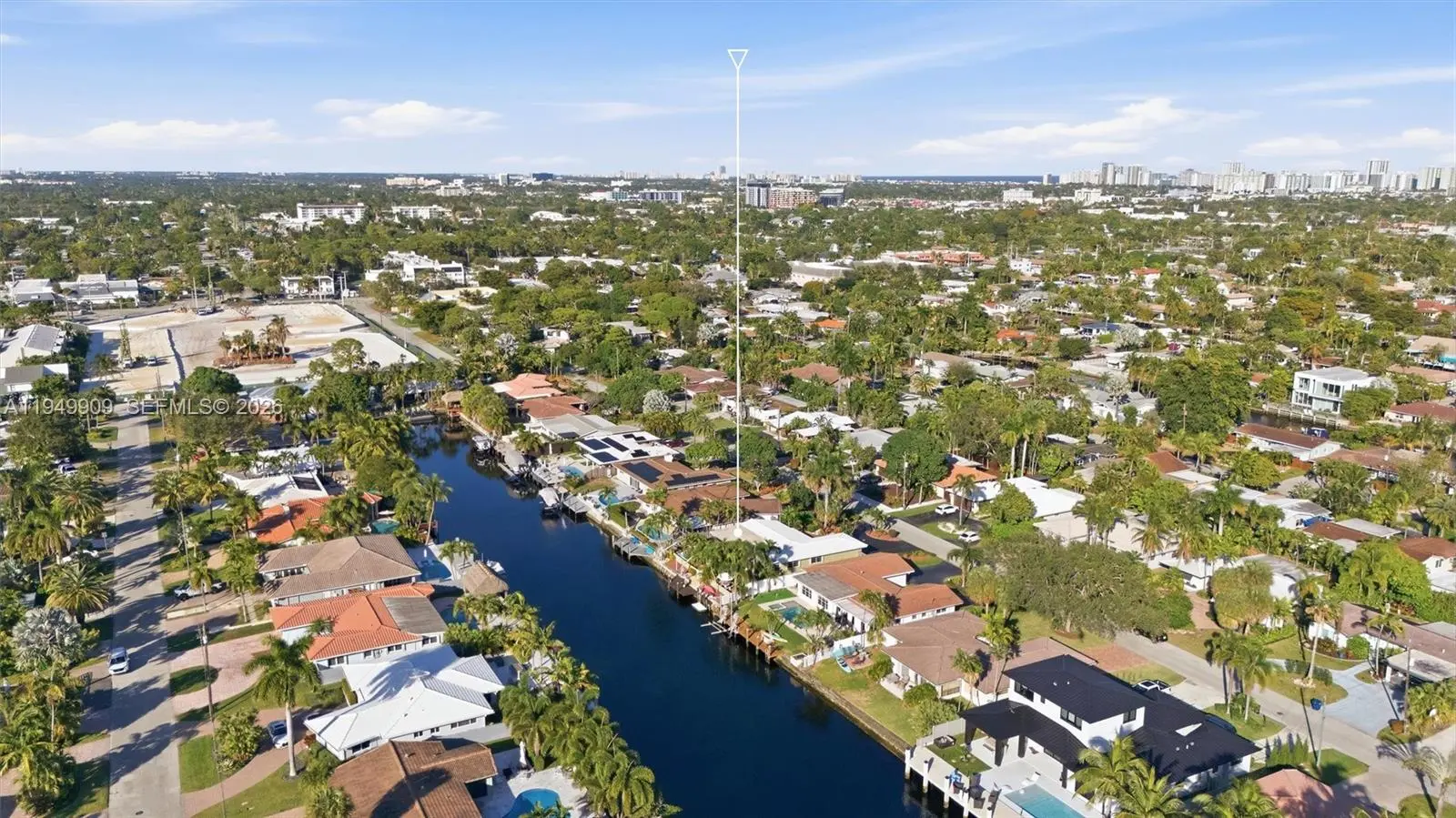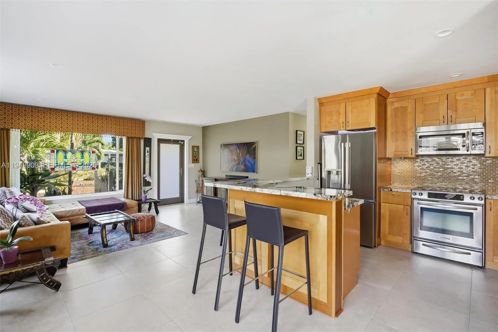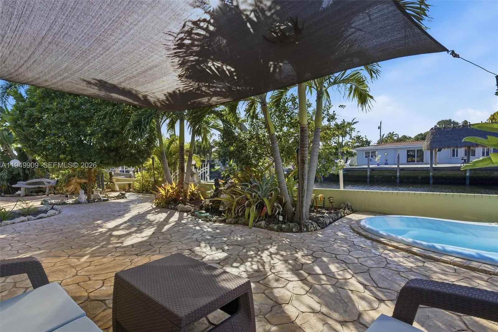 Impeccable and charming Wilton Manors waterfront retreat with ocean access. This 3 bedroom 2 bath residence features an elegant transitional style open concept kitchen with honey toned wood cabinets, glass fronted upper cabinet sections, matched granite countertops, mosaic tile backsplash, stainless steel appliances and under cabinet lighting. The primary bath has a bright, coastal inspired design with a fresh blue-and-white color scheme with a frameless glass enclosure shower. The spacious primary suite has abundant natural light. The secondary bath offers a large frameless glass enclosure shower finished in large format travertine tiles, and a mosaic tile shower floor. Porcelain tile throughout the living areas, wood floors in the bedrooms, smooth ceilings and recessed LED lighting throughout. No detail has been overlooked. Have peace of mind knowing that the roof was replaced in 2018 additional straps were added during installation, electrical updated in 2014, new a/c, ductwork and insulation in 2024. Experience the best of South Florida living with an oasis inspired patio with natural stone pavers and a large in-ground freeform hot tub. From there you are a few steps away from your dock where you can experience waterfront lifestyle with access to davits with a total capacity of 8,000 lbs and a floating dock, perfect for launching your watercraft.