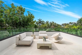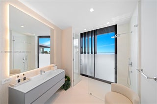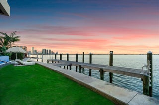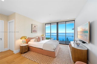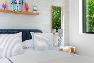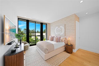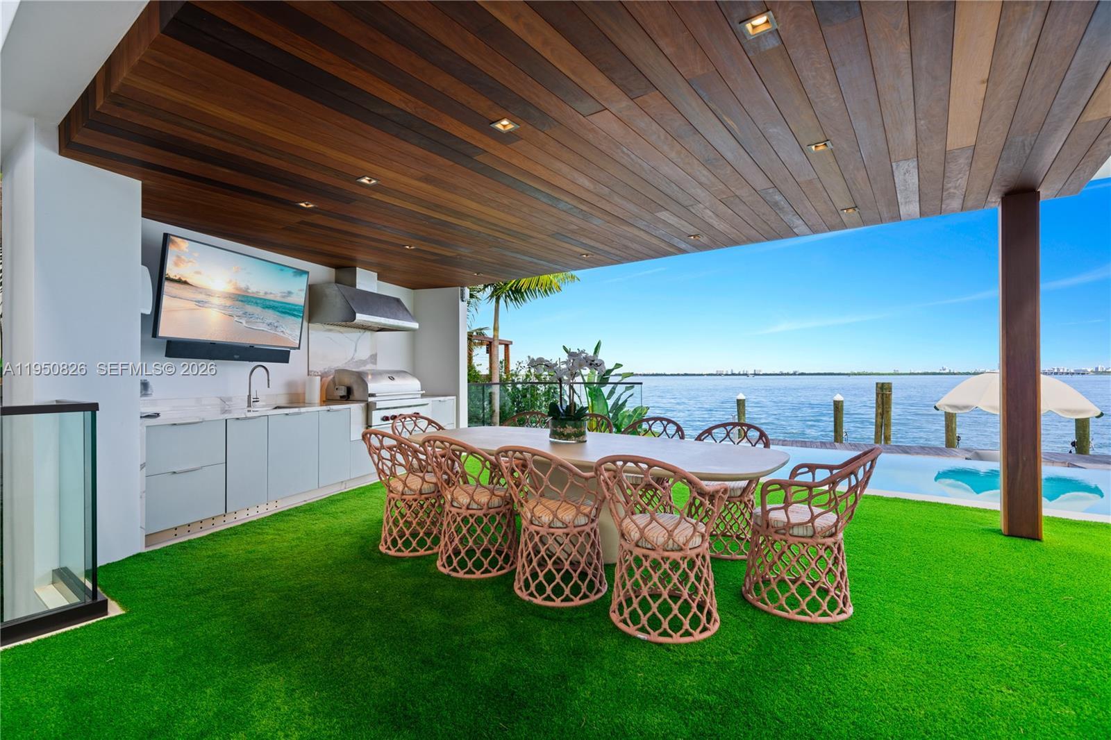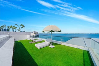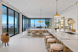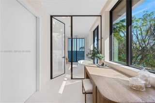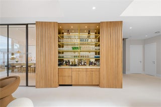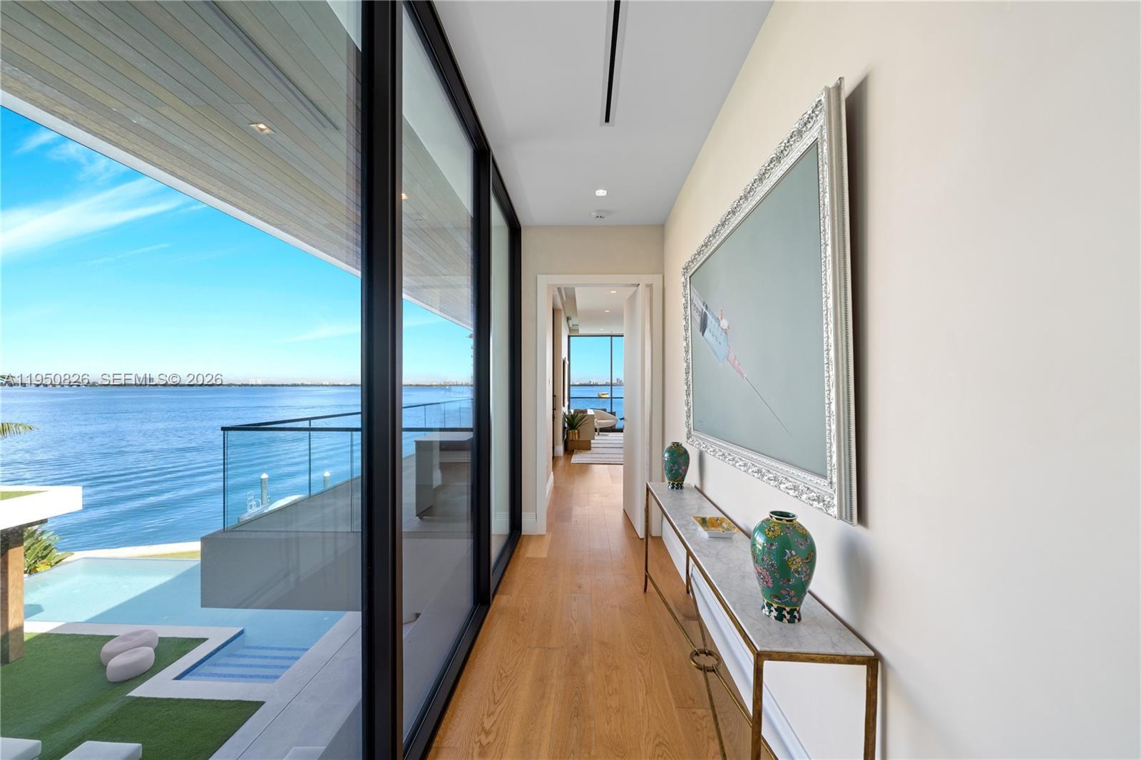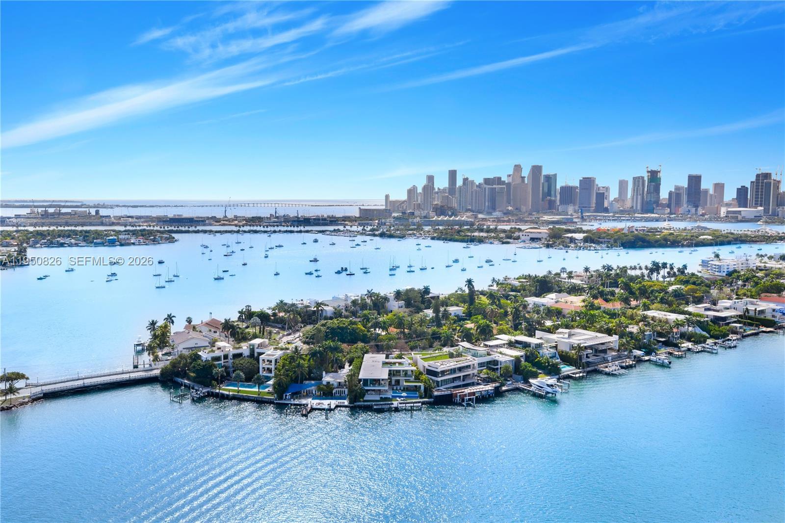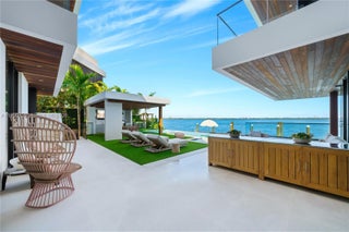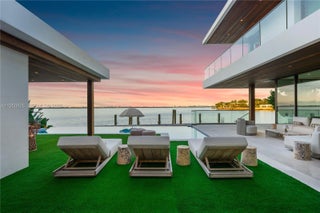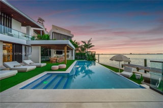 MODERN WATERFRONT RESIDENCE FEATURING CURATED LUXE INTERIORS SITTING ON THE OPEN BAY + CITY VIEWS ON THE EXCLUSIVE VENETIAN ISLANDS BY STRANG DESIGN! 5 beds + double offices & theater, 5 full baths + 2 powder rooms spanning 8,048 Adj SF living area on a 13,382 SF LOT w/ 104 FT of waterfront. Dramatic double-height entry & entertaining areas feature 25’ ceilings w/ custom Bocci chandelier & Nella Vetrina Italian doors + custom hidden bar. Chef’s kitchen w/ Wolf appliances, including gas range, double oven & coffee station. Sub-Zero fridge & wine storage. Ground-floor office, convertible to a bedroom, wrapped in Phillip Jeffries wallpaper + floor-to-ceiling built-in bookcases. Theater w/ State-of-the-art AV system featuring Bang & Olufsen surround sound system, Sony 4K HDR projector + separate wet bar & fridge. Primary suite w/ private terrace overlooking the Bay & City lights. Dedar wallpaper + dual walk-in closets. Primary bath w/ double vanity & electric frosted smart glass for privacy. Gym w/ PENT Equipment. Expansive Outdoor area w/ infinity-edge pool, outdoor kitchen w/ gas range + ipe dock. Rooftop terrace w/ open views of Miami and the Bay w/ storage & drink fridge. Smart Home technology includes Control4 automation, Sonos, Lutron lighting & fully motorized blackout shades in bedrooms & common areas. Fully secured w/ a wired alarm system, leak detection, a multi-camera security system & a whole-home gas generator. Gated Driveway for up to 4 cars + 2-car garage.