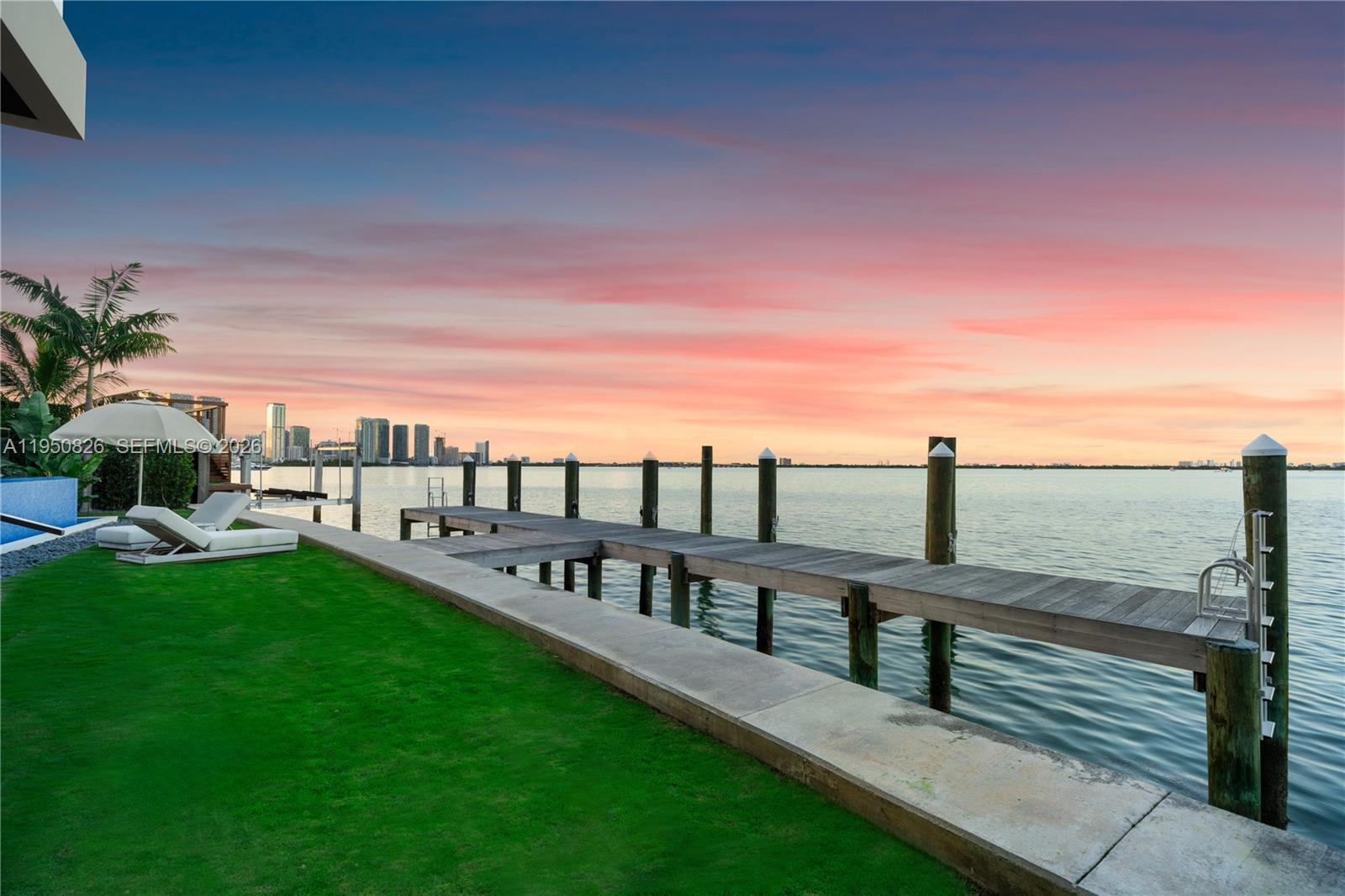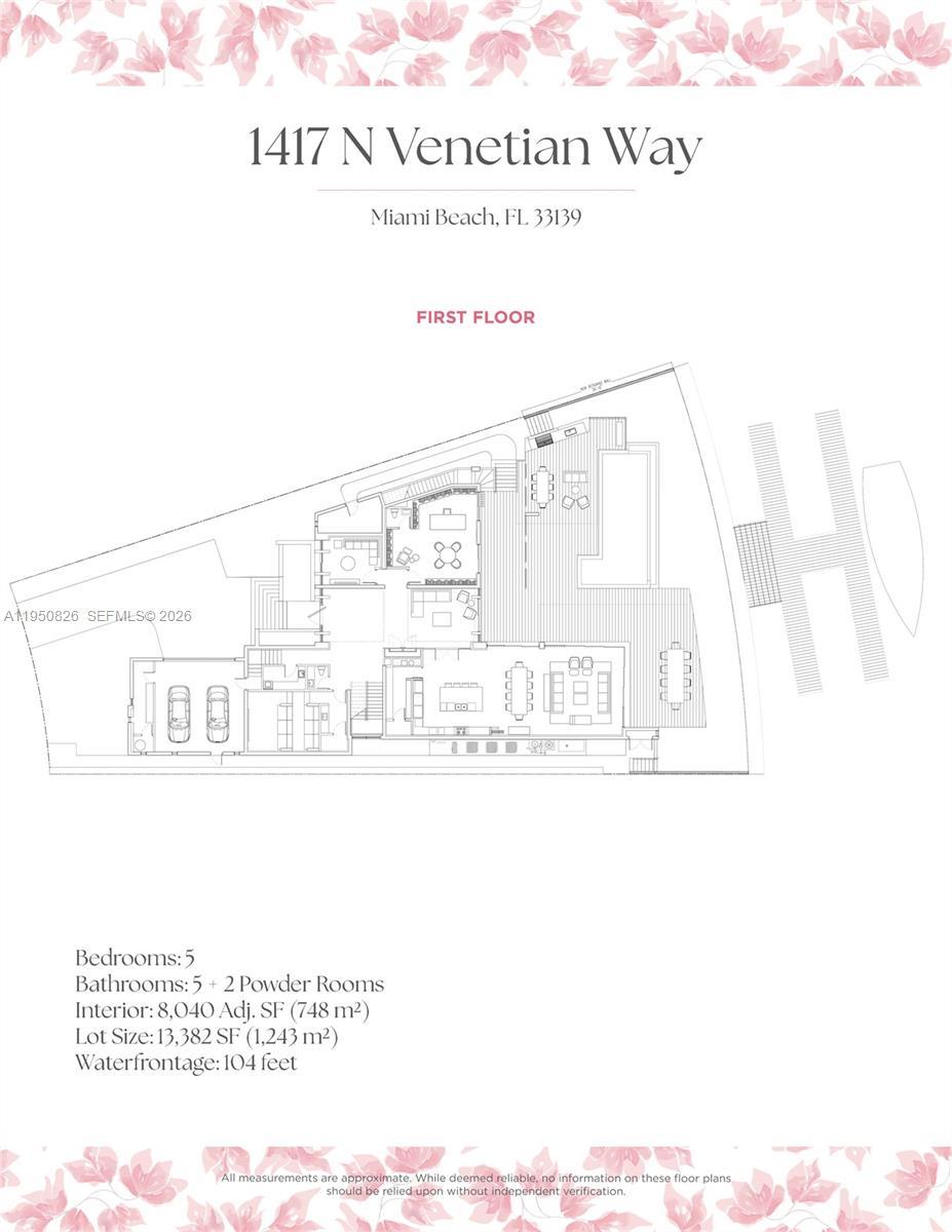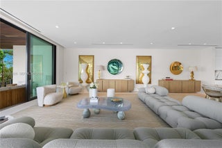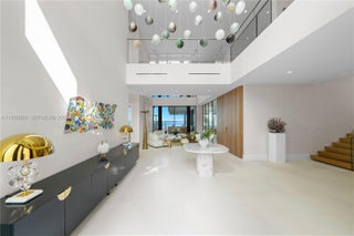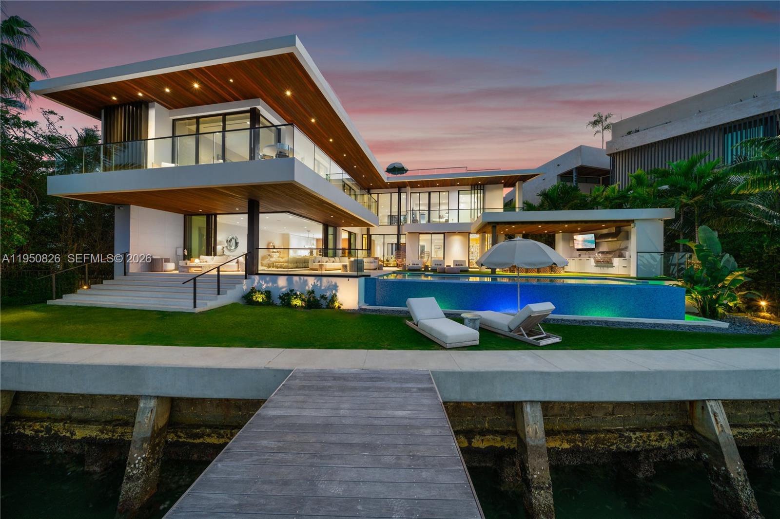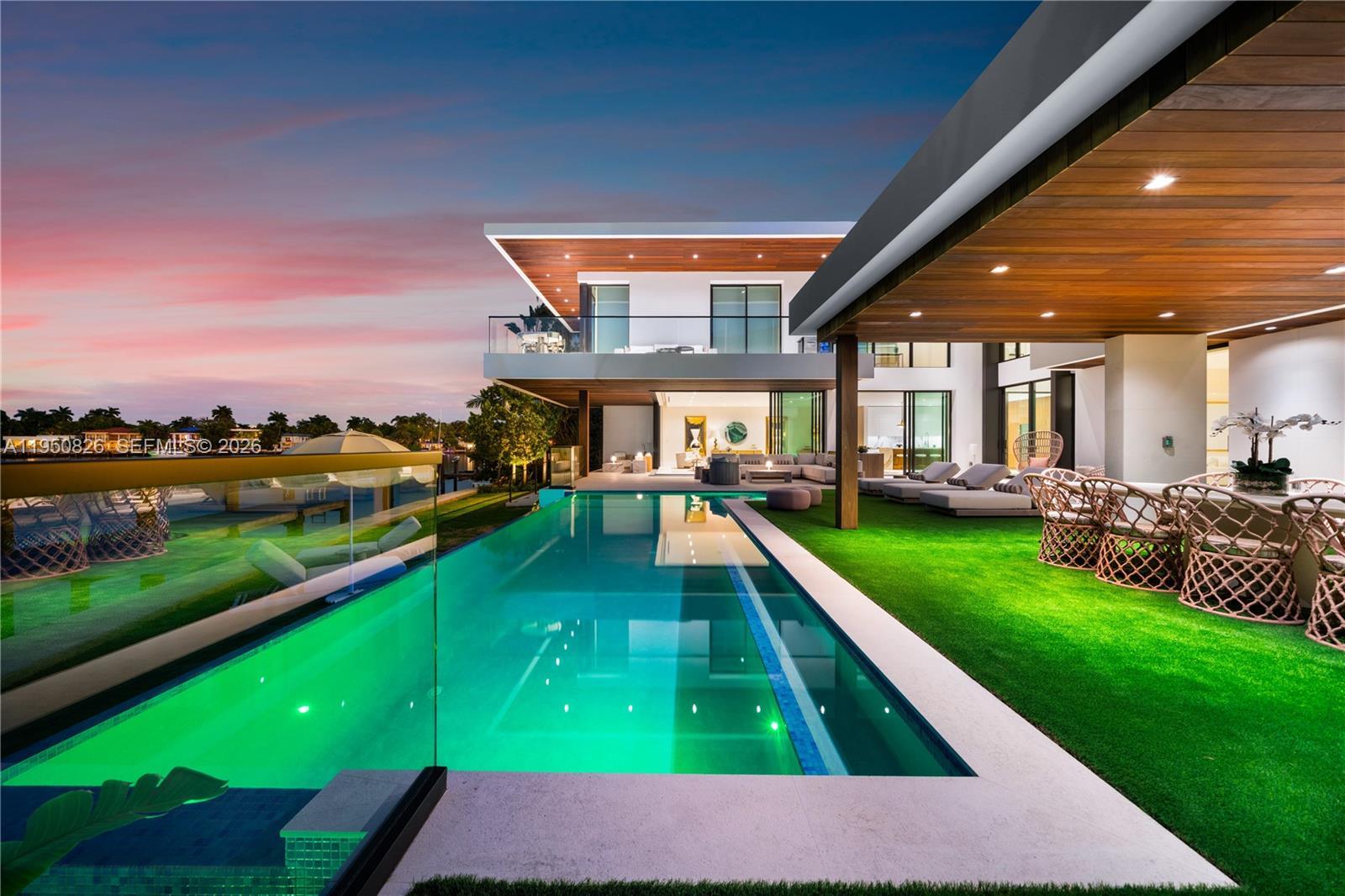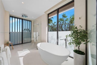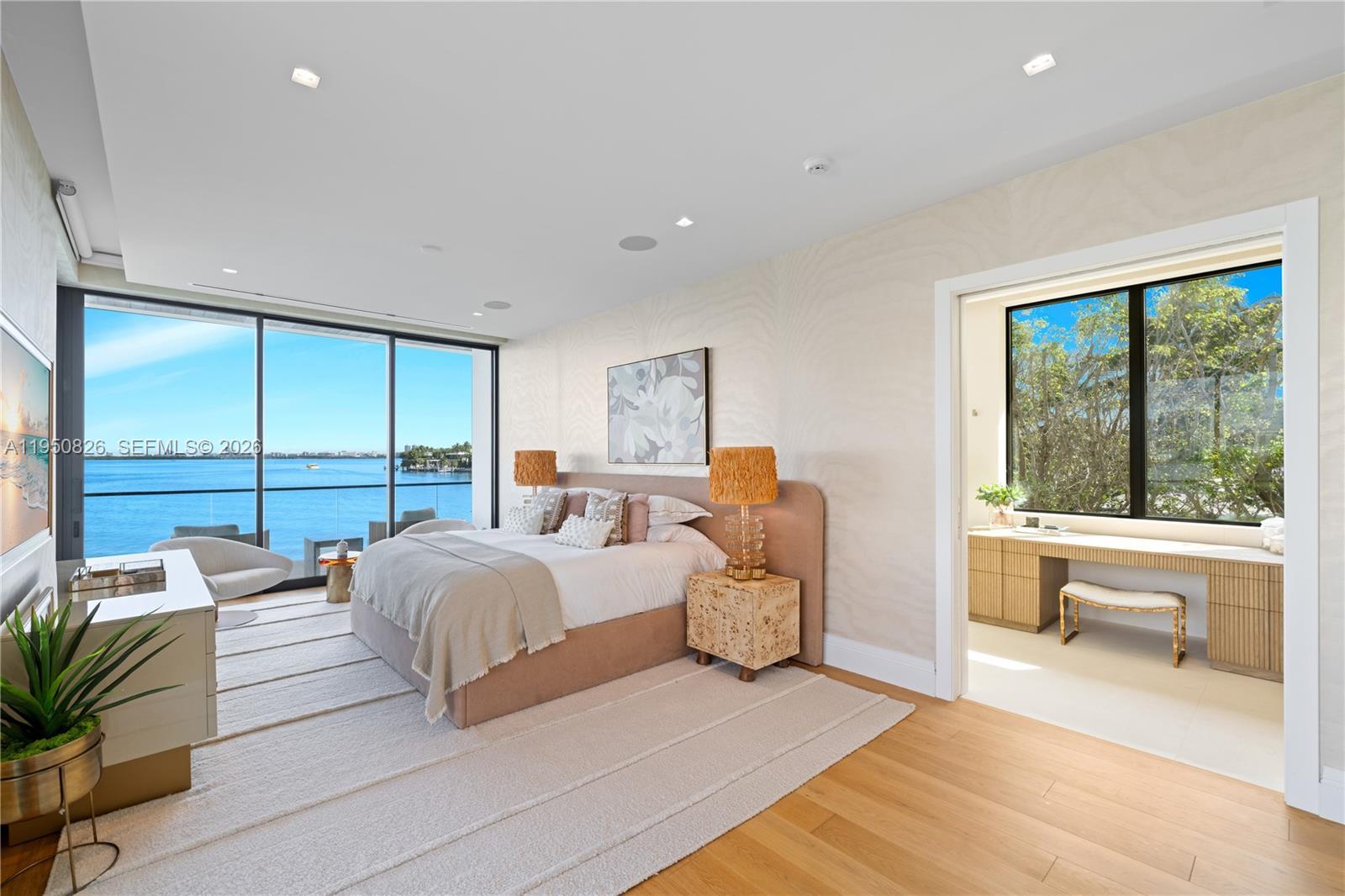 MODERN WATERFRONT RESIDENCE FEATURING CURATED LUXE INTERIORS SITTING ON THE OPEN BAY + CITY VIEWS ON THE EXCLUSIVE VENETIAN ISLANDS BY STRANG DESIGN! 5 beds + double offices & theater, 5 full baths + 2 powder rooms spanning 8,048 Adj SF living area on a 13,382 SF LOT w/ 104 FT of waterfront. Dramatic double-height entry & entertaining areas feature 25’ ceilings w/ custom Bocci chandelier & Nella Vetrina Italian doors + custom hidden bar. Chef’s kitchen w/ Wolf appliances, including gas range, double oven & coffee station. Sub-Zero fridge & wine storage. Ground-floor office, convertible to a bedroom, wrapped in Phillip Jeffries wallpaper + floor-to-ceiling built-in bookcases. Theater w/ State-of-the-art AV system featuring Bang & Olufsen surround sound system, Sony 4K HDR projector + separate wet bar & fridge. Primary suite w/ private terrace overlooking the Bay & City lights. Dedar wallpaper + dual walk-in closets. Primary bath w/ double vanity & electric frosted smart glass for privacy. Gym w/ PENT Equipment. Expansive Outdoor area w/ infinity-edge pool, outdoor kitchen w/ gas range + ipe dock. Rooftop terrace w/ open views of Miami and the Bay w/ storage & drink fridge. Smart Home technology includes Control4 automation, Sonos, Lutron lighting & fully motorized blackout shades in bedrooms & common areas. Fully secured w/ a wired alarm system, leak detection, a multi-camera security system & a whole-home gas generator. Gated Driveway for up to 4 cars + 2-car garage.
