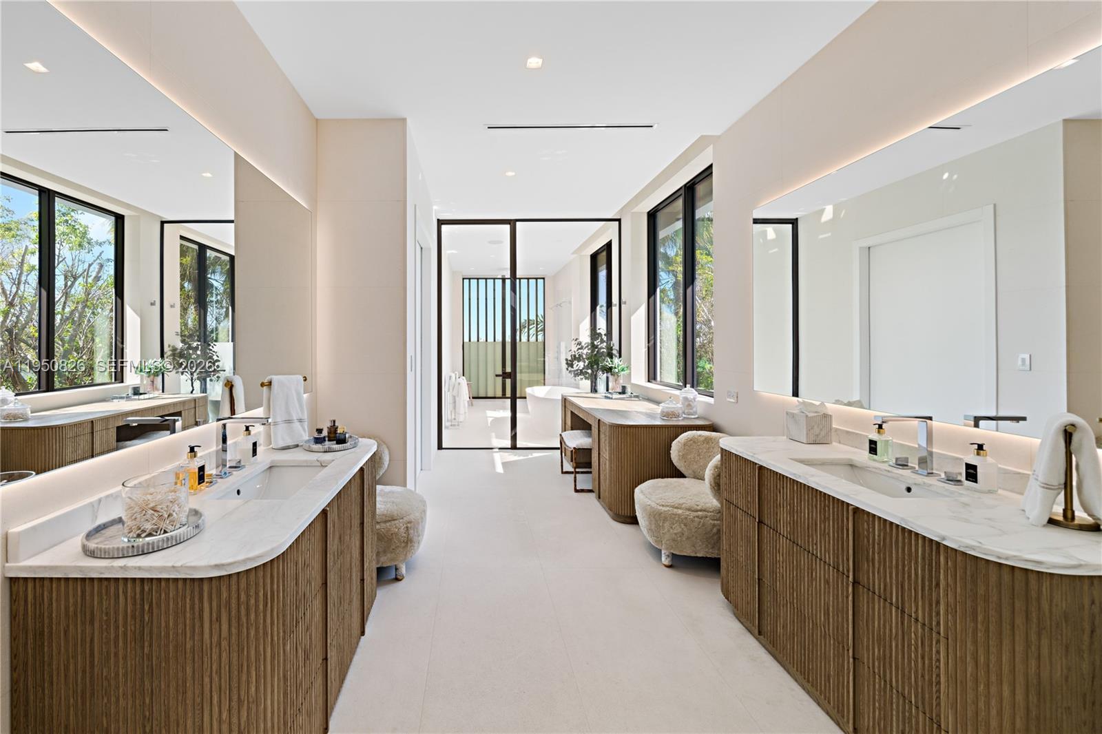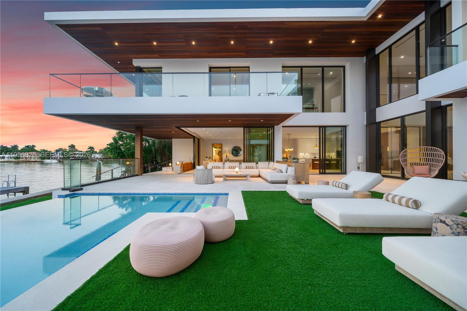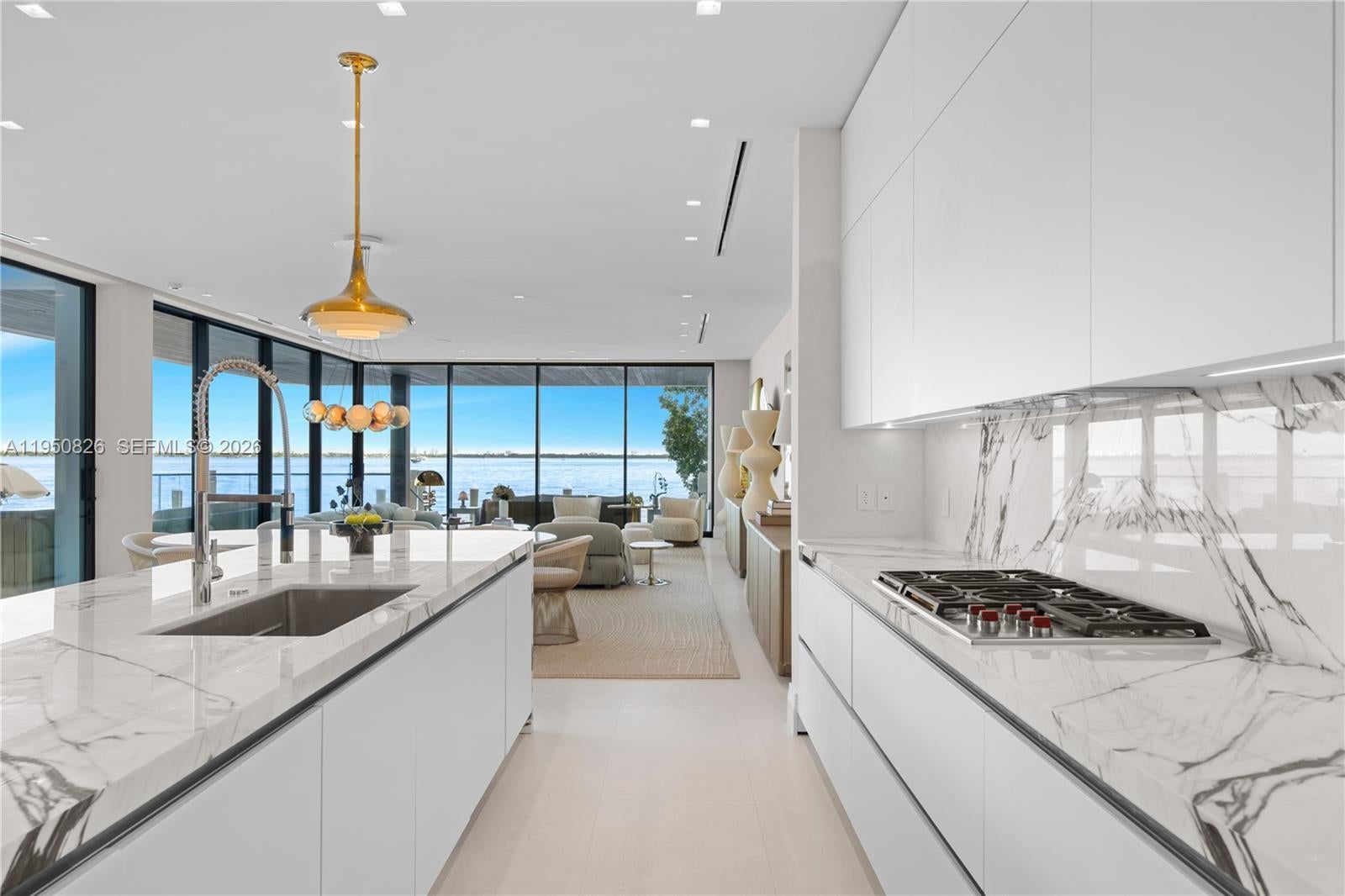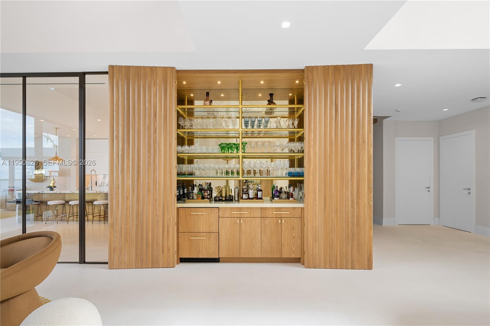 MODERN WATERFRONT RESIDENCE FEATURING CURATED LUXE INTERIORS SITTING ON THE OPEN BAY + CITY VIEWS ON THE EXCLUSIVE VENETIAN ISLANDS BY STRANG DESIGN! 5 beds + double offices & theater, 5 full baths + 2 powder rooms spanning 8,048 Adj SF living area on a 13,382 SF LOT w/ 104 FT of waterfront. Dramatic double-height entry & entertaining areas feature 25’ ceilings w/ custom Bocci chandelier & Nella Vetrina Italian doors + custom hidden bar. Chef’s kitchen w/ Wolf appliances, including gas range, double oven & coffee station. Sub-Zero fridge & wine storage. Ground-floor office, convertible to a bedroom, wrapped in Phillip Jeffries wallpaper + floor-to-ceiling built-in bookcases. Theater w/ State-of-the-art AV system featuring Bang & Olufsen surround sound system, Sony 4K HDR projector + separate wet bar & fridge. Primary suite w/ private terrace overlooking the Bay & City lights. Dedar wallpaper + dual walk-in closets. Primary bath w/ double vanity & electric frosted smart glass for privacy. Gym w/ PENT Equipment. Expansive Outdoor area w/ infinity-edge pool, outdoor kitchen w/ gas range + ipe dock. Rooftop terrace w/ open views of Miami and the Bay w/ storage & drink fridge. Smart Home technology includes Control4 automation, Sonos, Lutron lighting & fully motorized blackout shades in bedrooms & common areas. Fully secured w/ a wired alarm system, leak detection, a multi-camera security system & a whole-home gas generator. Gated Driveway for up to 4 cars + 2-car garage.
