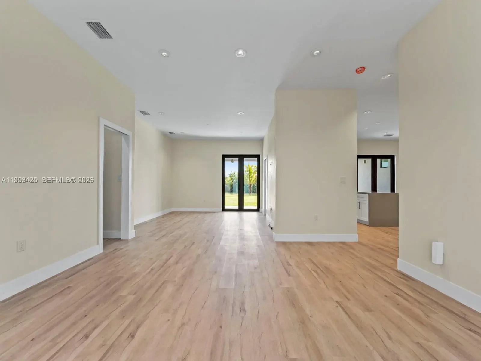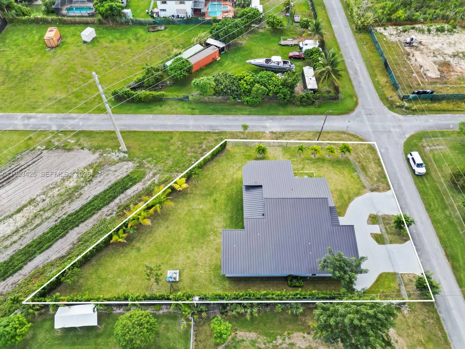 Elegant 4BD/4.5BA modern home with 12’ ceilings and waterproof vinyl flooring throughout. Each bedroom features a state-of-the-art bathroom and custom solid wood closet doors. Built for quality with a 40-year metal roof, impact windows & doors, and foam attic insulation. Dual new A/C units (5-ton & 3-ton, 10-yr warranty) and propane gas tank (10-yr warranty). Exterior highlights include an oversized 2-car garage, paver circular driveway, and covered patio pre-wired for fans, sink, and BBQ. Oversized septic, well water, and 8-camera security system. Situated on a 16,400 SF lot with two entrances and plenty of room for a pool, RV, or boat.