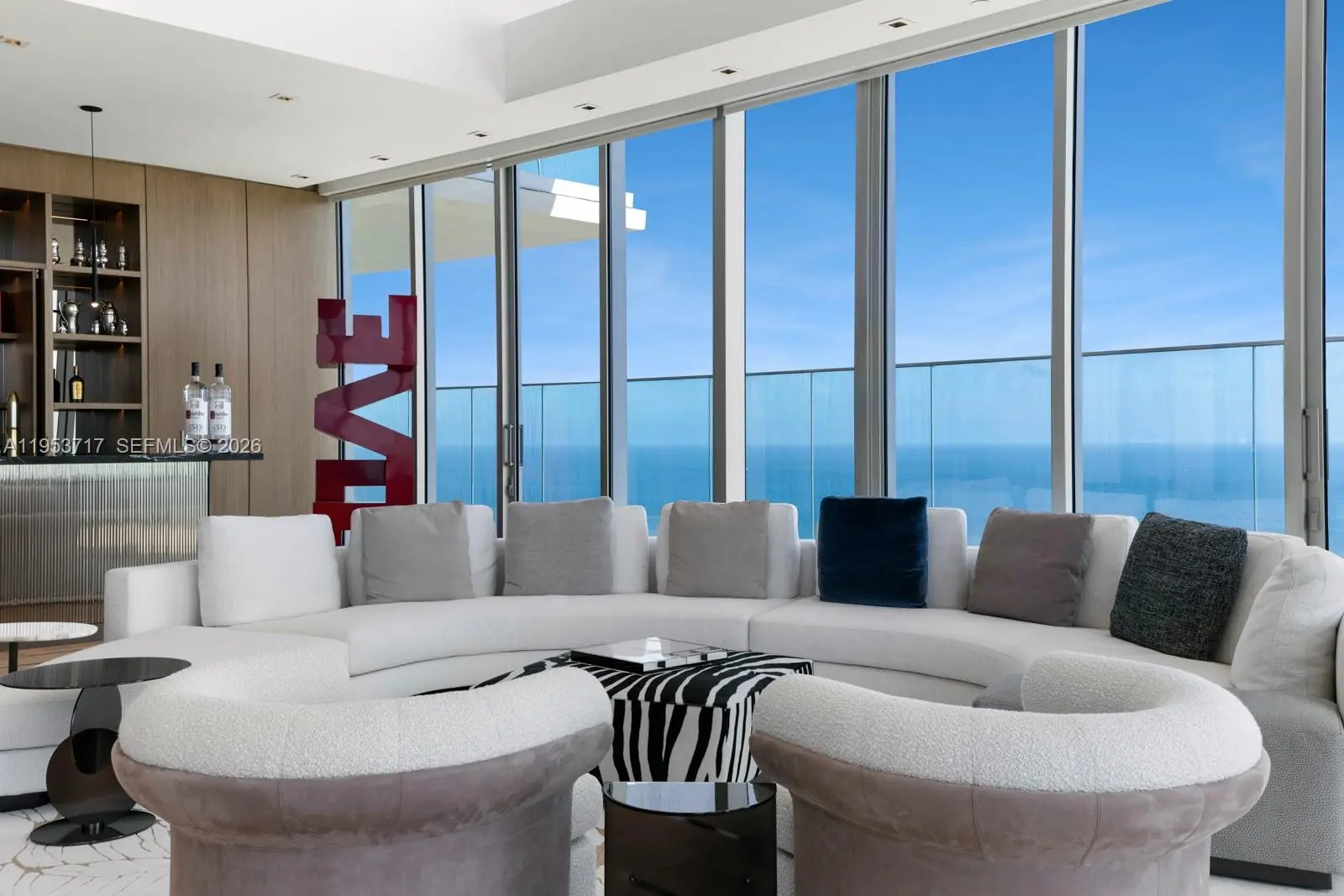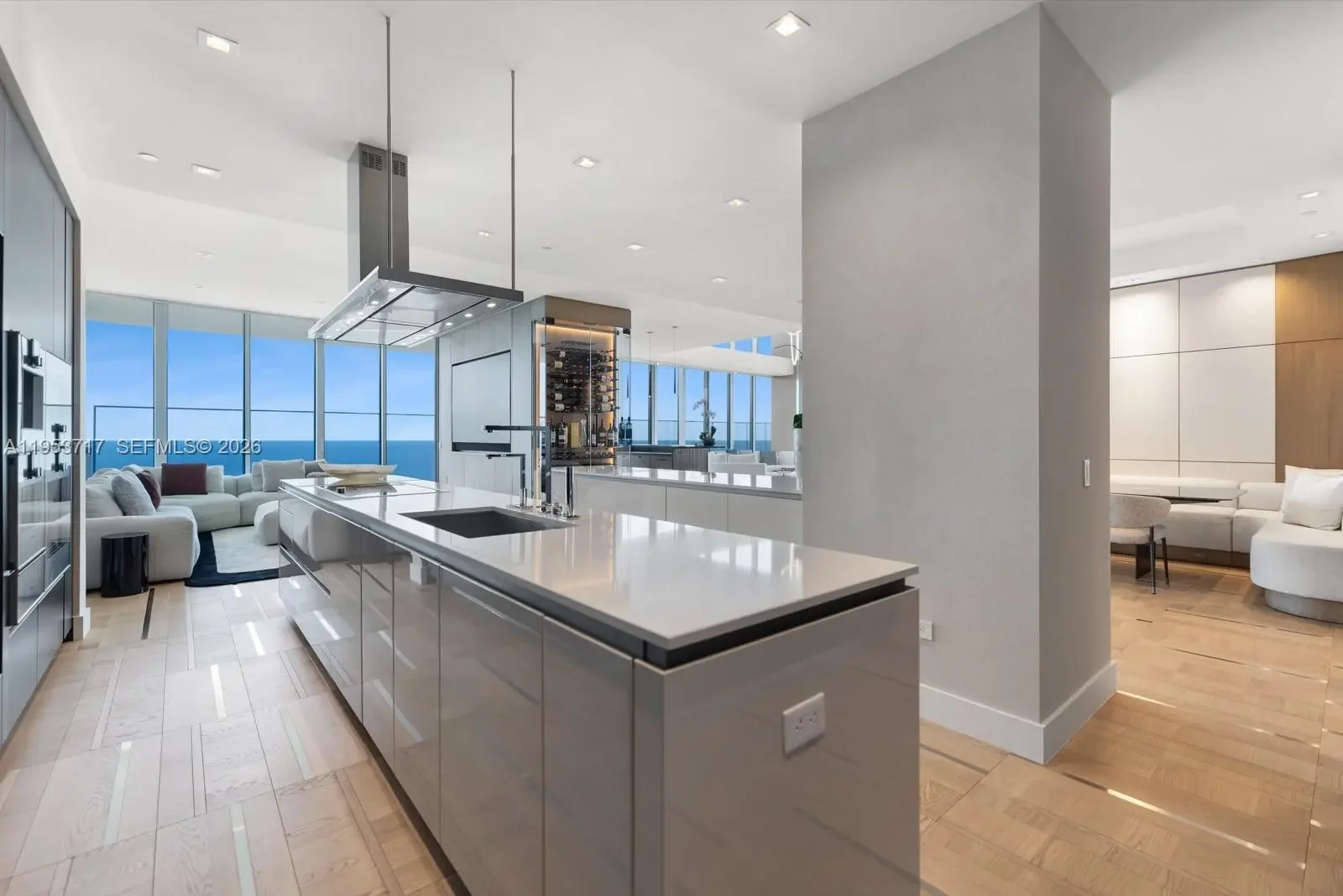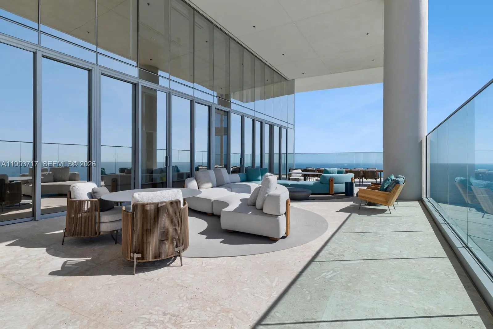 Exceptional sky villa at Turnberry Ocean Club offering approx. 11,300 SF total with 7,000 SF of refined interiors and 11’ ceilings, complemented by dramatic 22’ double-height foyer and living spaces. Coveted flow-through design captures breathtaking Atlantic Ocean and Intracoastal views. An expansive 4,000 SF covered loggia finished in coral stone and teak features a private pool, spa, built-in BBQ, and enhanced glass railings for seamless indoor-outdoor living. The oceanview primary suite is highlighted by a boutique-style dressing room with a walk-in safe overlooking the ocean. Along with luxurious ivory onyx his-and-her baths with Dornbracht fixtures and Toto Zero-Gravity Tub. Custom Snaidero cabinetry, Gaggenau appliances, designer bedroom suites with expanded closets, Control4 smart home, private beach cabana, and 4 parking spaces.