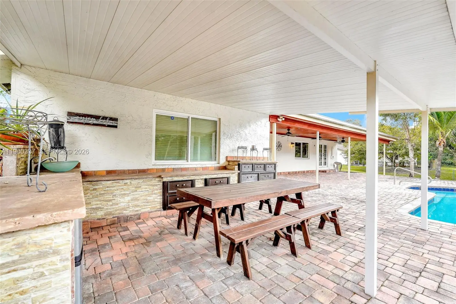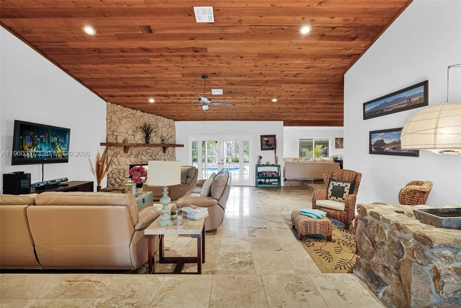 Spectacular residence located in the prestigious community of Southwest Ranches, offering privacy, space, and exclusive design. This impeccably maintained home features 4 bedrooms and 2.5 bathrooms, travertine marble floors throughout, and soaring vaulted ceilings beautifully finished with high-quality cedar wood, complemented by skylights that flood the home with natural light. The spacious layout includes a central island kitchen, expansive living areas, and a family room highlighted by a striking coral stone fireplace, creating a warm yet sophisticated atmosphere. Situated on an expansive lot just under one acre, the property offers a private pool, generous outdoor space, ample parking, and no HOA, providing maximum freedom and flexibility. Additional highlights include a roof replaced in 2020, impact windows, and a prime location near I-75, combining convenience with the tranquility and exclusivity that define Southwest Ranches. A rare opportunity to own a truly exceptional property with expansive spaces, timeless elegance, and meticulous care in one of South Florida’s most desirable communities.