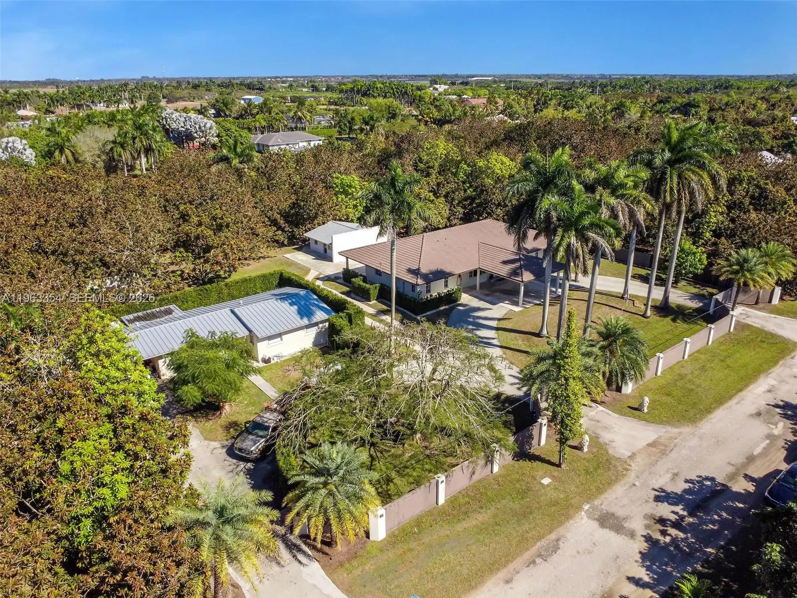 Prime Redlands agricultural compound with in-place income and agricultural exemption situated on 2.38 acres. Total living area is 4,979 SF across three separate structures, fully enclosed by a $200,000 perimeter fence with concrete footings (installed 2020) for maximum privacy and security. The main residence(2,911 sf) is a completely remodeled 3-bedroom, 3.5-bath home featuring 2024 renovations including a new kitchen with custom cabinetry and island, updated bathrooms, new flooring, new millwork and doors, and upgraded plumbing and fixtures. The detached guest house(1,270 sf) offers 3 bedrooms and 2 bathrooms with a new 2024 metal roof. The fully remodeled detached apartment(550 sf) features 1 bedroom and 1 bathroom, also with a new 2024 metal roof. The main house and guest house are separated by hedges and have independent entrances, creating a true compound layout ideal for multigenerational living or rental flexibility. Agricultural income averages approximately $29,000 annually from 165 mature Mamey and avocado trees. Additional income potential includes approximately $3,000 per month from the guest house and $1,500 per month from the apartment. Property features include irrigation system throughout, water filtration system, well and septic, and roof encapsulated in concrete for added durability. Agricultural exemption means low property taxes. Rare opportunity to acquire a turnkey, income-producing agricultural estate in the heart of the Redlands.