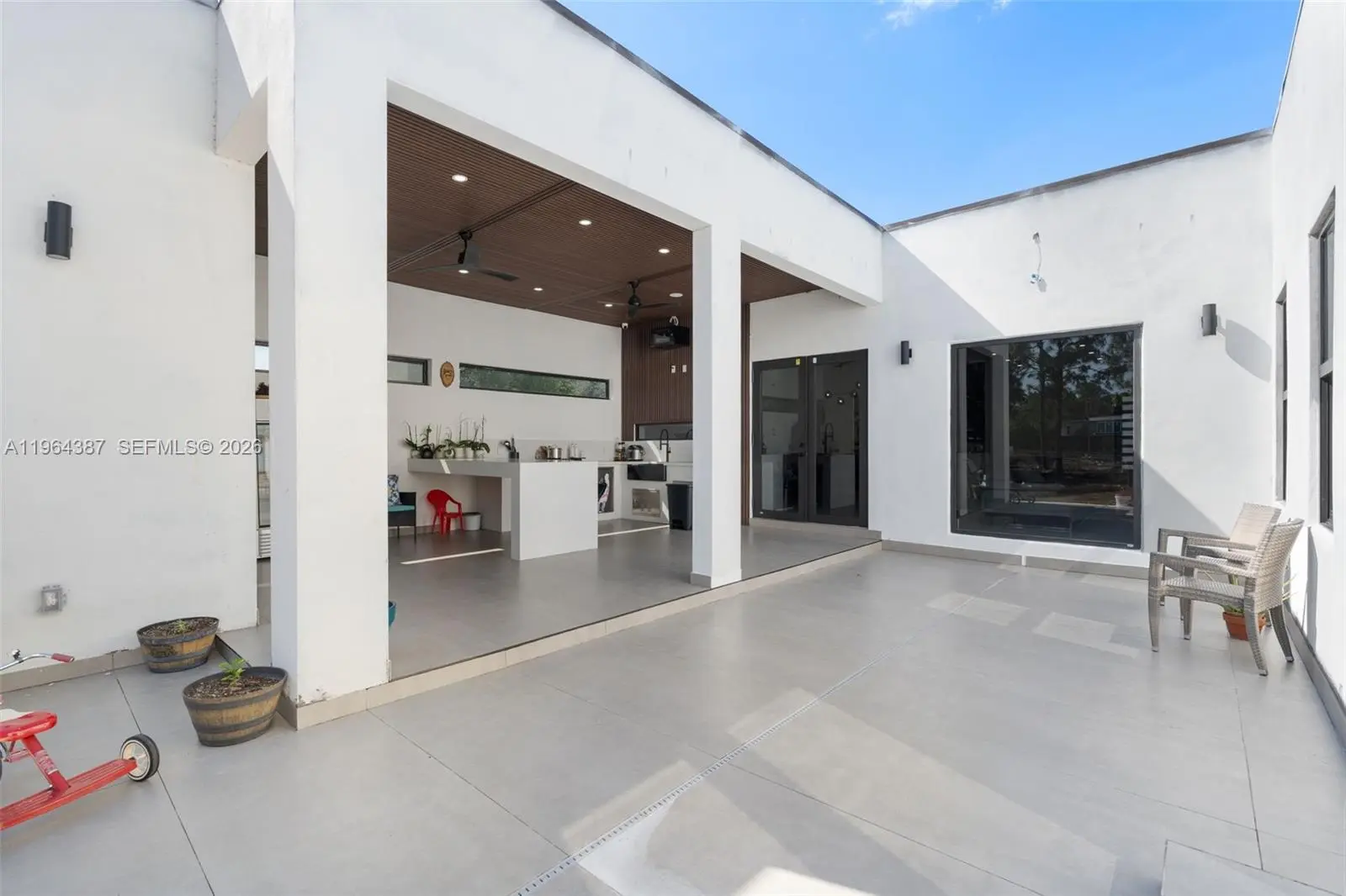 Brand-new modern construction on a spacious 1.09-acre lot with no HOA. The home offers approximately 2,800 SF of living area and approximately 3,200 SF under roof, featuring a bright open floor plan with a large living area, expansive kitchen with pantry, and sleek contemporary finishes throughout. The generous primary suite offers multiple closets and a private bath, while additional bedrooms and full baths provide flexibility for guests or home office use. Impact windows and impact doors throughout. Enjoy seamless indoor-outdoor living with an oversized covered patio featuring an outdoor kitchen. The property includes a covered livestock shelter, offering additional functionality for agricultural use, storage, or equipment. Ample parking and plenty of room for future improvements such as a pool, guest house, or expanded outdoor living. A rare opportunity to own new construction with space, style, and freedom.
