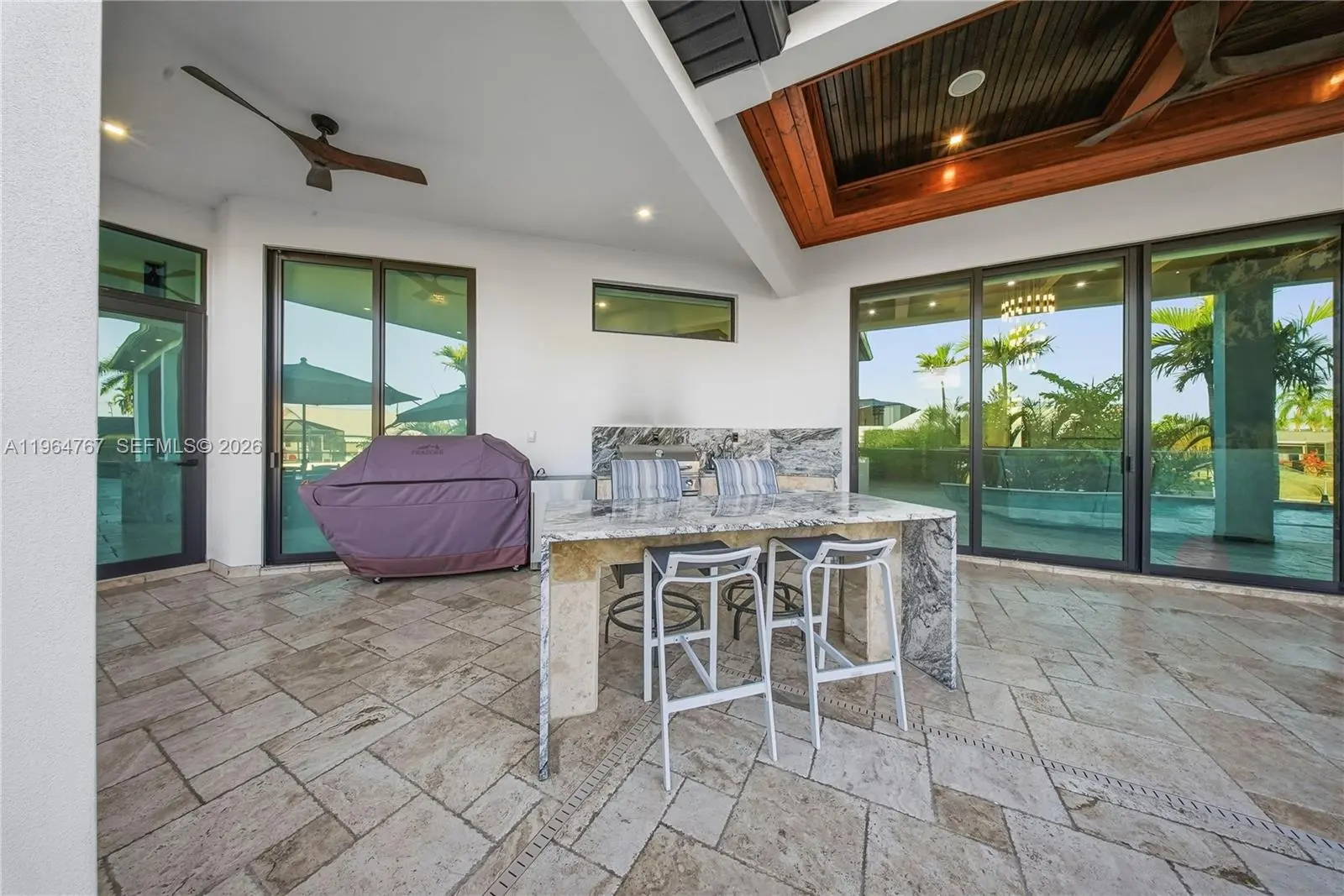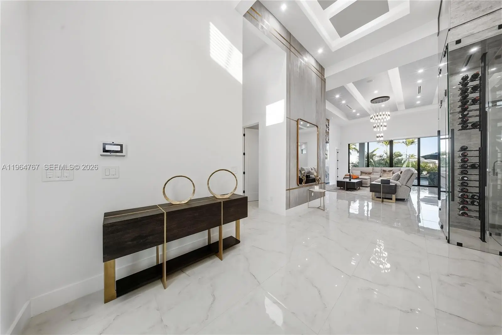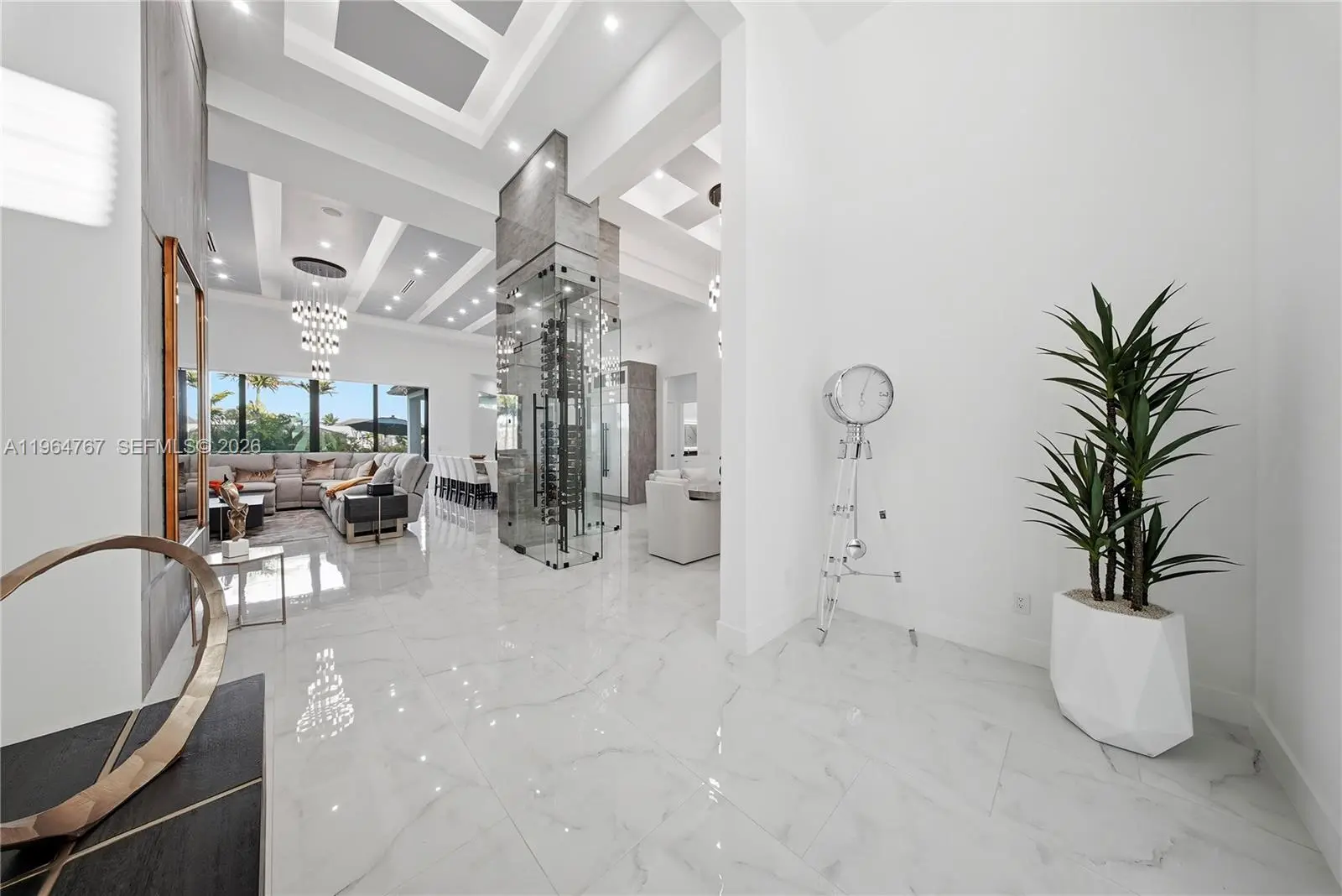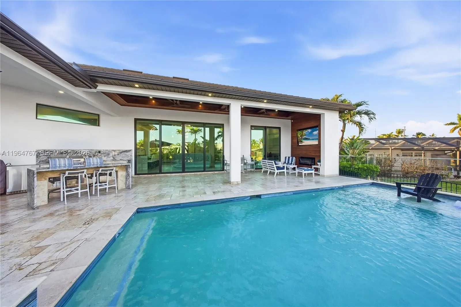 Luxury Home located in the prestigious Yacht Club area of Cape Coral, offering sailboat access just minutes to the river and Gulf. This over 3,200 sq. ft. custom-built home features 4 bedrooms plus den, flex room, and 4.5 bathrooms. Built in 2023 with exceptional architectural detail throughout! Upon entry, a dramatic, glass-encased, temperature-controlled wine display exceeding 10 feet sets the tone for refined living. The designer European-style kitchen showcases custom cabinetry, Jenn Air appliances, built-in espresso machine, and an impressive 13-foot, two-level quartz waterfall island. Coffered, layered, and custom-designed ceilings complement the expansive living area with soaring 16-foot ceilings, a striking accent wall, and built-in electric fireplace. Bedrooms feature 12-foot ceilings, while the primary suite offers a spa-like retreat with an expansive wet room featuring dual showers and a large soaking tub. Impact windows and doors throughout provide peace of mind. Outdoor living is equally exceptional with heated saltwater pool and spa accented by glass railings, travertine decking, outdoor shower, tiki hut, and a 17,000 lb. boat lift. The covered lanai features wood ceilings, outdoor kitchen, built-in TV, and electric fireplace—perfect for entertaining year-round. Additional highlights include a spacious 3 car garage, central vacuum system, built-in surround sound, generator hookup, and an integrated smart home security system. Minutes to downtown Cape Coral