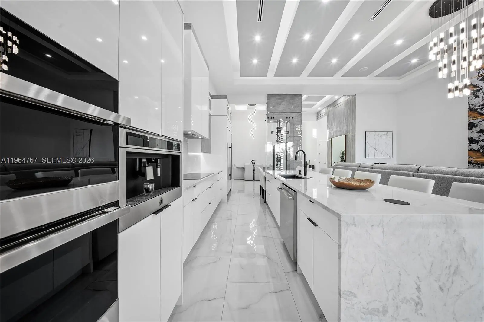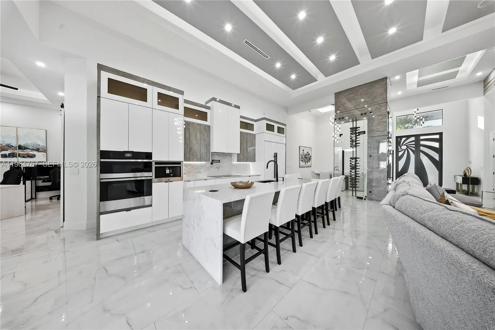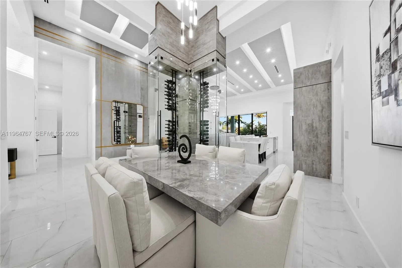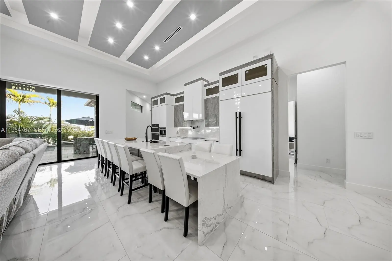 Luxury Home located in the prestigious Yacht Club area of Cape Coral, offering sailboat access just minutes to the river and Gulf. This over 3,200 sq. ft. custom-built home features 4 bedrooms plus den, flex room, and 4.5 bathrooms. Built in 2023 with exceptional architectural detail throughout! Upon entry, a dramatic, glass-encased, temperature-controlled wine display exceeding 10 feet sets the tone for refined living. The designer European-style kitchen showcases custom cabinetry, Jenn Air appliances, built-in espresso machine, and an impressive 13-foot, two-level quartz waterfall island. Coffered, layered, and custom-designed ceilings complement the expansive living area with soaring 16-foot ceilings, a striking accent wall, and built-in electric fireplace. Bedrooms feature 12-foot ceilings, while the primary suite offers a spa-like retreat with an expansive wet room featuring dual showers and a large soaking tub. Impact windows and doors throughout provide peace of mind. Outdoor living is equally exceptional with heated saltwater pool and spa accented by glass railings, travertine decking, outdoor shower, tiki hut, and a 17,000 lb. boat lift. The covered lanai features wood ceilings, outdoor kitchen, built-in TV, and electric fireplace—perfect for entertaining year-round. Additional highlights include a spacious 3 car garage, central vacuum system, built-in surround sound, generator hookup, and an integrated smart home security system. Minutes to downtown Cape Coral