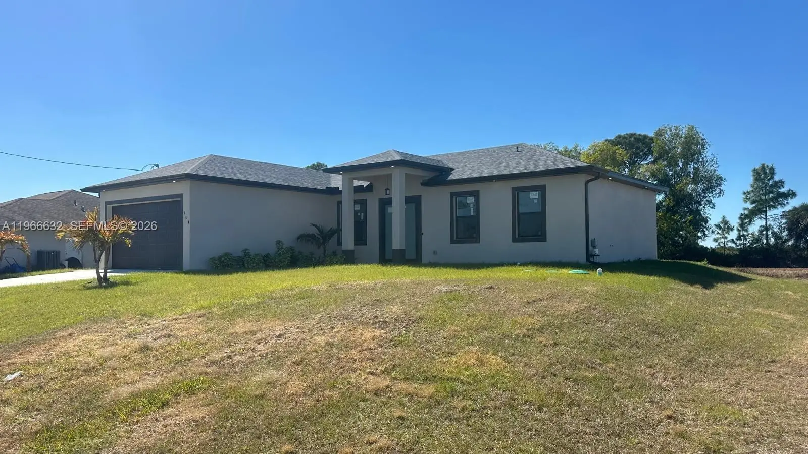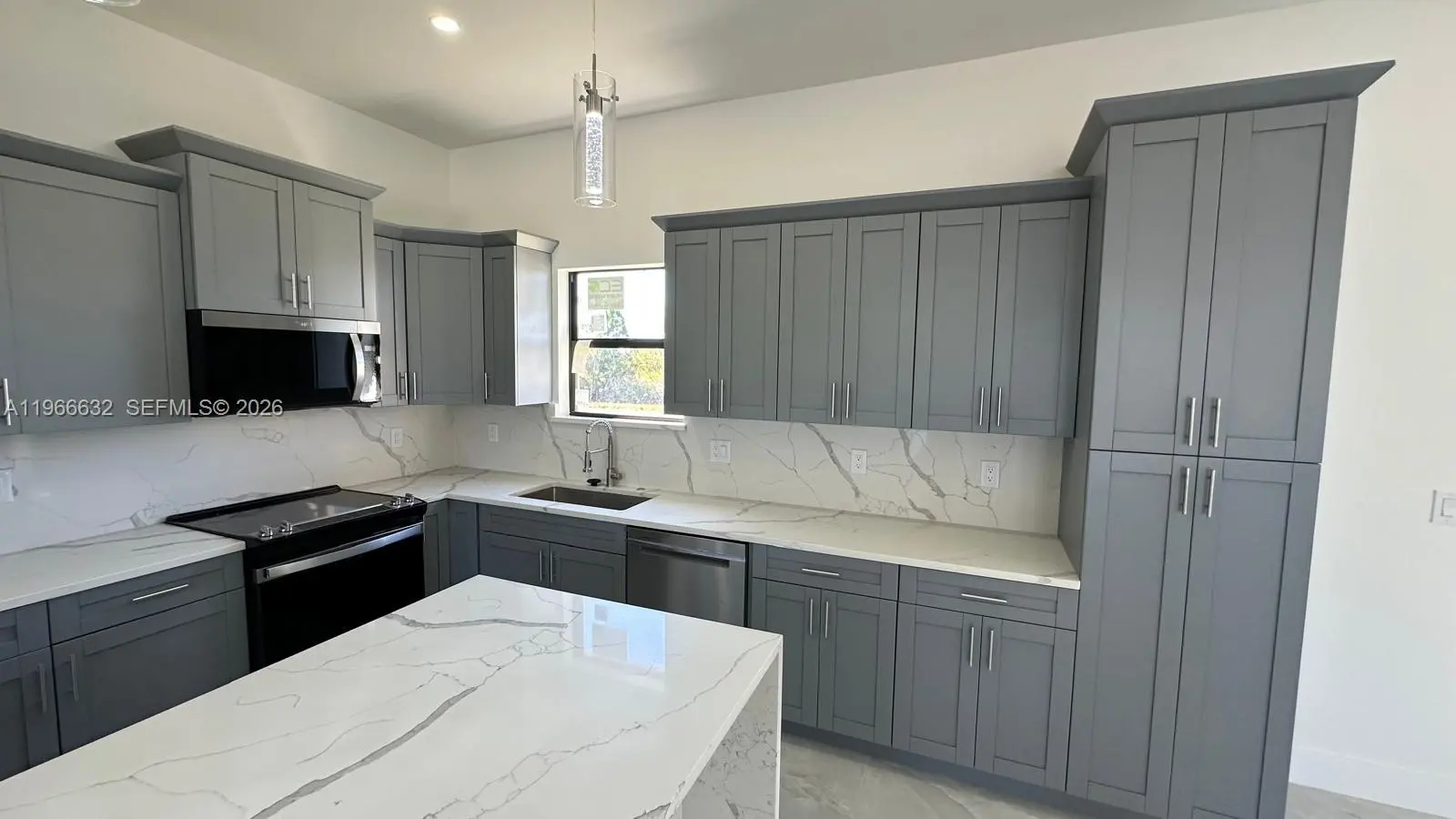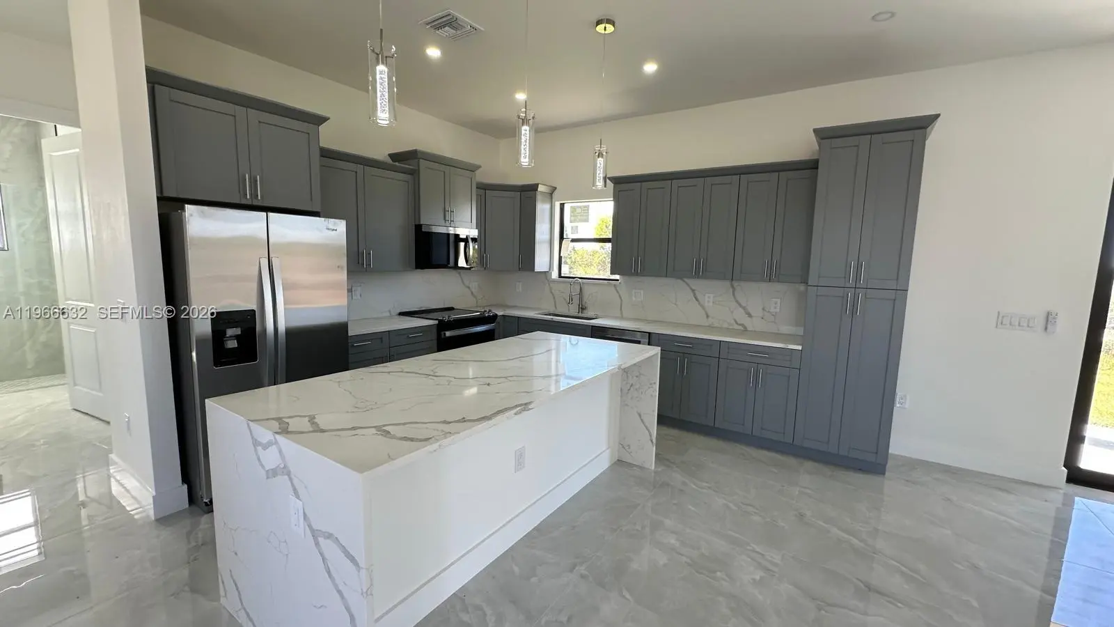 BRAND NEW CONSTRUCTION ON A CANAL LOT New 3 Bedroom/2 Bathroom/Den and 2 Car Garage 0.34 Acre Lot In Lehigh Acres. The kitchen features quartz countertops, soft-close shaker cabinets, and stainless-steel appliances, including a refrigerator, range, dishwasher, and microwave. Designed with convenience and comfort in mind, the home includes impact-resistant doors and windows, ceiling fans in every room, a full size laundry room, master suite boasts dual sinks and a walk-in shower. A two-car attached garage and room for a pool add to the property’s appeal. Also have gutters around all the house and irrigation system. . Epoxy Coating In The Garage And On The Open Lania. No HOA and CDD