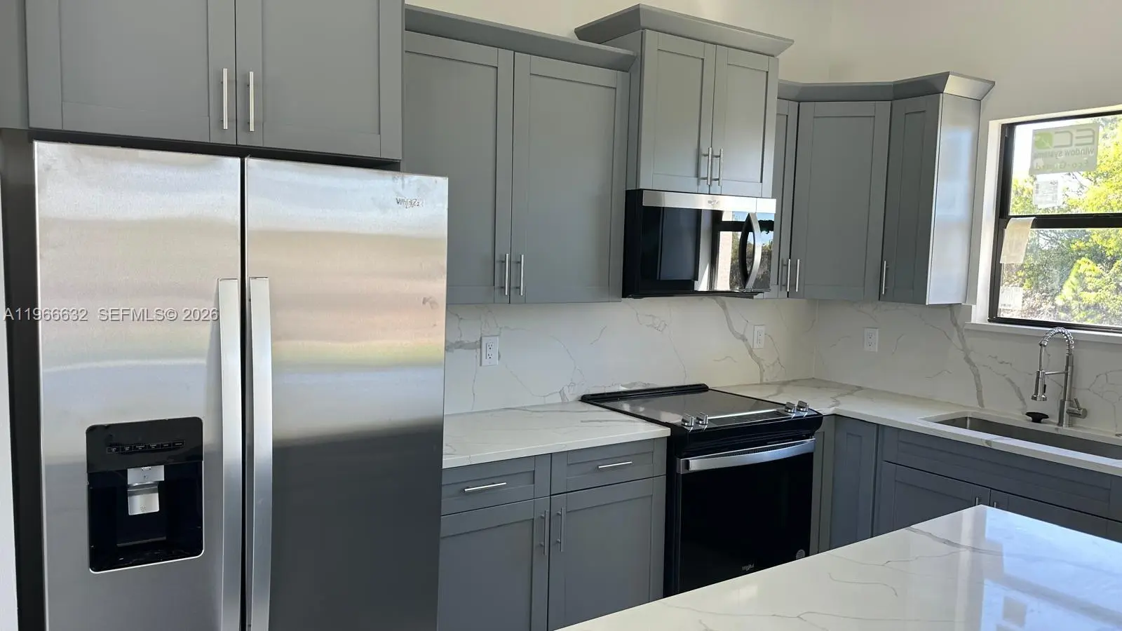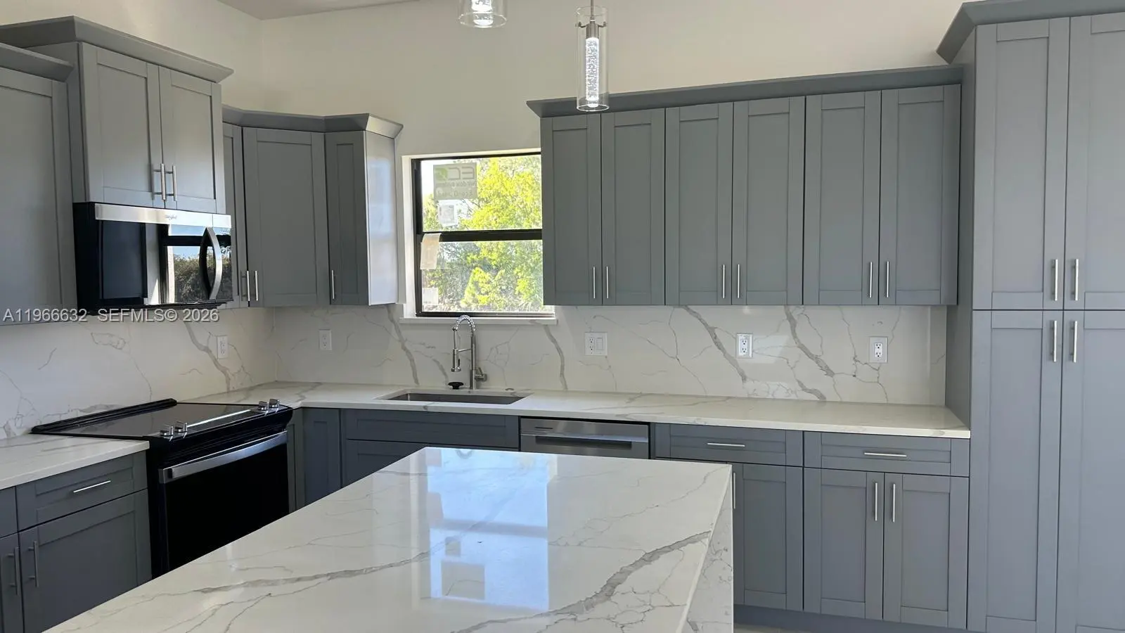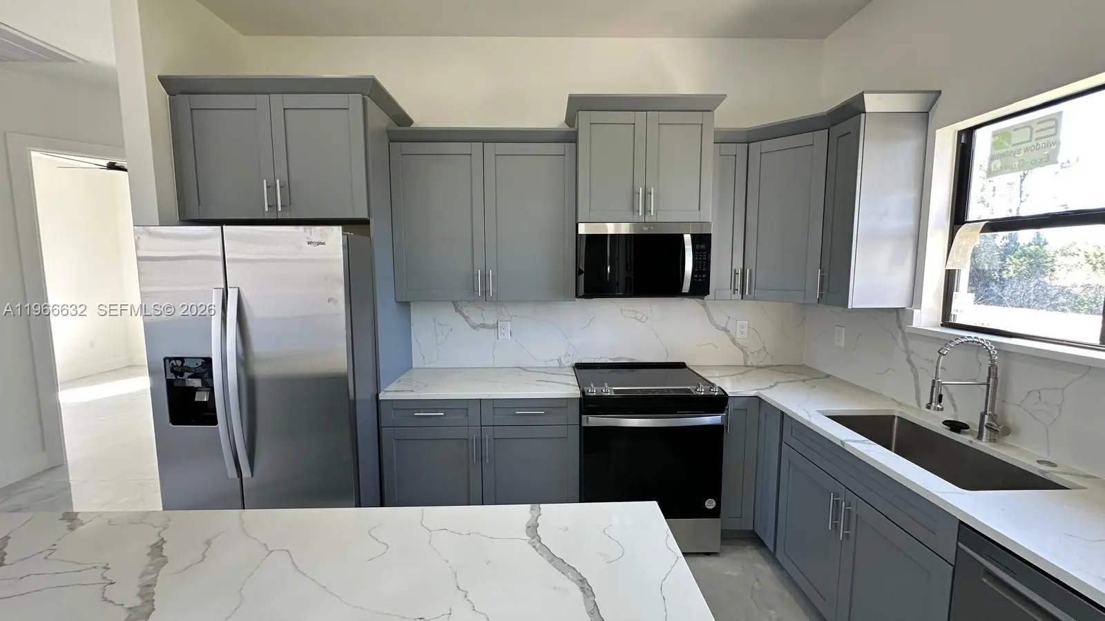 BRAND NEW CONSTRUCTION ON A CANAL LOT New 3 Bedroom/2 Bathroom/Den and 2 Car Garage 0.34 Acre Lot In Lehigh Acres. The kitchen features quartz countertops, soft-close shaker cabinets, and stainless-steel appliances, including a refrigerator, range, dishwasher, and microwave. Designed with convenience and comfort in mind, the home includes impact-resistant doors and windows, ceiling fans in every room, a full size laundry room, master suite boasts dual sinks and a walk-in shower. A two-car attached garage and room for a pool add to the property’s appeal. Also have gutters around all the house and irrigation system. . Epoxy Coating In The Garage And On The Open Lania. No HOA and CDD