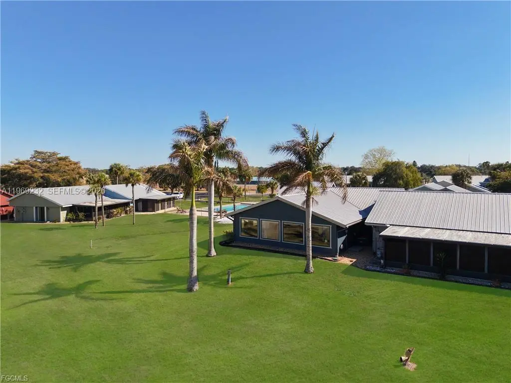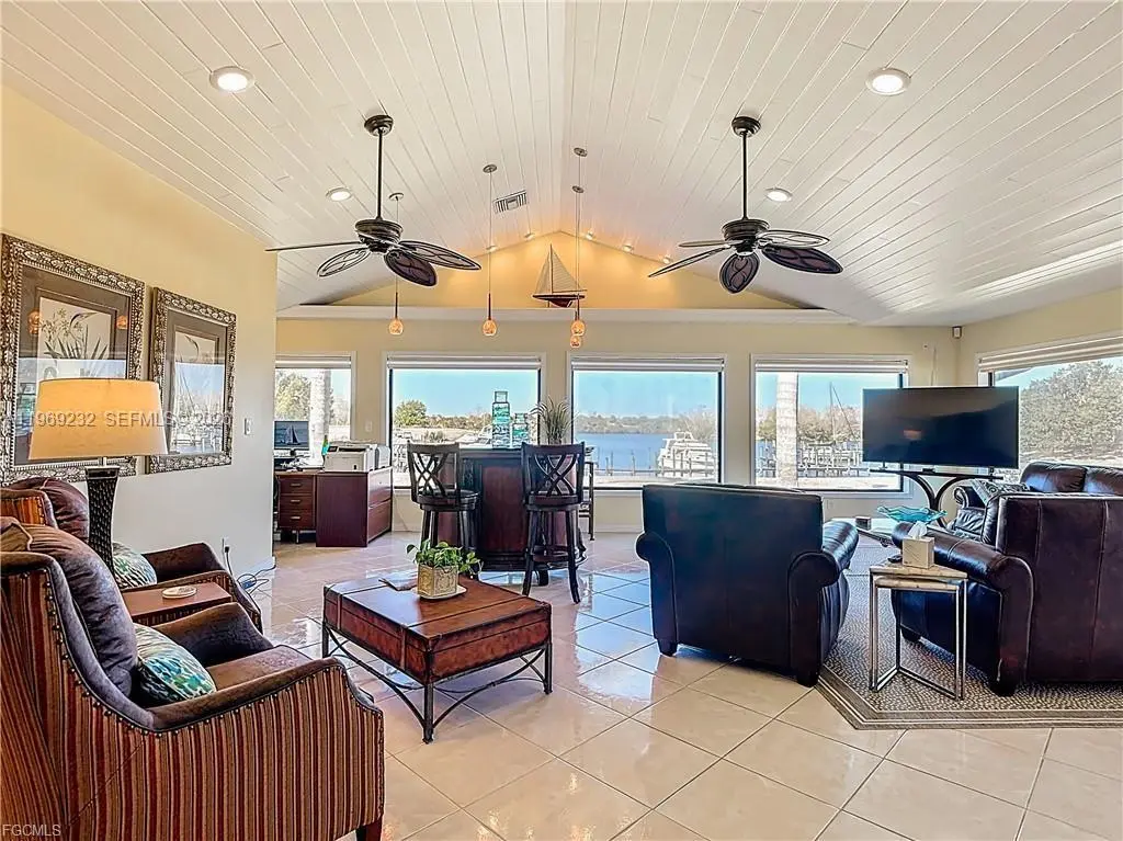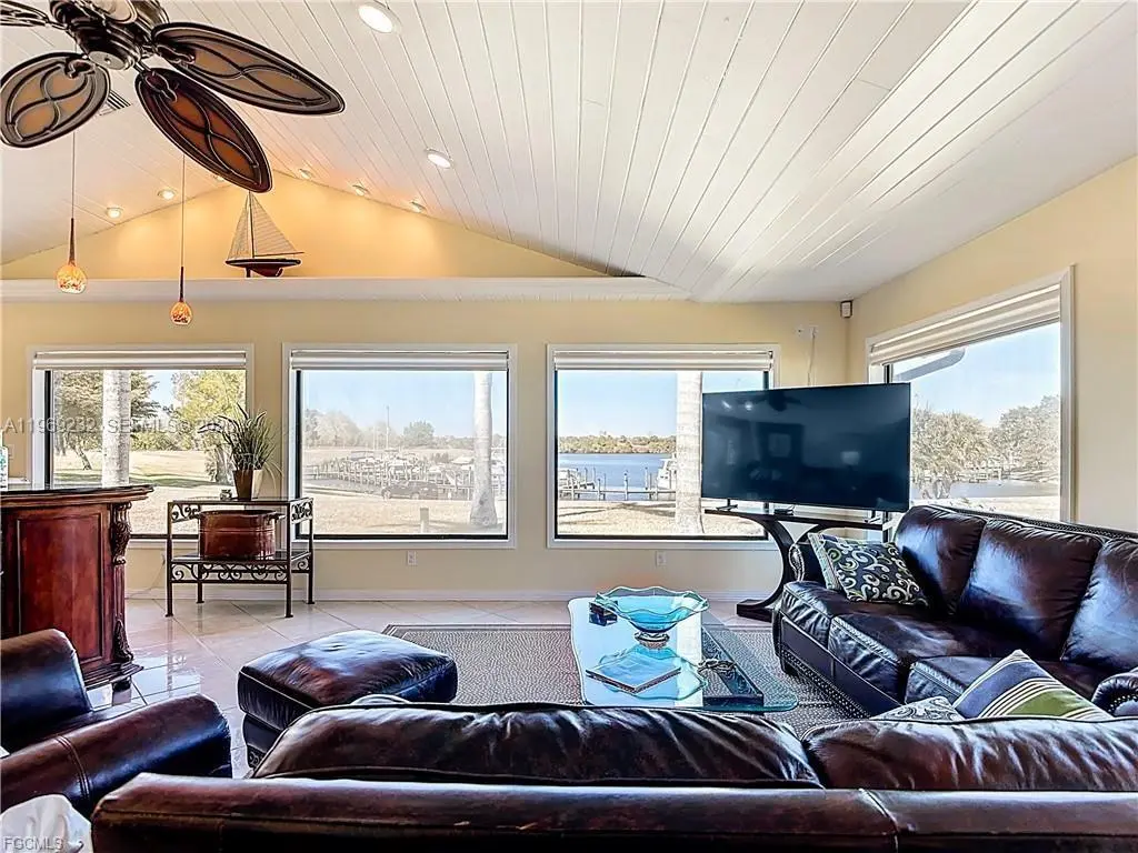 Welcome to one of the most desirable villas in Port LaBelle, perfectly situated on the Port LaBelle Marina along the Caloosahatchee River—part of the Intracoastal Waterway—where a constant parade of boats creates an ever-changing waterfront backdrop. This fully renovated 2-bedroom, 2-bath end-unit villa offers the best waterfront view in the community. Elegant décor highlights spectacular north-facing water views from the family room, which features a vaulted ceiling, oversized windows, ceramic tile flooring, and a built-in refrigerator. A charming stained-glass door leads to the exterior, and a dedicated office nook adds flexibility to the space. The open kitchen and dining area create a welcoming front entry and were thoughtfully remodeled with custom cabinetry, upgraded appliances, and a large picture window that brings the outdoors in. The guest bedroom includes an en-suite bath, while the primary bedroom features a spacious walk-in closet addition. A convenient laundry closet includes a new full-sized washer and dryer. Additional features: screened entry porch, Hardie board exterior for low maintenance, impact windows, two electric services, and metal galvalume roof. The villa’s location adjoins the community swimming pool, offering easy access while still maintaining a private, peaceful feel. The community is known for being exceptionally safe, quiet, and welcoming. A rare opportunity to enjoy waterfront living, low maintenance, and an unbeatable view in Port LaBelle.