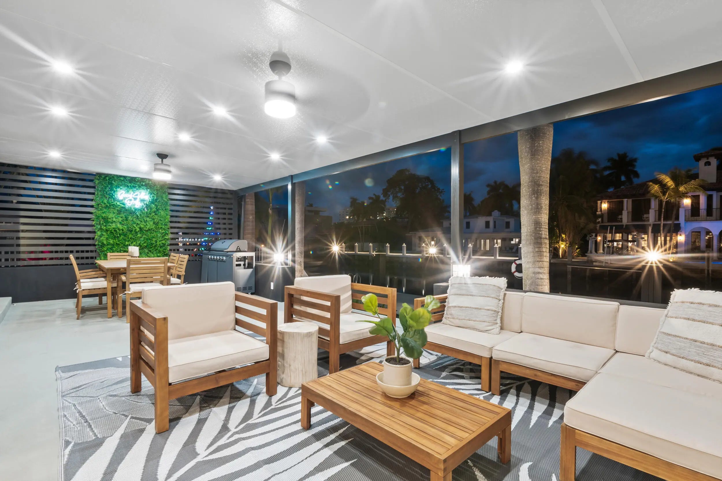 Awning(s), Barbecue, Custom Lighting, Balcony