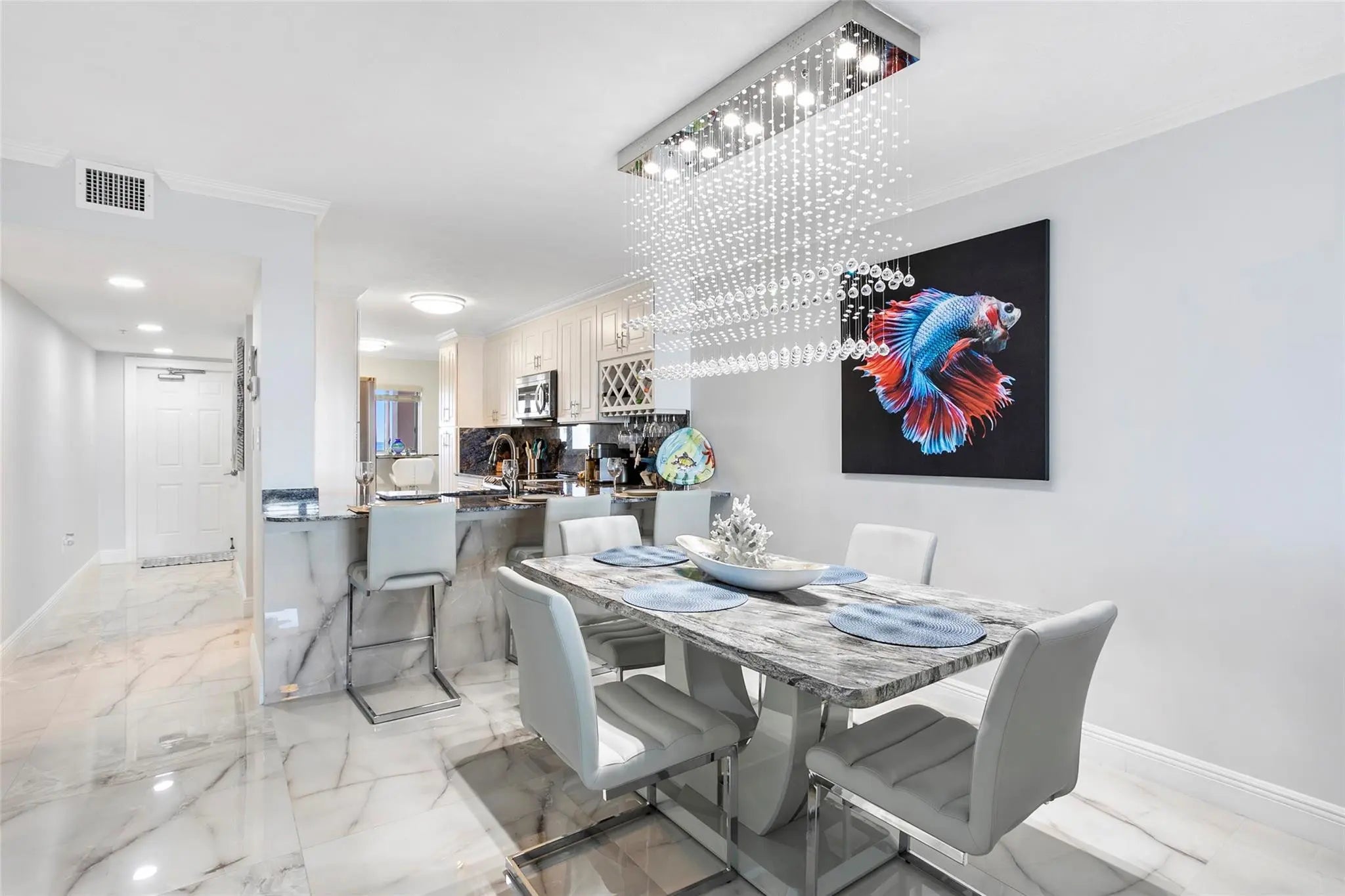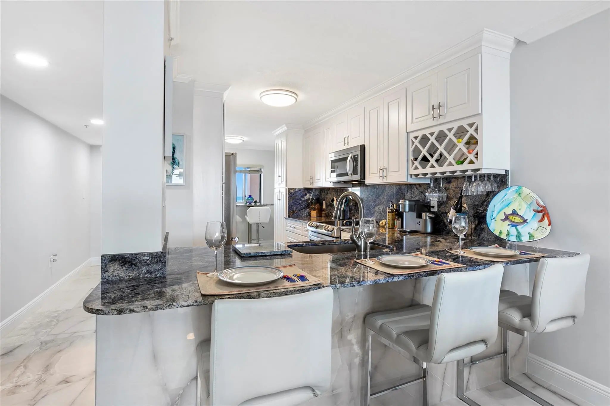 Completely remodeled turnkey FURNISHED condo with unbelievable views of the Ocean and Intracoastal. The furnishings are all upscale, a 72" TV, a breakfast nook with a table for ocean view, and a dining table with a view of the intracoastal, electric drapes in the living room, and electric seats in the couch. The master bedroom has a slider that leads out to the balcony, and 2 closets (one is a walk-in closet). There is an LG washer and dryer in the unit as well. All the comforts of home. New Pickle Ball Courts, 2 pools, and a clubhouse. The unit comes with a carport. Unit is available 5/1/2026. Water, cable, and internet are included in the rent.