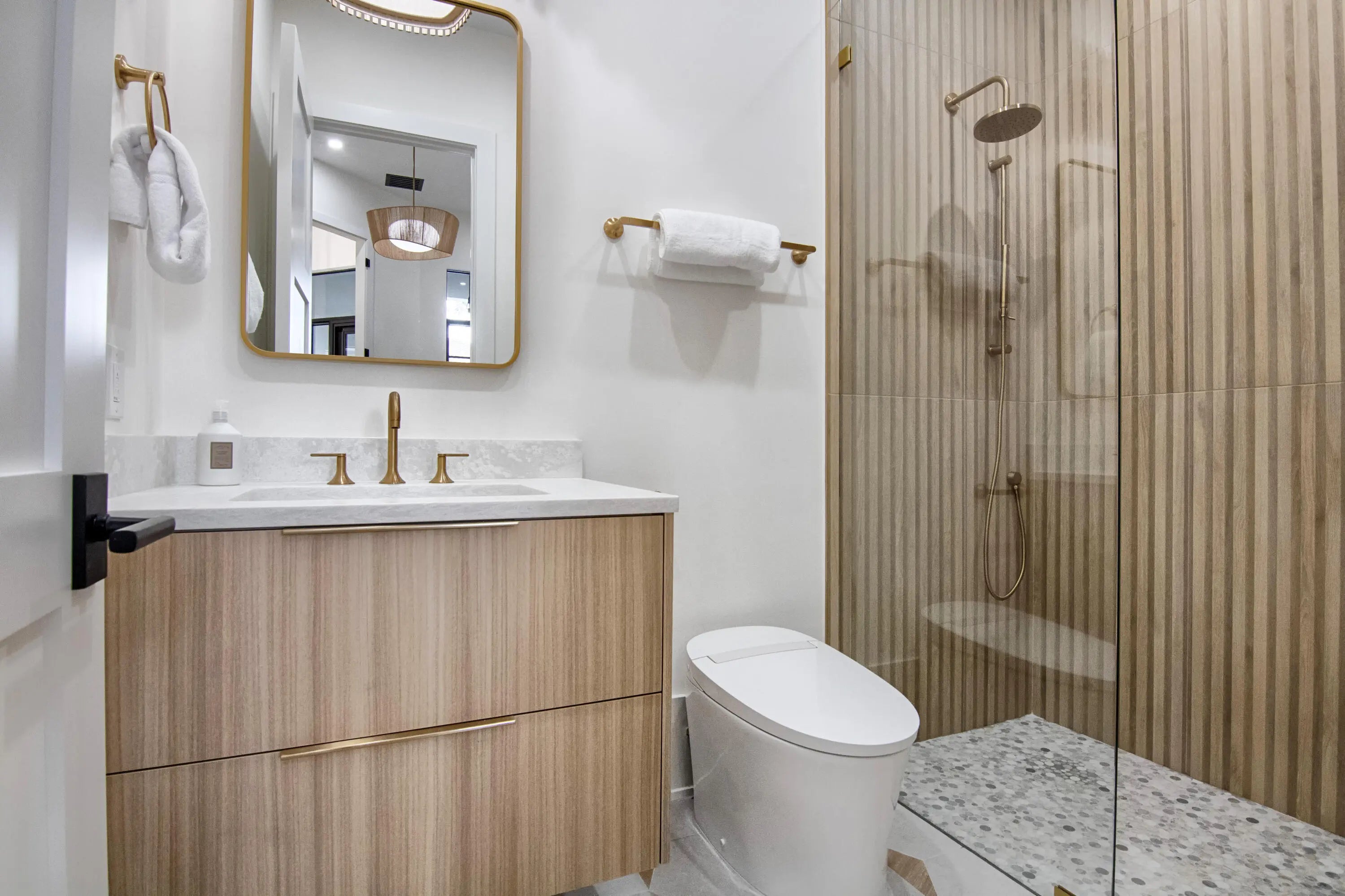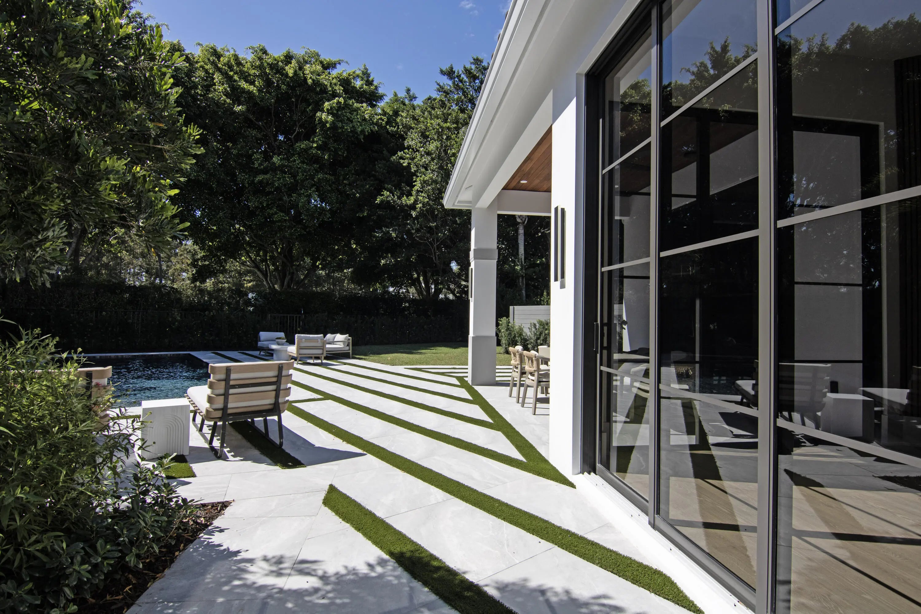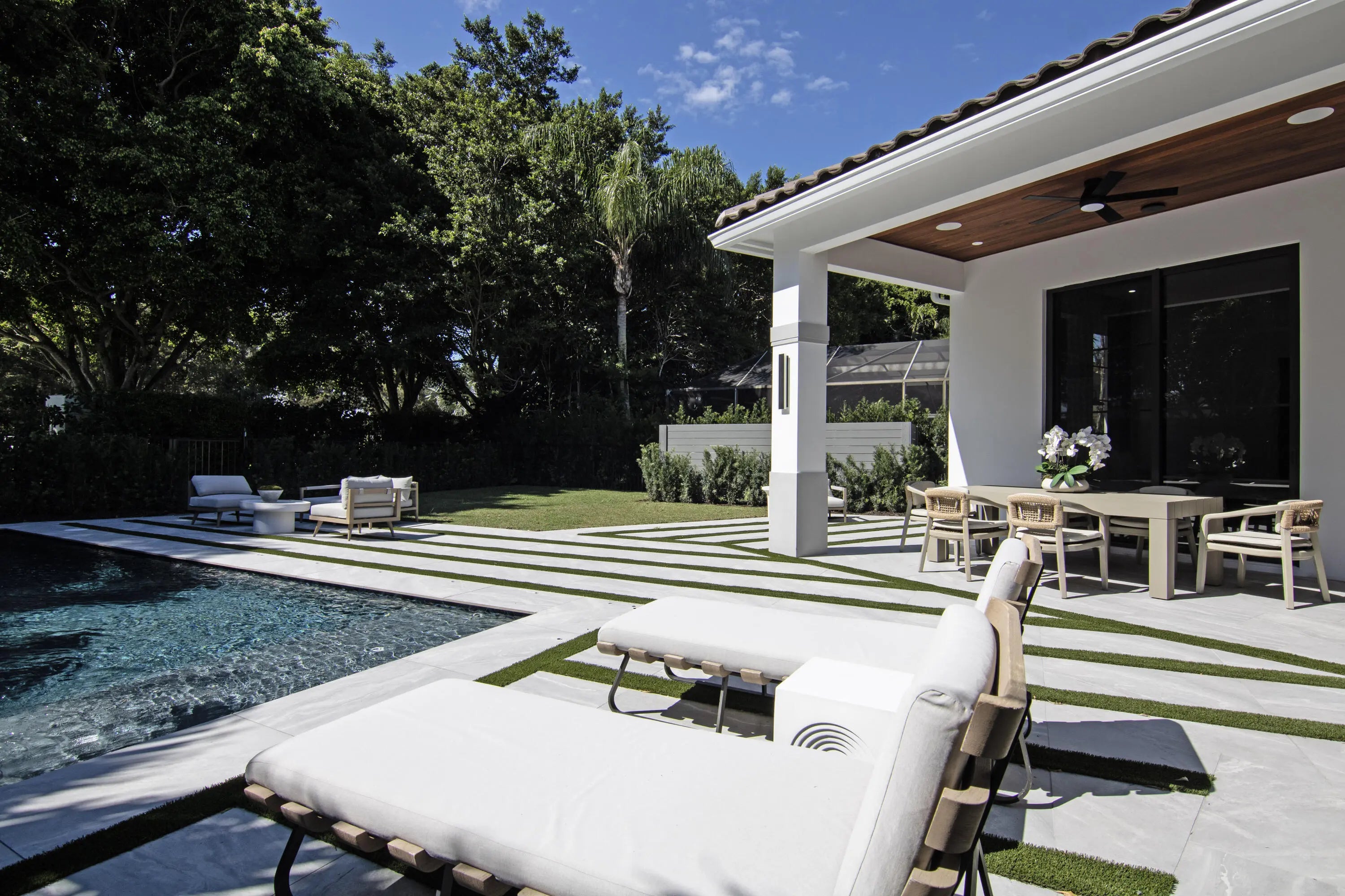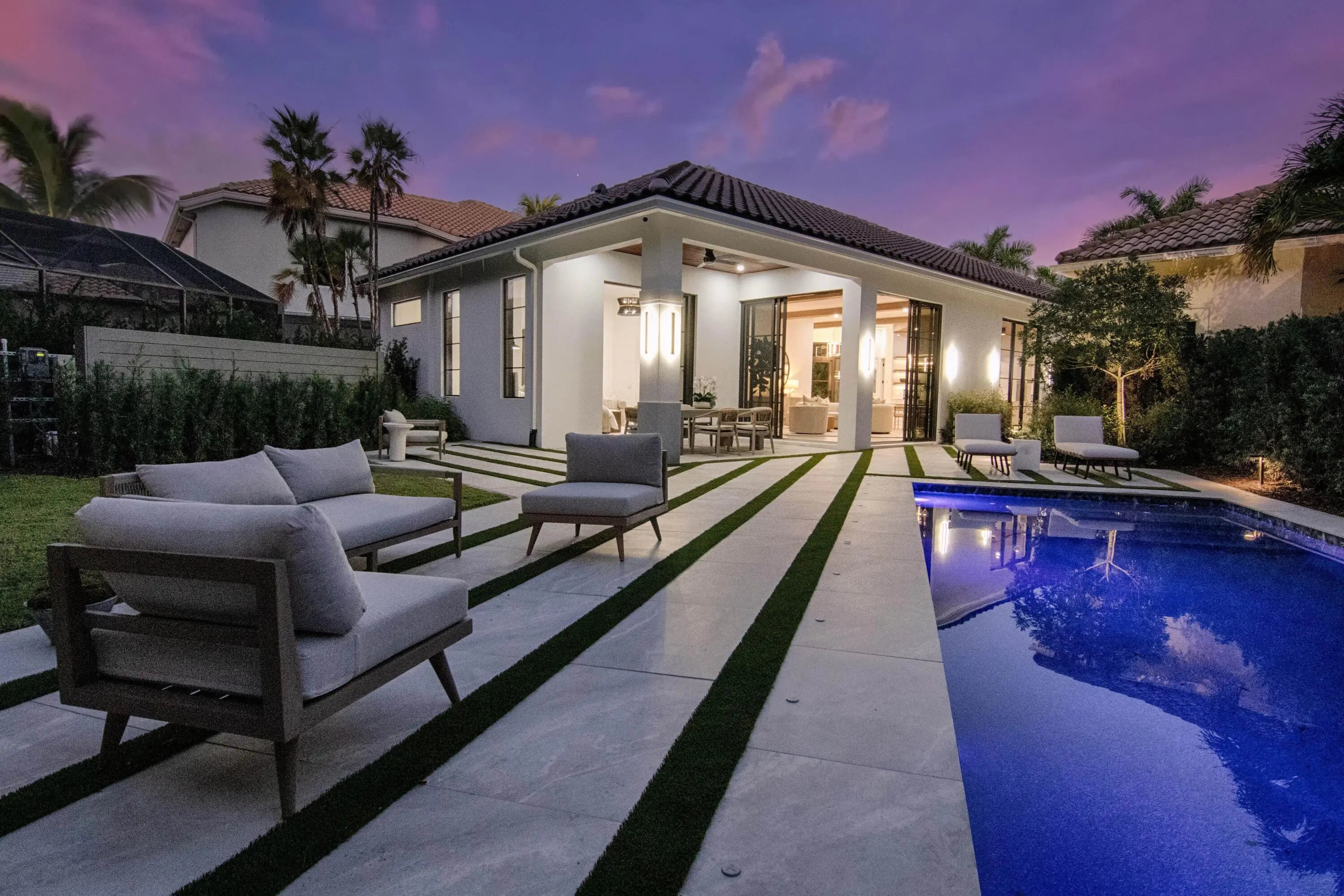 Step into this newly constructed residence that transcends the ordinary, a home where architectural artistry meets effortless livability. Every space has been curated with exquisite attention to detail, blending natural textures, timeless materials, and cutting -edge design. A show -stopping kitchen anchors the home with rich wood finishes, quartz countertops, & floating shelves framed against a soft porcelain back splash. The dramatic island with custom wood inlay invite both gathering and gourmet creation. Integrated professional grade appliances & statement lighting complete this sophisticated culinary space. Retreat to a serene primary bedroom framed by 10ft high sliding glass doors that open to private outdoor views. The ensuite bath is a true sanctuary-featuring a free standing soaking tub, dual rainfall shower, brushed gold fixtures, and geometric marble flooring that feels like art beneath your feet. The property's open concept living flows seamlessly through light-filled spaces that celebrate modern craftsmanship and understated elegance. Every finish-from the designer lighting to the wide-plank oak floors-speaks to quality, sophistication, and comfort. The stunning private backyard oasis with multiple lounge spaces, lush landscaping, sparkling rectangular swimming pool surrounded by elegant pavers with grass accents, is ideal for relaxing and entertaining. Perfectly situated in a coveted neighborhood in Palm Beach Polo. This home offers the rare balance of privacy and convenience - minutes from dining shopping and all of Wellington's world renowned equestrian venues.