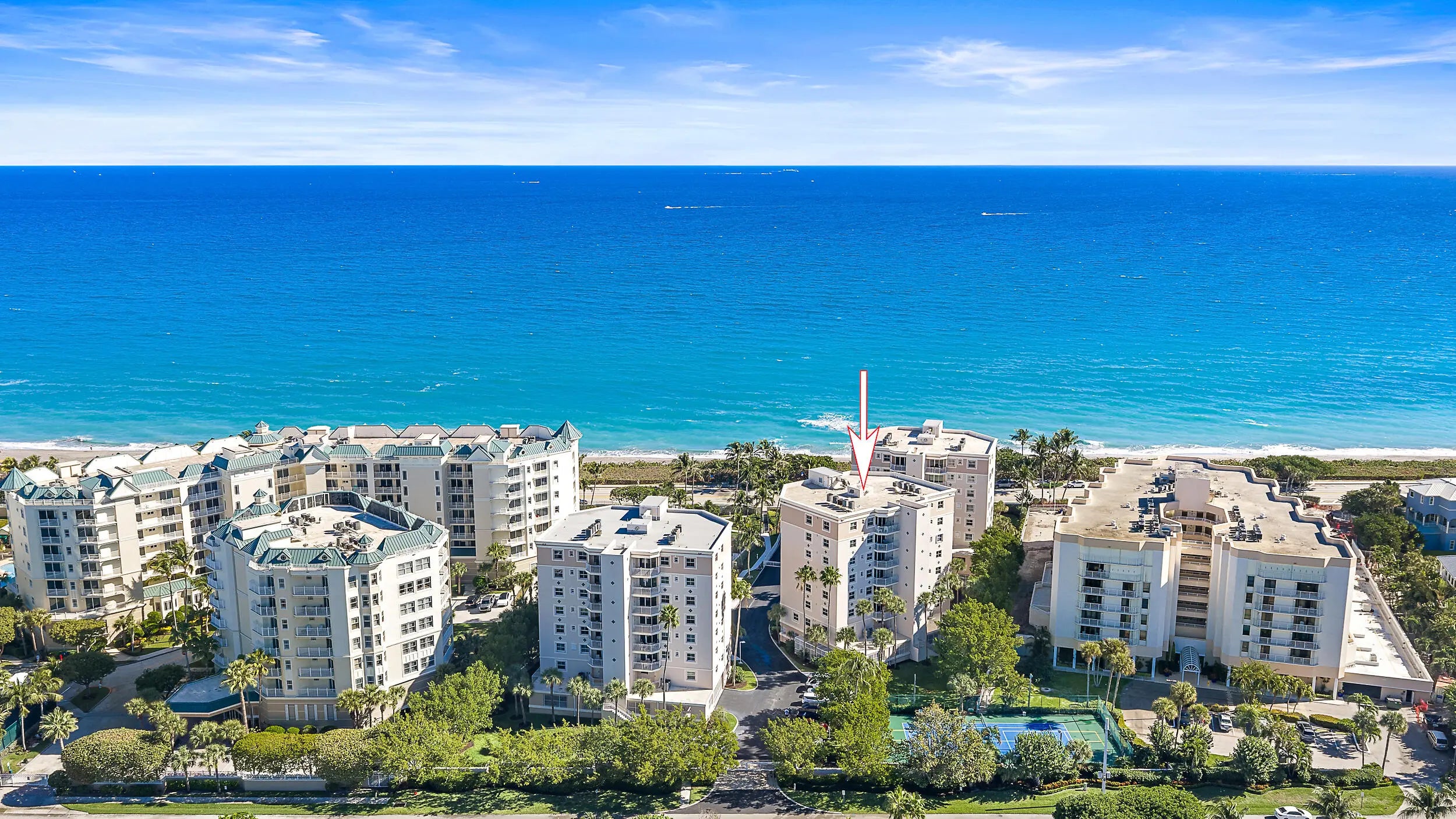 Amazing opportunity to own a rare 3 bedroom coastal condo! From the moment you enter this light, bright and airy condo you will be enthralled with the breathtaking views of the turquoise blue water of the Atlantic Ocean. You are steps from putting your toes in the sand and enjoying all that Jupiter beaches have to offer. This is a full front to back wrap unit with sunrises and sunsets, 500' of expansive balconies and new impact windows and doors that makes this condo light and bright from every room. The Primary Bedroom having a panoramic ocean view, large walk-in closet, sliding doors to balcony and luxurious bath. 2 additional guest rooms within the main living area and a RARE flex room on a lower floor. This additional space currently has a 1/2 bath which can be made into a full bath and is perfect for another guest space, office, art studio or simply extra storage. In additional there is a bonus air conditioned storage room. Jupiter by the Sea, a boutique property, offers 3 buildings, 12 units per building and 2 units per floor. This unit is located on the fourth level. Amenities, in addition to the Atlantic Ocean a few yards away include pool, clubhouse and fitness facilities and tennis court. The location is perfectly situated for shopping, dining, walking the path along the beach or relaxing on your tranquil balcony soaking in the Florida weather. The buildings have completed the Milestone Inspection, the needed work has been completed, and all assessments have been paid, Therefore no surprises for the BUYER.
