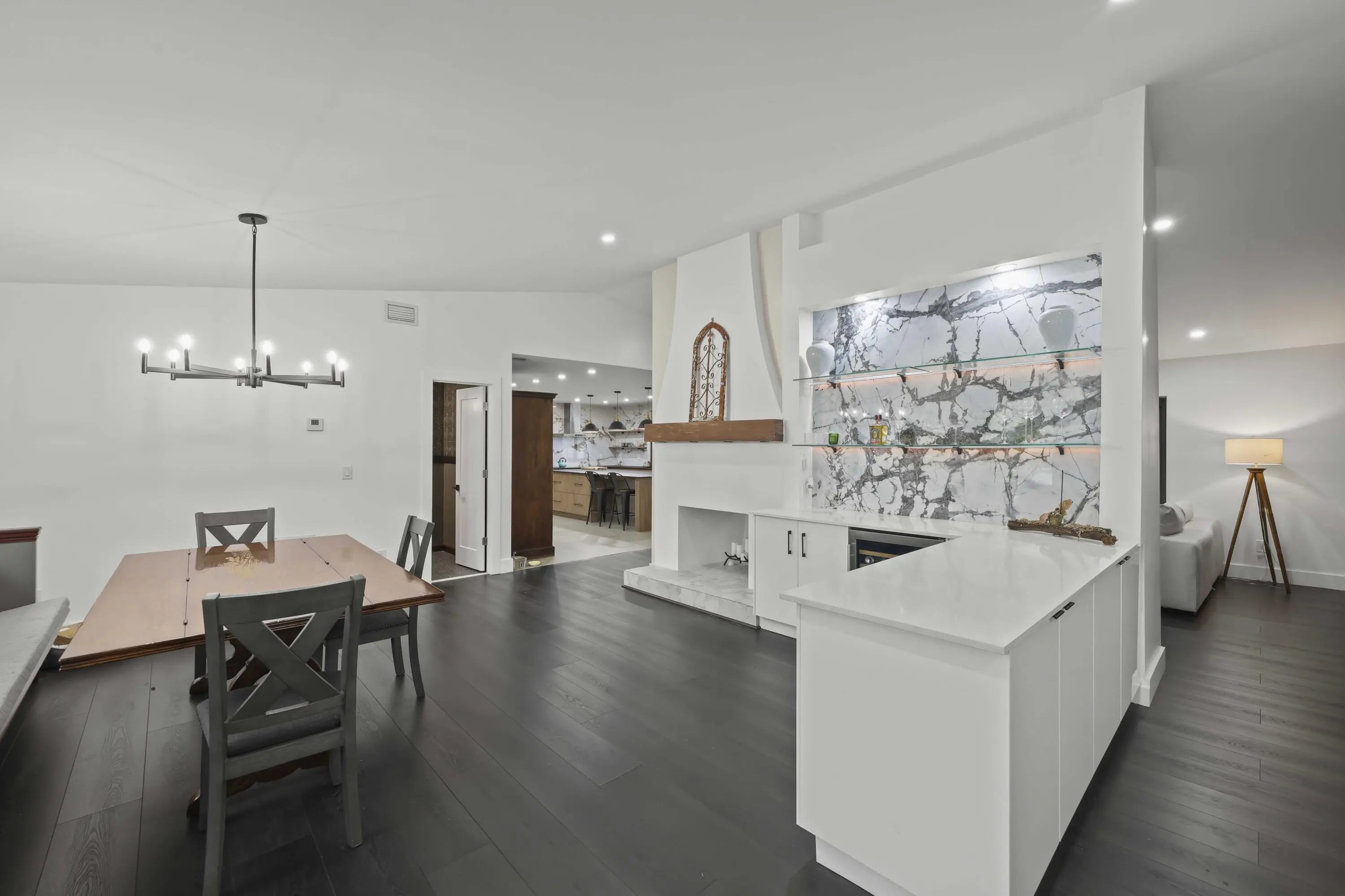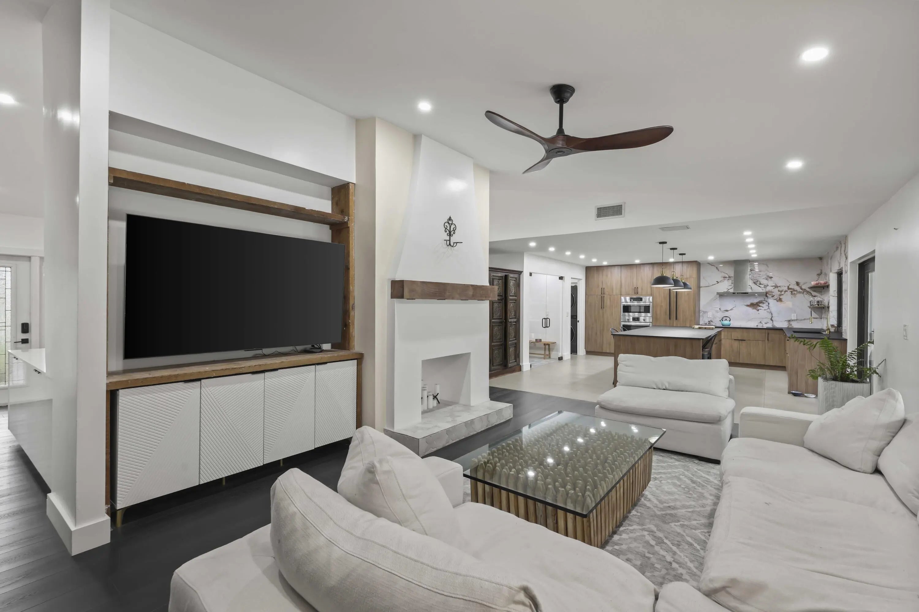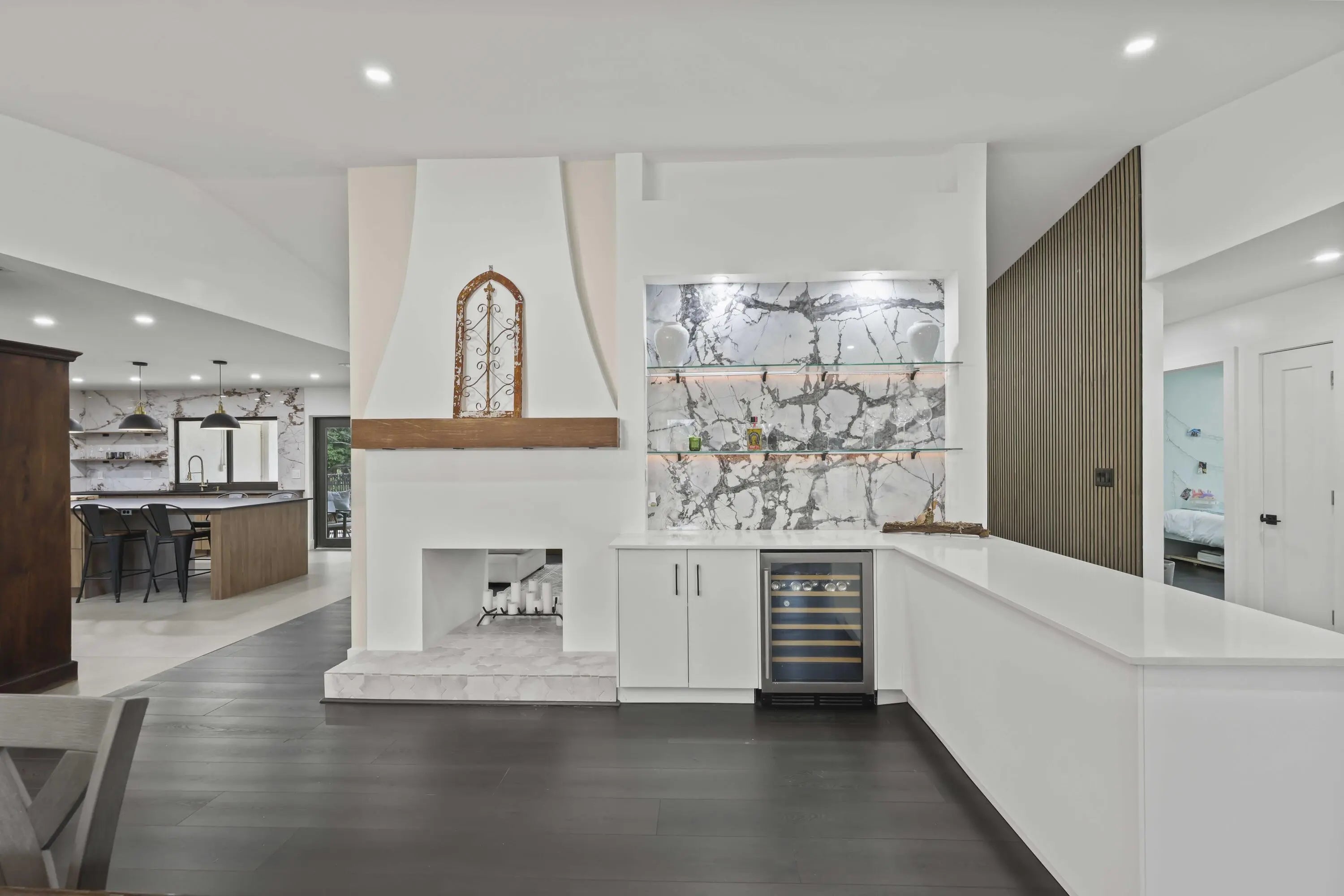 Welcome to 2708 NW 26th Circle, a fully renovated lakefront retreat tucked away in Timbercreek, one of Boca Raton's most peaceful and sought-after communities. Set on a quiet, tree-lined street just off the prestigious St. Andrews corridor, this home offers a rare combination of privacy, modern luxury, and scenic water views. Situated on an expansive 0.33-acre pie-shaped lot, the property overlooks a winding lake and features a private resort-style pool, creating a tranquil setting ideal for both everyday living and entertaining. This residence includes four bedrooms plus a glass-enclosed office, two full bathrooms, and two half baths, all thoughtfully redesigned with high-end finishes throughout. Nearly every room captures sweeping lake and pool views, filling the home with natural light and a calm, open feel. At the heart of the home is a chef's kitchen showcasing premium Bosch appliances, a 10-foot Lapitec sintered stone island that is scratch- and smudge-resistant, custom pull-out cabinetry, a Liebherr refrigerator, and seating for four, perfect for daily living and effortless entertaining. The main living area features vaulted ceilings, a wood-burning fireplace, luxury vinyl flooring, and custom wall paneling that adds warmth and architectural interest. Just off the entry, a stylish bar area with quartz countertops, porcelain backsplash, and a wine refrigerator creates a welcoming space for hosting and gathering. The primary suite is a true sanctuary with panoramic lake views, a custom walk-in closet, and a spa-inspired bathroom with floating vanities and elegant porcelain finishes. Additional highlights include a glass-enclosed home office, cabana bath for seamless indoor-outdoor living, a powder room, and a spacious laundry room with quartz countertops, a 2023 Maxx ice maker, and LG washer and dryer. Major upgrades include a 2021 roof, impact windows and doors, a 2021 HVAC system, updated electrical panel, a 2019 water heater, and a two-car garage. The beautifully landscaped backyard offers exceptional privacy, mature mango trees, and ample space to relax or entertain. Timbercreek is known for its scenic lakes, walking and biking paths, parks, basketball courts, playground, gazebo, abundant wildlife, and year-round community events, all with a low HOA and no rental restrictions. Ideally located just minutes from top-rated Boca Raton schools, pristine beaches, Town Center Mall, Mizner Park, fine dining, shopping, medical facilities, and with easy access to I-95 and the Turnpike, this home delivers an exceptional South Florida lifestyle. A rare opportunity to own a fully renovated, move-in-ready lakefront home in one of Boca Raton's most desirable neighborhoods. Schedule your private showing, this one truly must be seen to be appreciated.