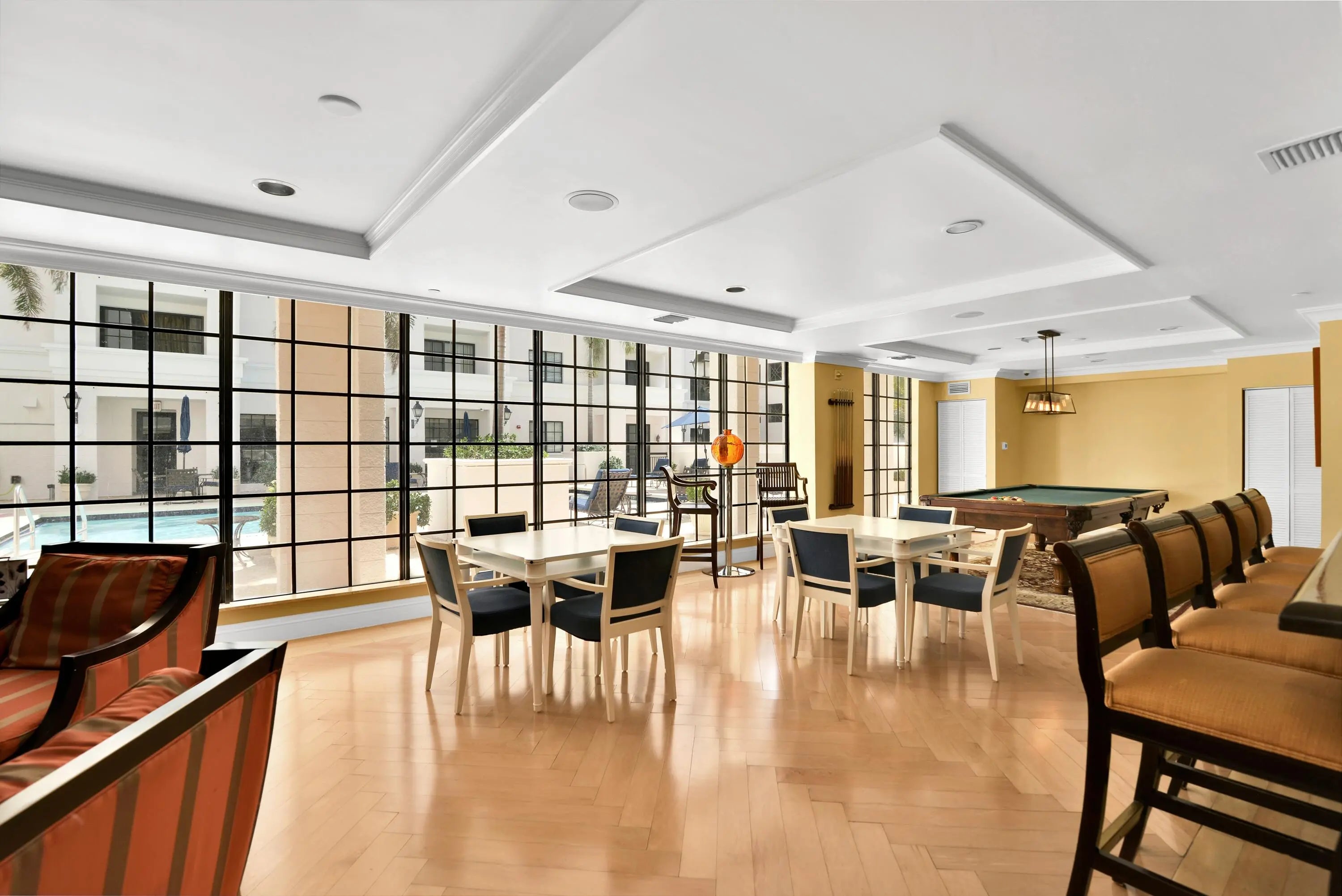 Billiard Room, Elevator(s), Fitness Center, Parking, Pool, Spa/Hot Tub, Trash Chute, Bike Storage, Business Center, Community Room, Library, Lobby