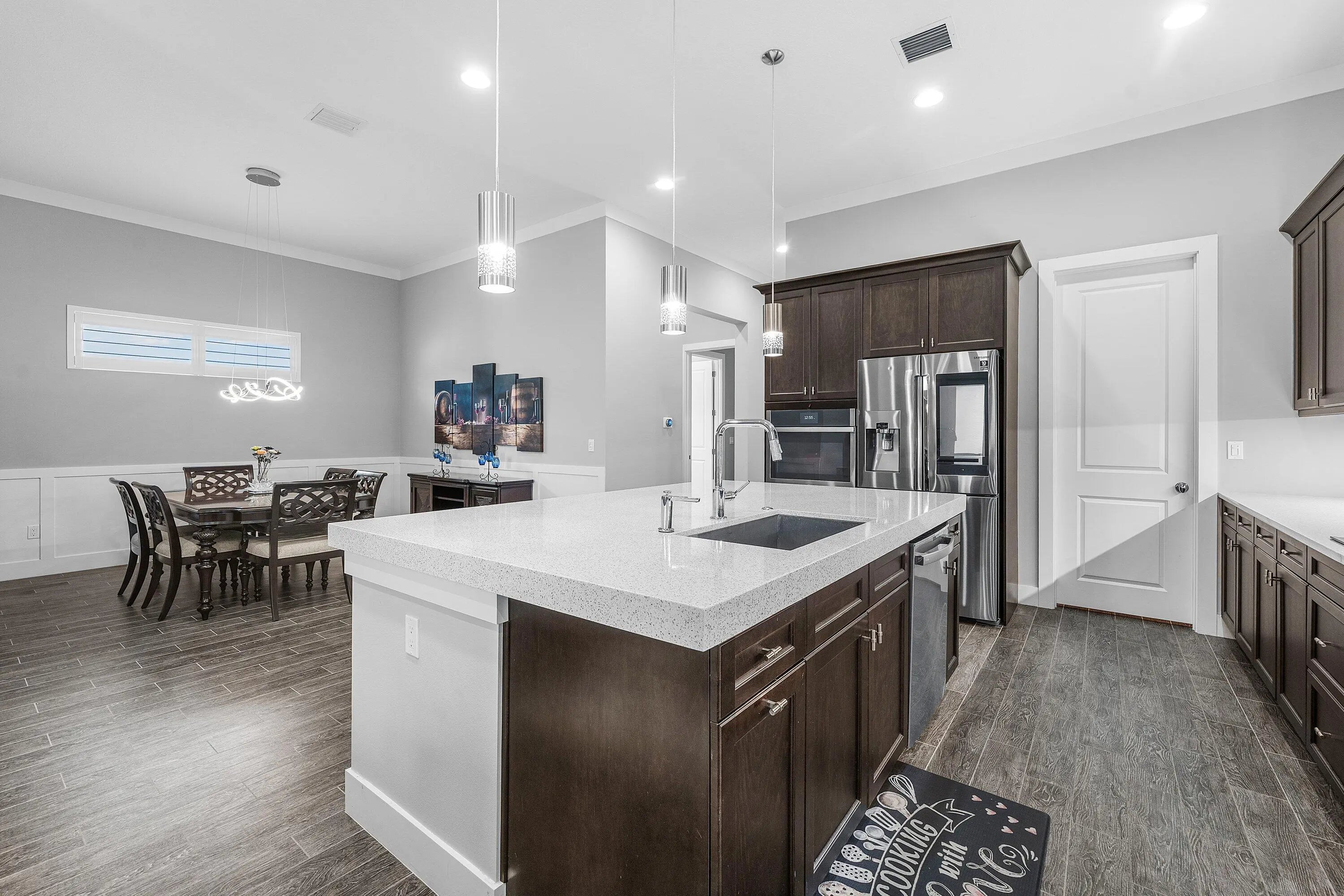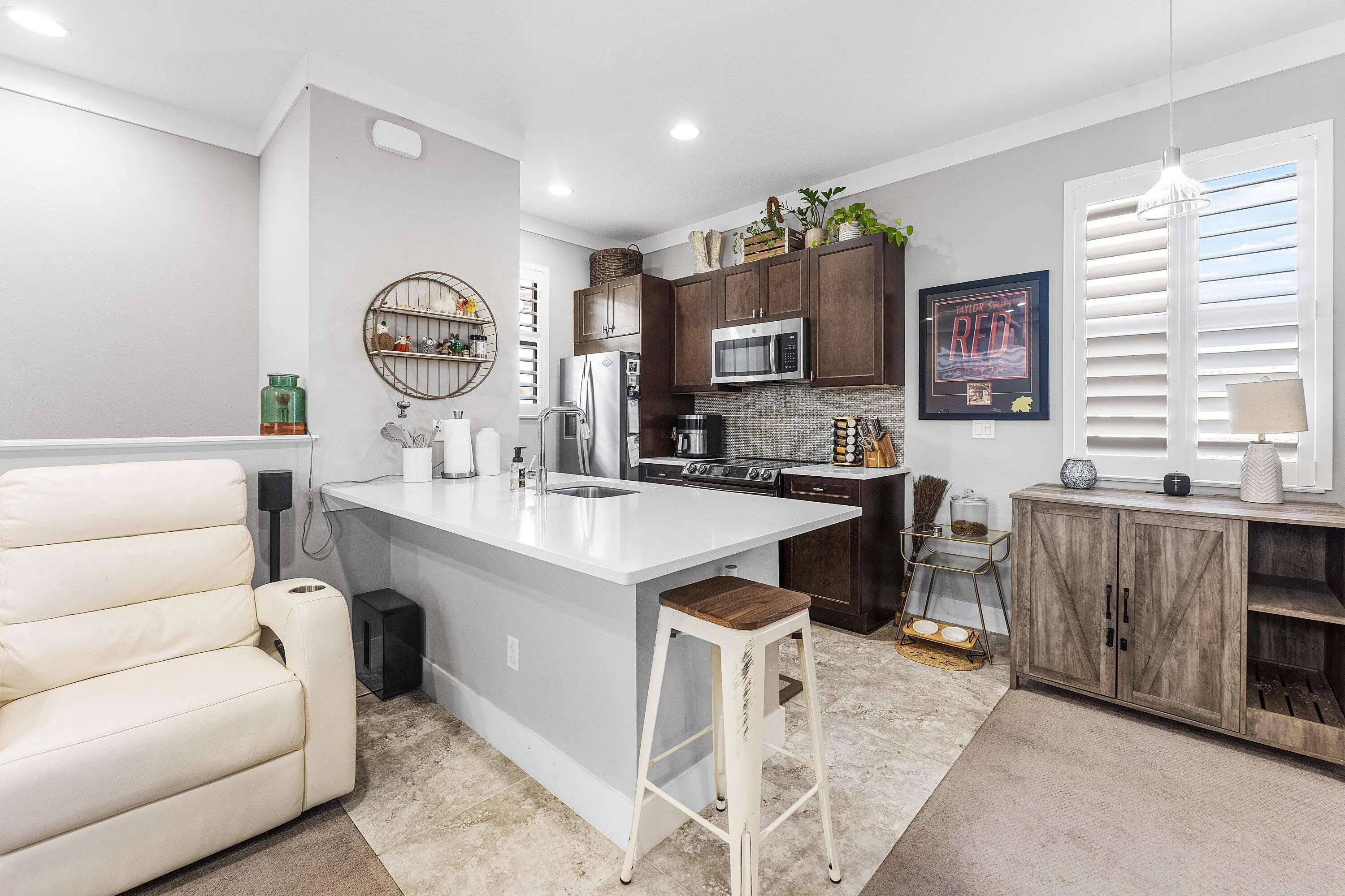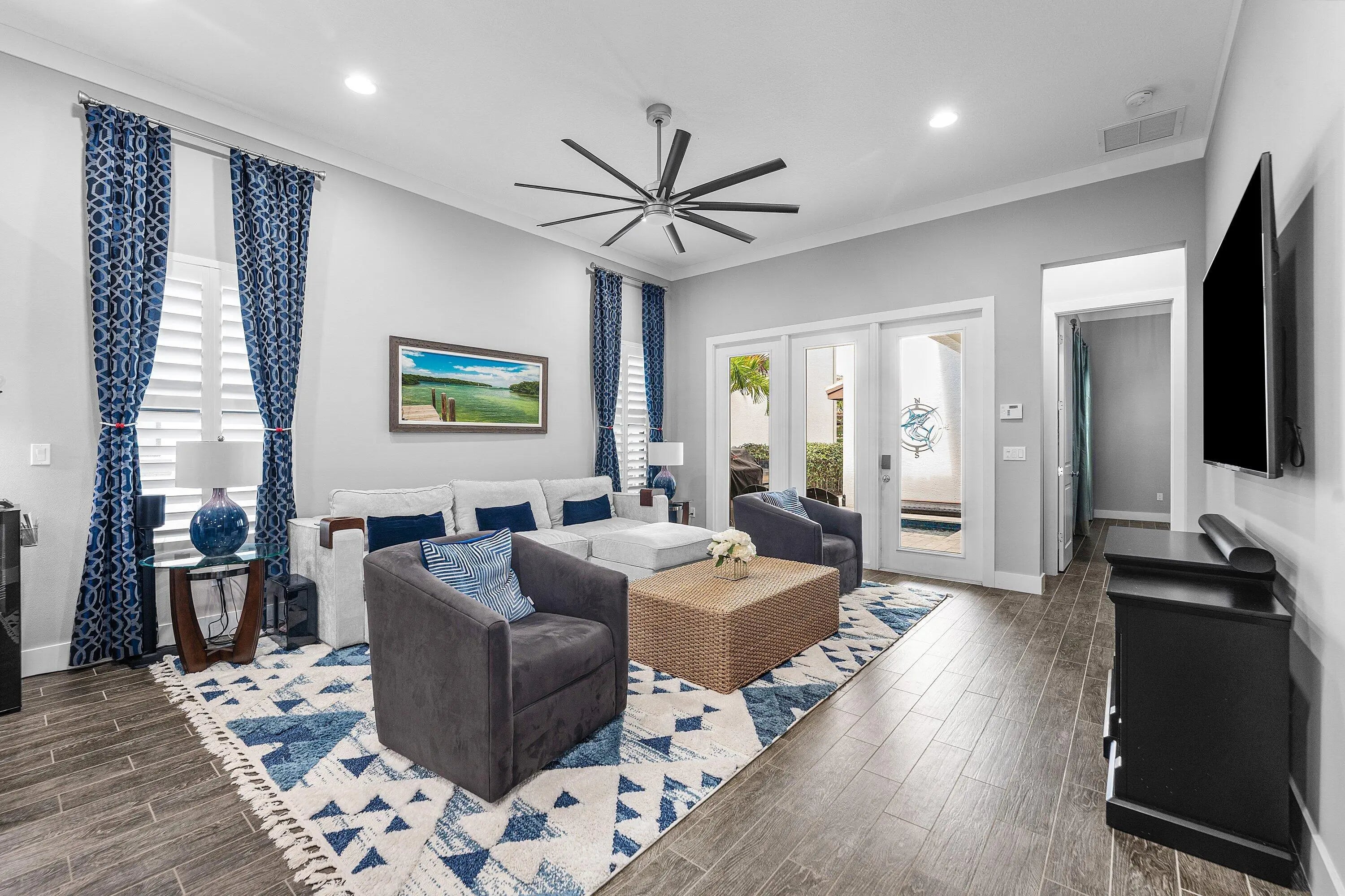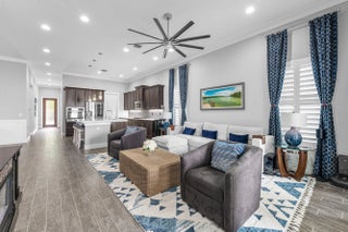 Live steps from Alton's vibrant town center and luxurious amenities in this exceptional one-level single-family home with a detached garage and private guest house, ideal for extended guests or rental income potential. The spacious great room floor plan is designed for effortless entertaining, featuring a grand chef's kitchen open to the dining and living areas. Gray wood-style porcelain tile, volume ceilings with modern fans, and recessed lighting create a bright, airy feel throughout. The kitchen is beautifully appointed with GE Profile appliances including a smart touch-screen refrigerator, tall espresso cabinetry with crown molding and under-cabinet lighting, a glass-tile backsplash, and white quartz countertops. The main home offers two en-suite bedrooms plus a versatile den,... More: ideal for a home office or flex space. Each bedroom includes custom California Closets, plantation shutters, crown molding, and ceiling fans. A well-equipped laundry room features abundant cabinetry, a laundry sink, and an XL GE washer and gas dryer. Step outside to your private backyard retreat with covered and open paver patios, a heated in-ground jacuzzi with cedar cover, summer kitchen with bar seating, and outdoor shower, perfect for year-round enjoyment. Above the detached 2.5-car garage, the 540-square-foot casita offers a private entrance, living area, full kitchen, stacked washer and dryer, bedroom, and full bath. The garage is outfitted with pebble-tek flooring, built-in storage and workspace, EV charger, full-size refrigerator, and a cabana half bath. Additional upgrades include whole-house surge protection, whole-home water filtration, smart locks, and a three-car paver driveway.Enjoy a prime walkable location near restaurants, Publix, and shops. Residents of Alton enjoy resort-style amenities including a luxury pool, clubhouse, fitness center, tennis and pickleball courts, playground, dog park, and walking trails, all just minutes from beaches, golf courses, marinas, Roger Dean Stadium, and Palm Beach International Airport. A rare opportunity to own a home that blends style, flexibility, and exceptional lifestyle appeal. Furniture Negotiable.