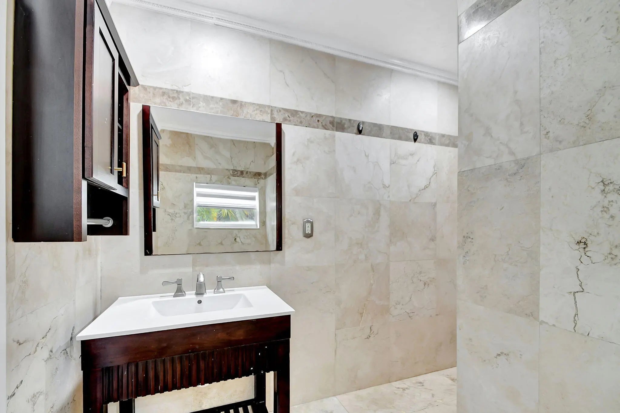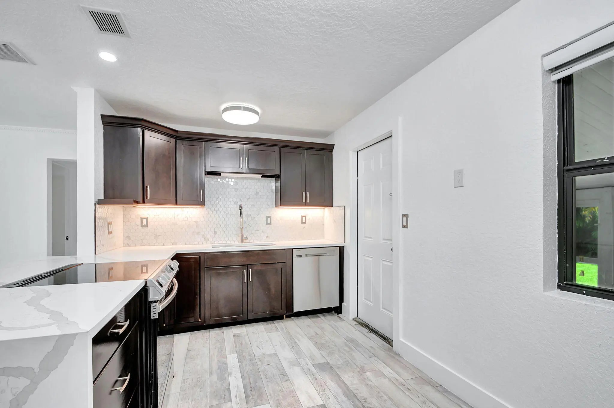 Located minutes to Downtown West Palm Beach, This Turnkey Home is Ideally positioned on an Expansive Corner Lot adorned with mature landscaping and spacious 180-degree driveway. Step inside to find an inviting open-concept layout seamlessly connecting the kitchen, dining, and family room areas. The kitchen is adorned with Calcutta Quartz Countertops and Modern Appliances, creating an ideal setting for culinary creations and gatherings. This thoughtfully designed home boasts a Split-Bedroom floor-plan featuring two en-suites alongside an additional bedroom and bathroom. Outside, a screened-in patio offers a tranquil retreat overlooking the expansive backyard, complete with a sizable pool, lush green spaces, and an outdoor showera''an entertainer's dream.Recent updates include a new
