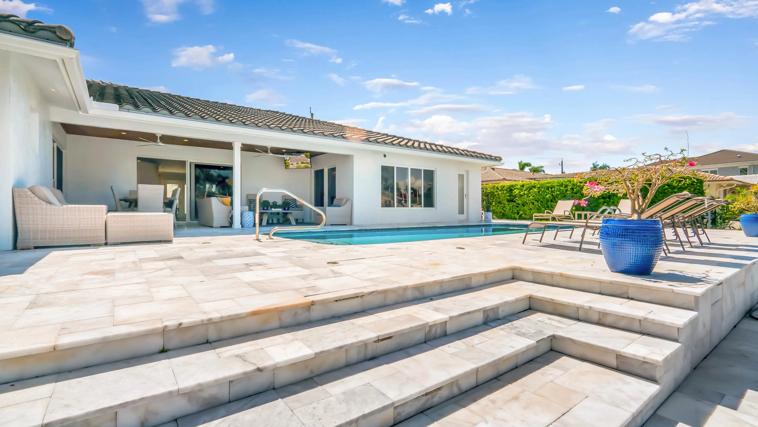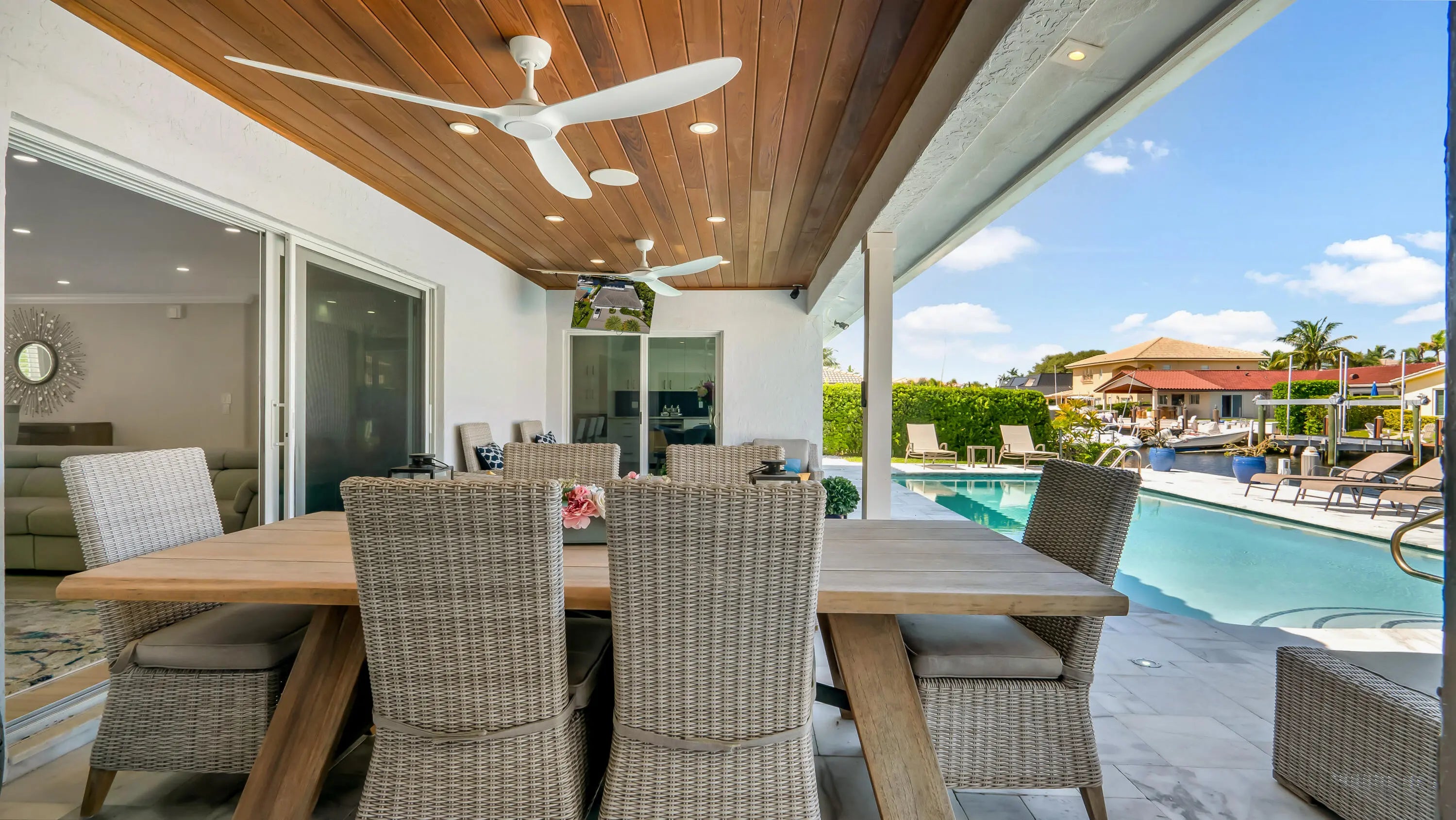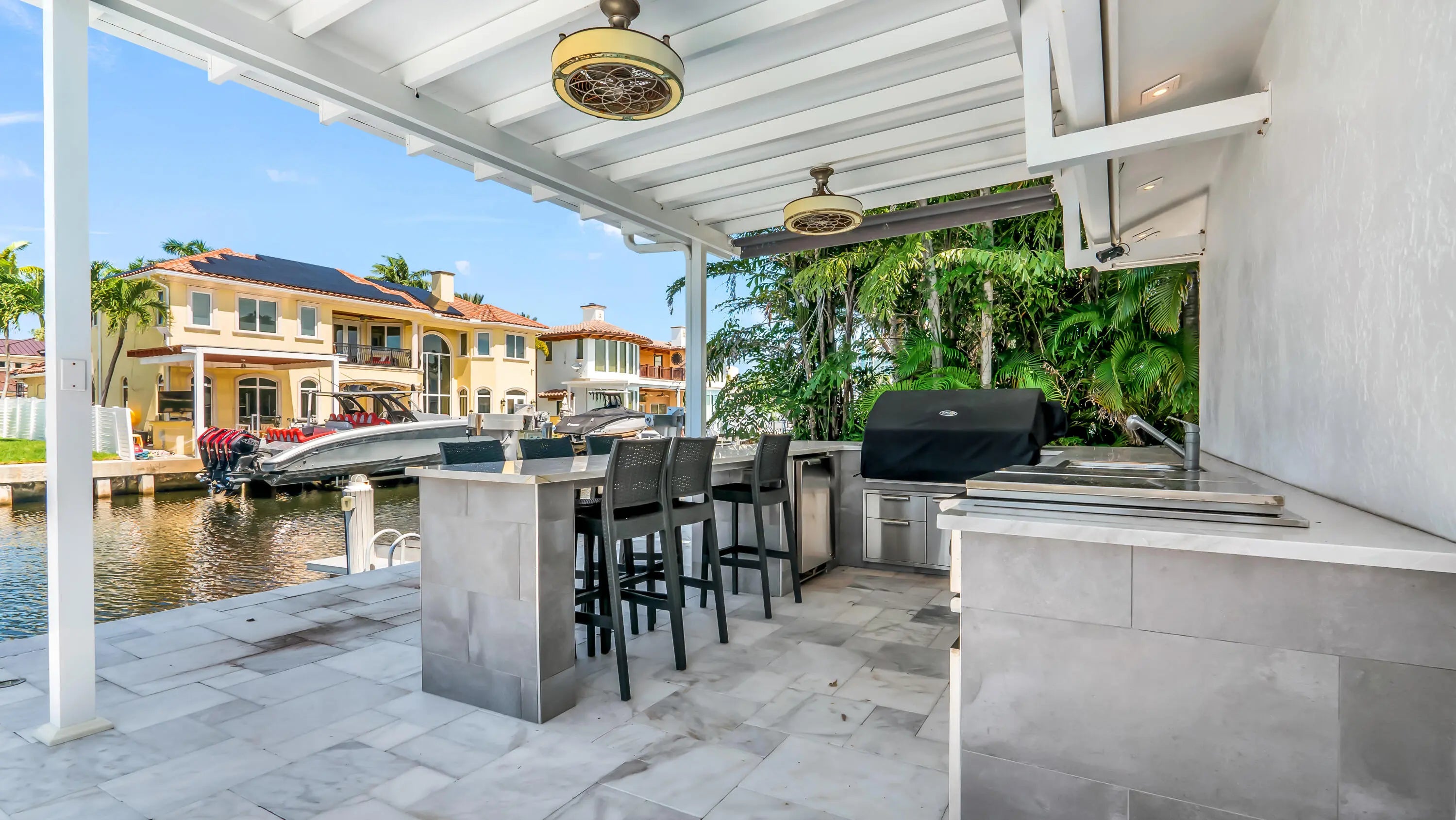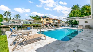 Move in ready! Available for short term (May-December 1) Waterfront large new dock bring your yacht! This 4 bed/2.5 bath fully furnished turnkey oasis is a perfect place to call home. Complete modern renovation decorated with all premium finishes. Resort style backyard w/85ft of deep water frontage!Enjoy ultimate South Florida lux living with a spectacular pool summer kitchen inc. built-in gas grill, burners/griddle, sink, 2 refrigerators, granite bar top with seating,& electric sun screens.Custom wood gourmet kitchen w/marble countertops, top of the line app, gas range w/pot filler. XLmaster suite with walk in closet. New roof, impact glass, whole house generator, electrical panel, tankless water heater, A/C. Showroom tiled 2 car garage w/extra refrigerator and extra storage.