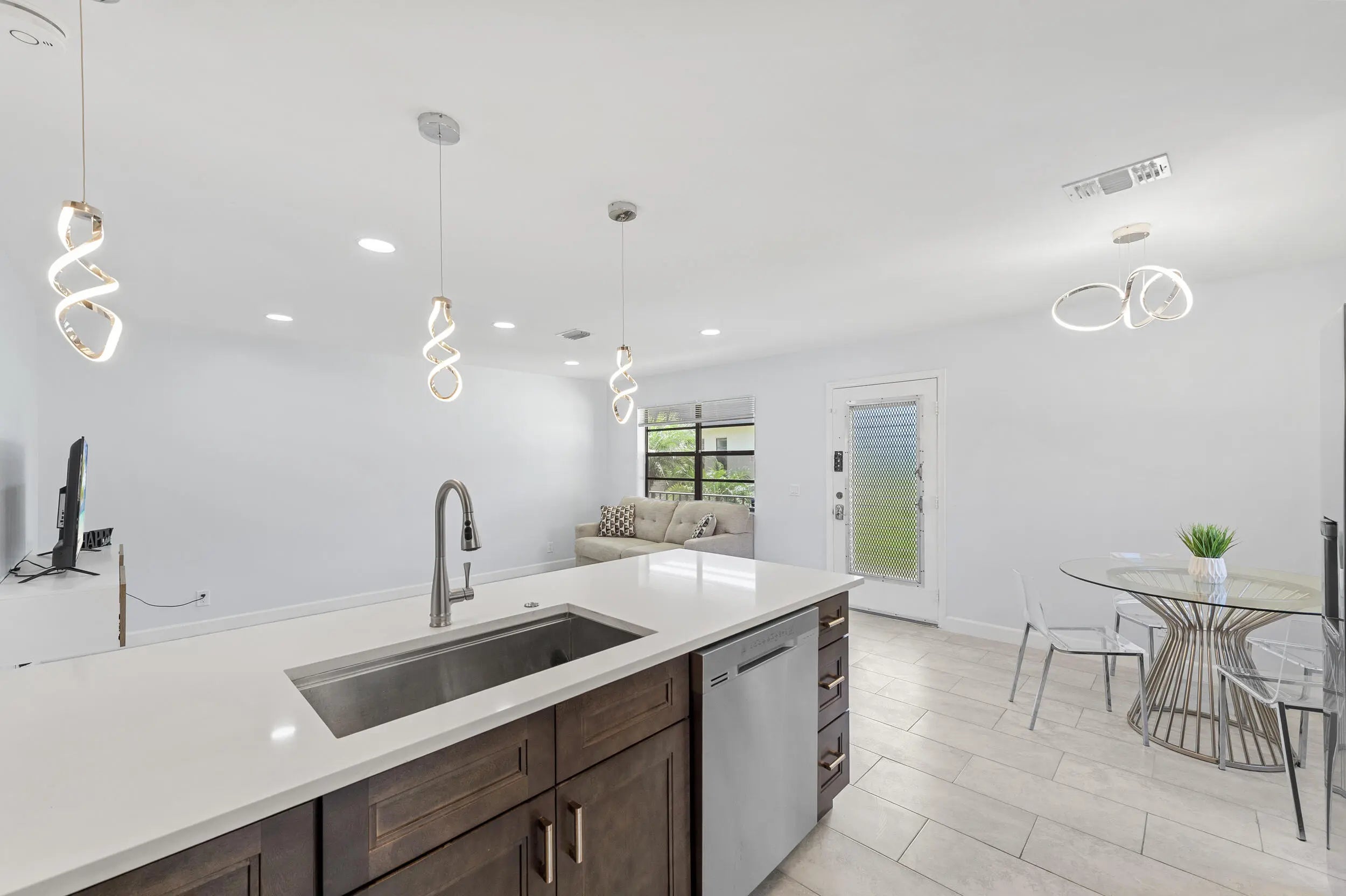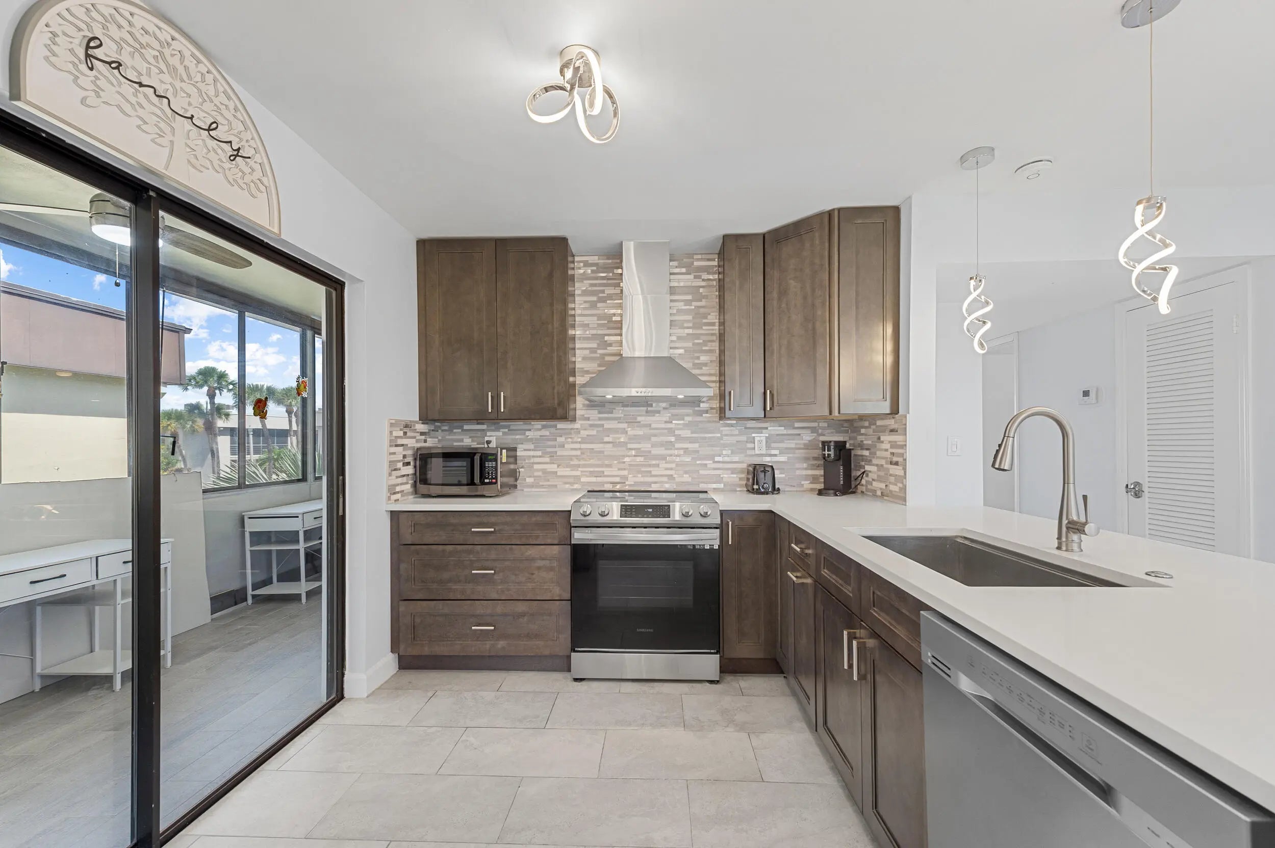 Welcome to this stunningly renovated 2 bed, 2 bath condo in the highly desirable Isle of Capri within the 55+ Kings Point Golf & Country Club. Located on the second floor with elevator access, this deluxe model features a spacious open-concept layout with a gourmet kitchen showcasing rich wooden cabinetry, quartz countertops, top-of-the-line stainless steel appliances, a designer hood, and a stylish tile backsplash. The living space offers beautiful ceramic tile flooring throughout, freshly painted walls, no popcorn ceilings, recessed lighting, and designer fixtures. The enclosed patio--accessible from both the kitchen and master bedroom--adds the perfect touch of indoor-outdoor living. The primary suite boasts an en suite bath, a huge walk-in closet with custom shelving, and a luxurious,