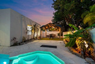 Just 10 minutes from the beach, this sleek 4BD/3BA home blends modern design with coastal charm. With many high-end upgrades including impact windows and soaring 9-ft ceilings in the primary suite. The open-concept kitchen impresses with quartz counters, a statement island, and custom cabinetry. Spa-inspired baths feature floating vanities, LED mirrors, and a luxurious soaking tub. Outside, unwind by the heated pool, host under the covered gazebo with built-in BBQ, or relax by the electric fireplace. The 4th bedroom flexes perfectly as a home office or den.